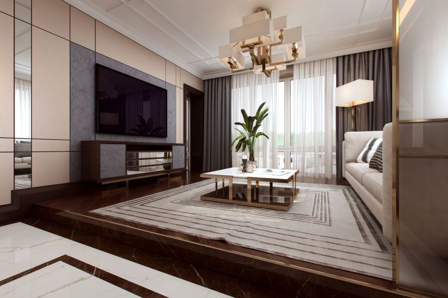 Место отдыха приподнято на невысокий подиум, что помогает органично оформить границу напольных материалов – мрамор из кухонной зоны переходит в такой же по тональности паркет гостиной. Дополнительное средство зонирования общей площади – матовая стеклянная перегородка, установленная на ширину дивана и украшенная золотистым декором.
