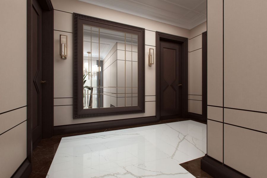 Отделочные решения строятся на характерном для современного стиля контрастном цветовом сочетании белого и темно-коричневого. Смягчающим полутоном выступает нейтральный бежевый.