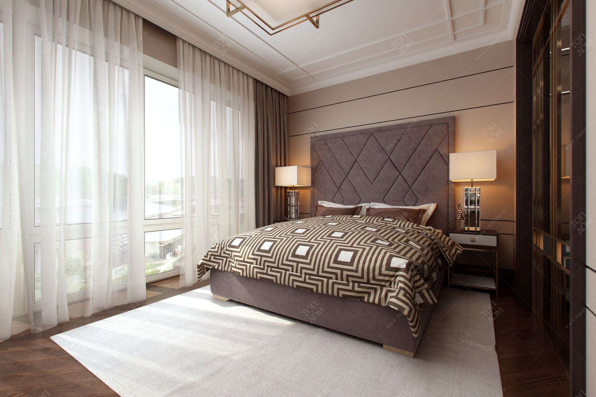 Обстановка спальни лаконична и выдержана в спокойной серо-коричневой гамме. Текстильное убранство сочетает однотонные шторы на панорамном окне и ковер без узора. Зато постельное белье может взять на себя роль фокусного декоративного элемента.