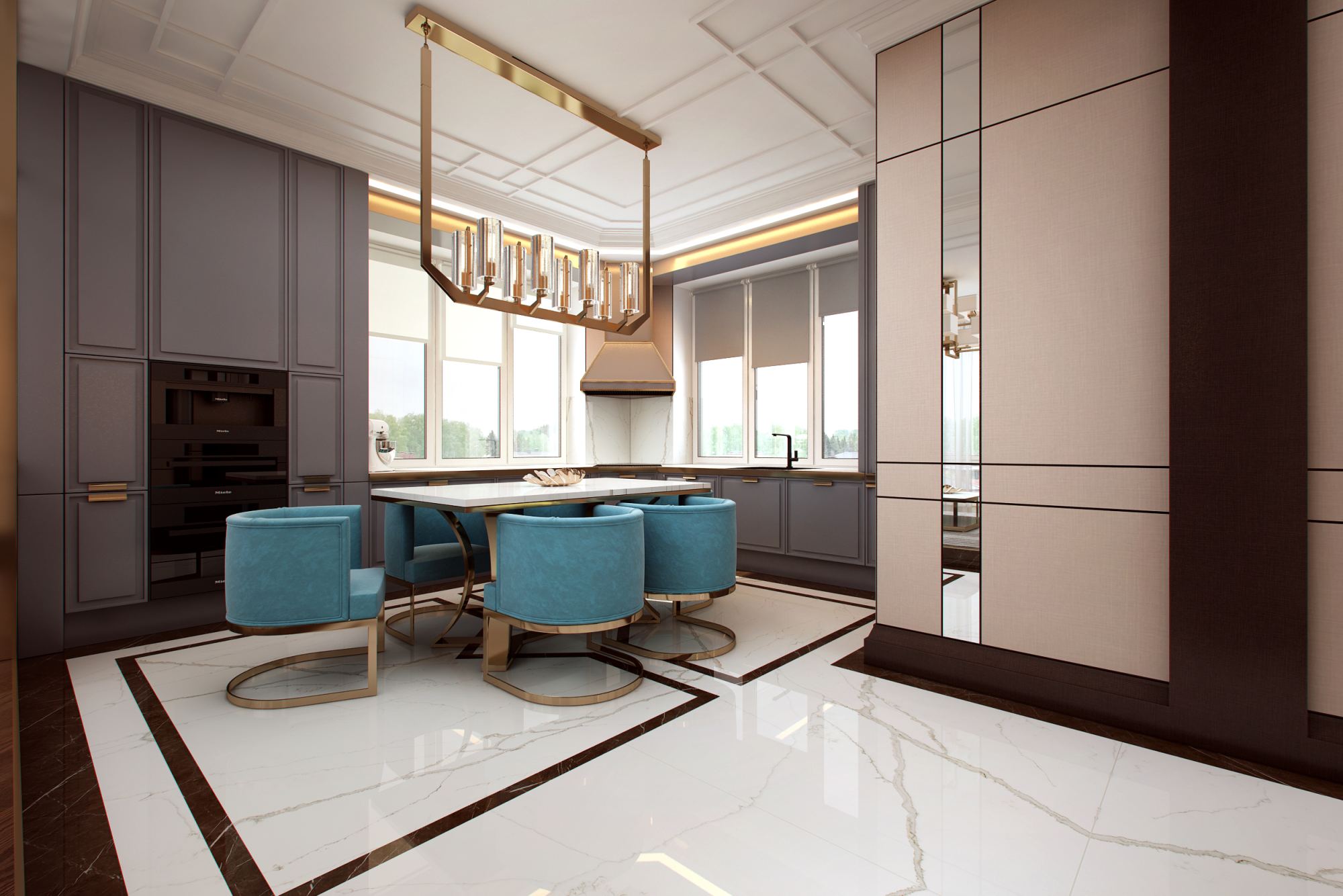Глухие темно-серые фасады встроенных шкафов работают нейтральным цветовым компаньоном для мягкого бирюзового акцента в виде кресел обеденной группы. Тонко рассчитанный элемент роскоши, не нарушающий идею строгой обстановки, – золотой цвет ножек кресел, подстолья, модного подвесного светильника, ручек на шкафах и потолочной подсветки.