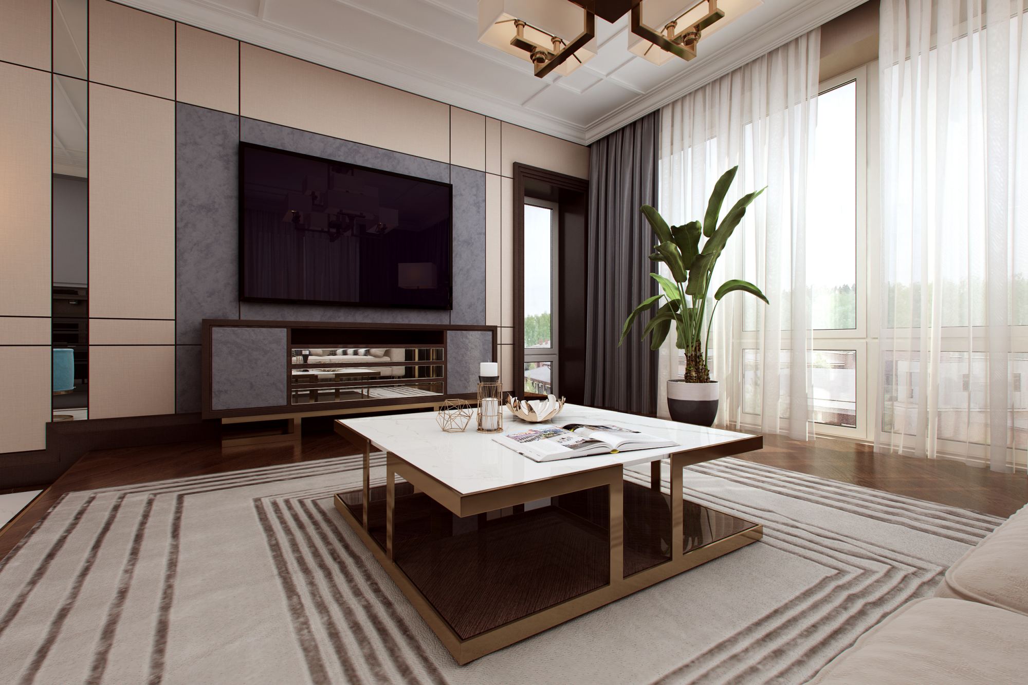 Медиа-зона выделена темно-серыми стеновыми панелями, которые красиво комбинируются с более светлой бежевой отделкой. Такой же насыщенный оттенок присутствует в декоре тумбы. Лейтмотивом оформления гостиной таунхауса проходит четкий геометризм: