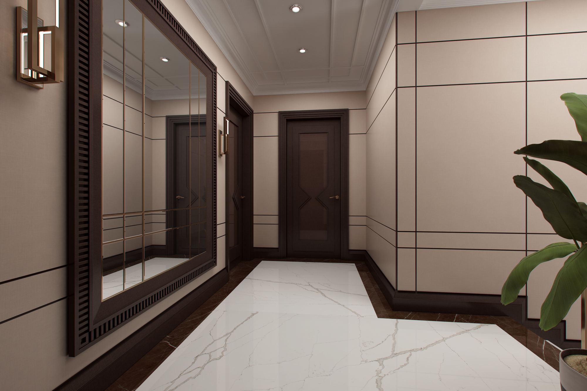 Отделочные решения строятся на характерном для современного стиля контрастном цветовом сочетании белого и темно-коричневого. Смягчающим полутоном выступает нейтральный бежевый.
