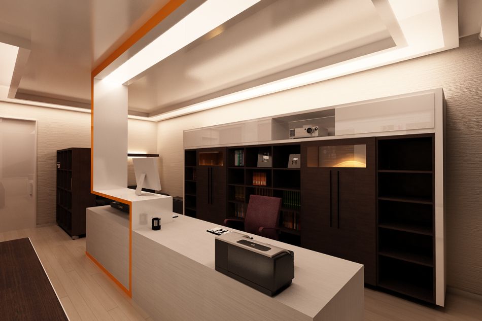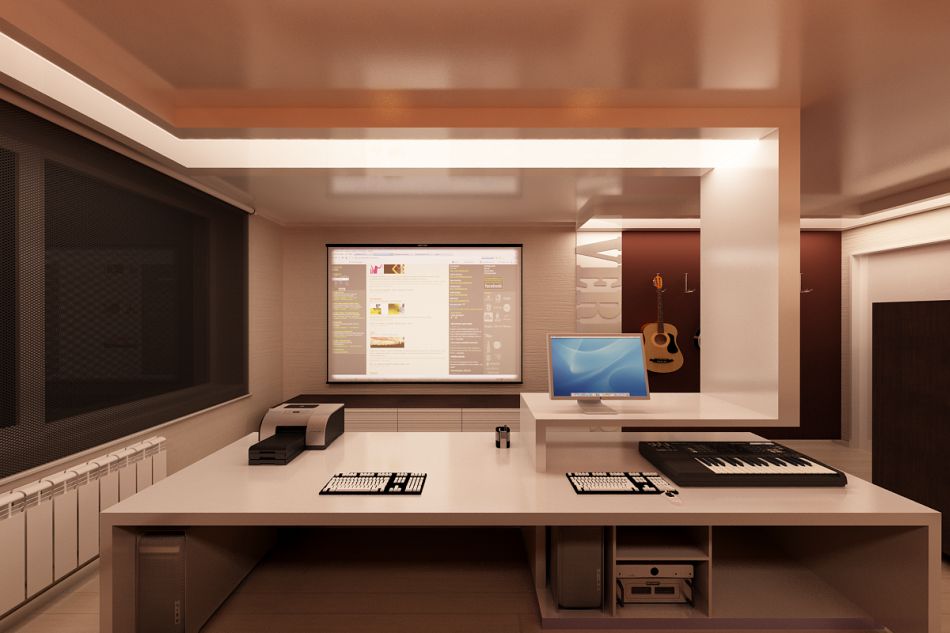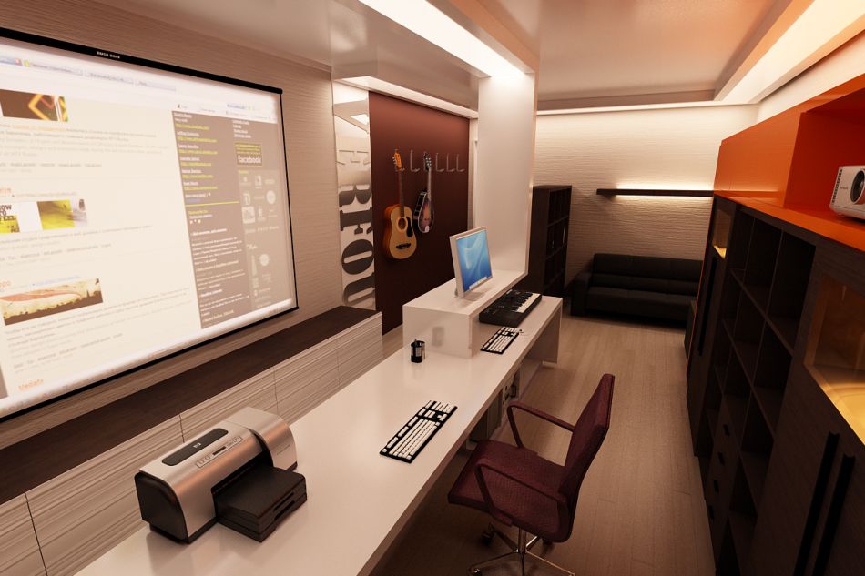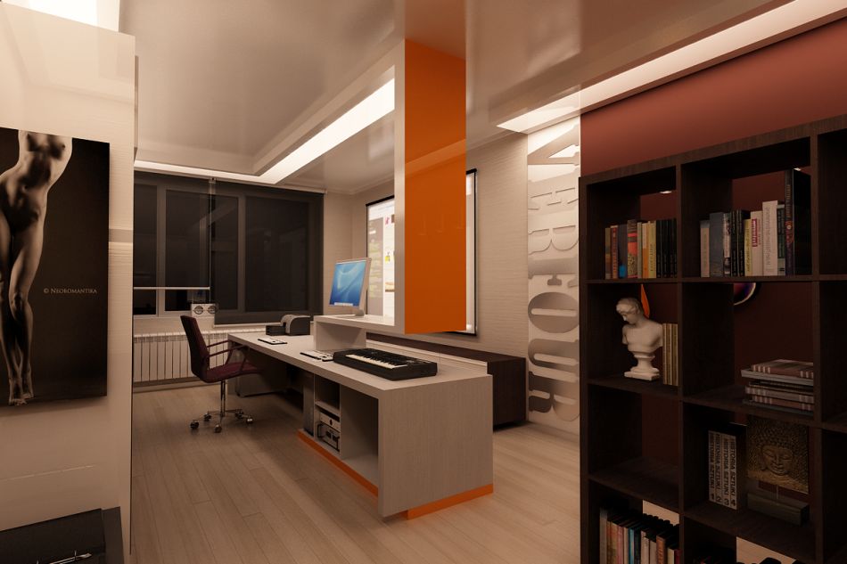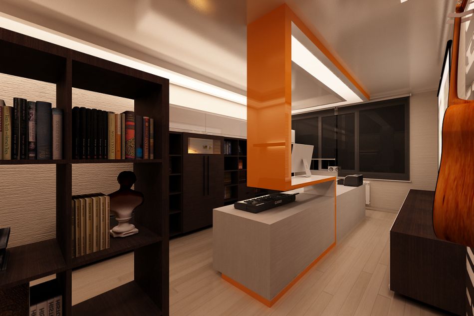 Отдельную комнату занимает кабинет-студия. Помещение зонируется оригинальной перегородкой, выполняющей роль рабочего стола и одновременно – потолочной конструкции. Доминирующая коричнево-бежевая гамма разбавлена здесь яркими оранжевыми вставками.