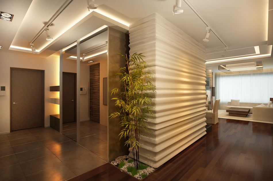 В холле привлекает внимание отделка, имитирующая складки, и фотопанно с живыми цветами как продолжением сюжета. Освещение здесь решено по принципу струнной системы: светильники можно свободно перемещать вдоль направляющих, меняя ориентацию светового потока.