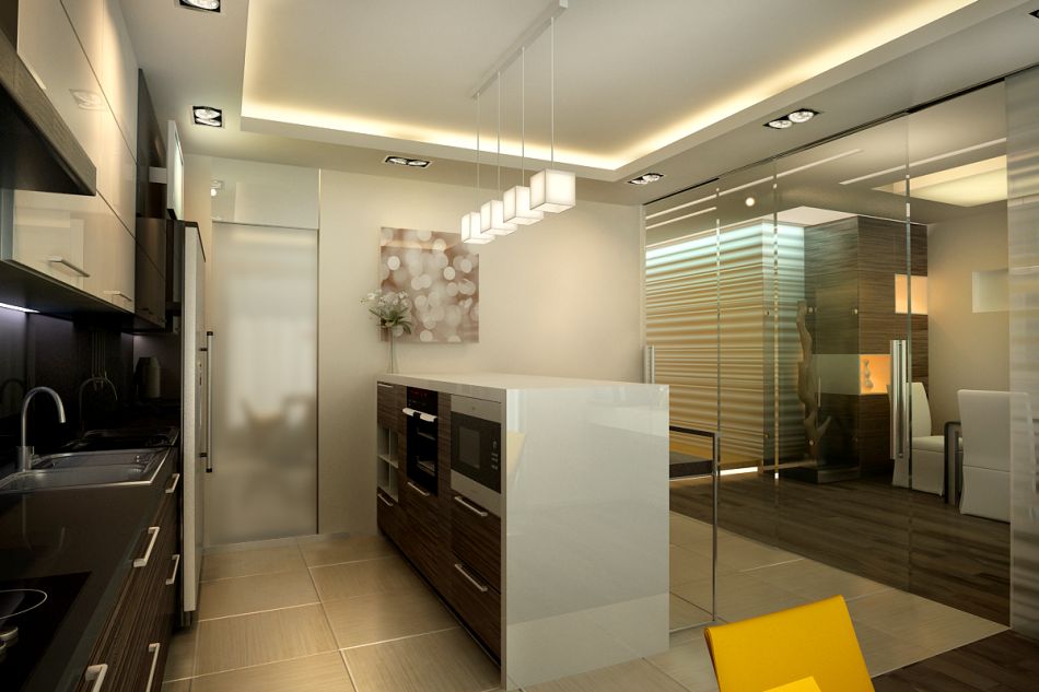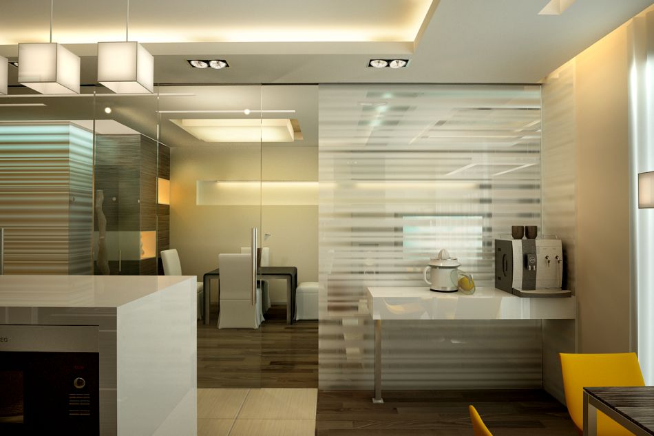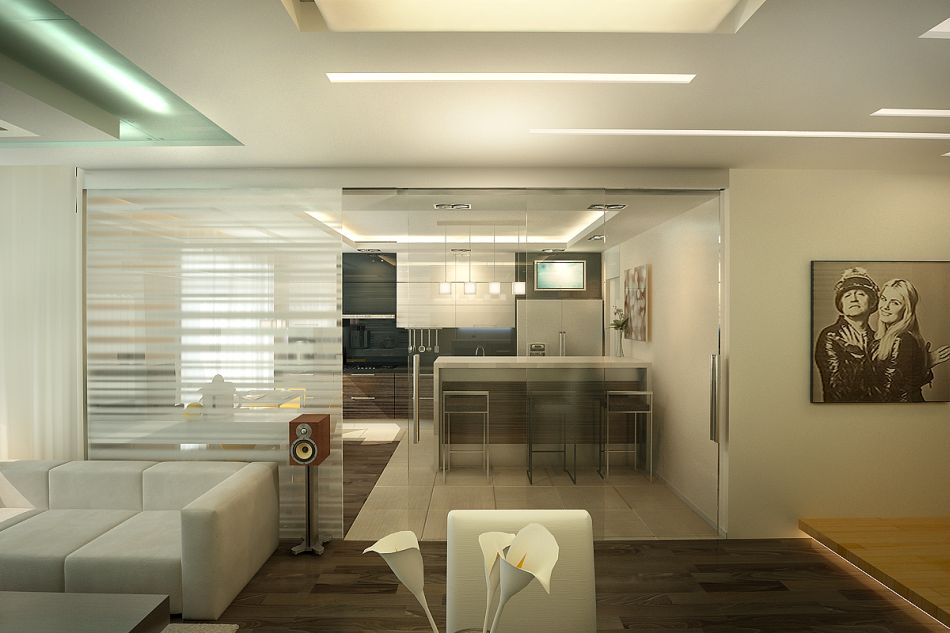 Кухня отделяется от остального пространства раздвижной перегородкой из прозрачного стекла. Вторая часть этой перегородки, украшенная пескоструйным рисунком, неподвижна и выполняет функцию стены гостиной.
