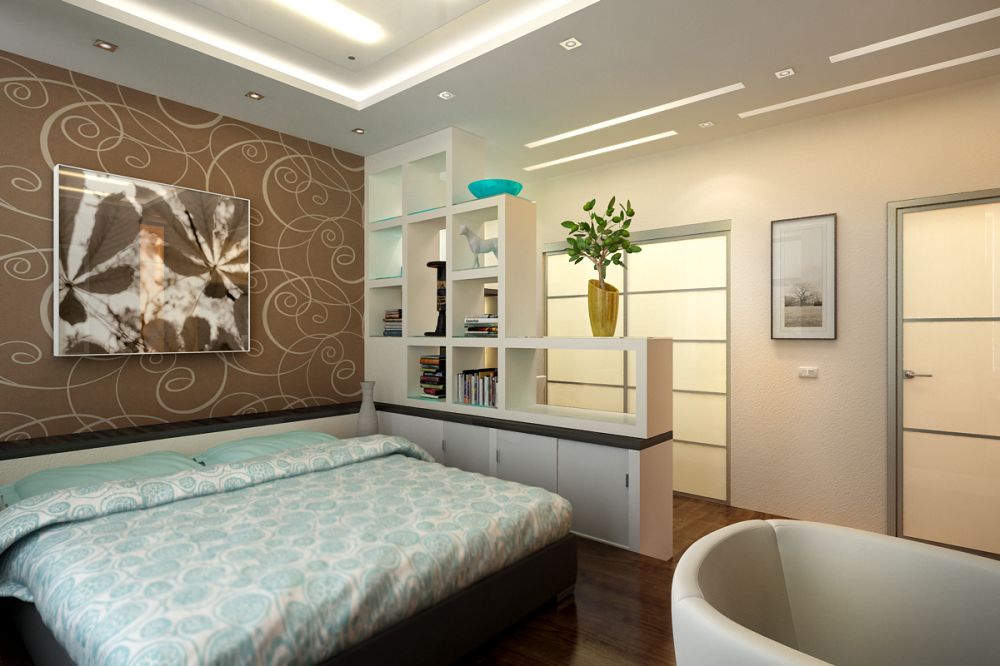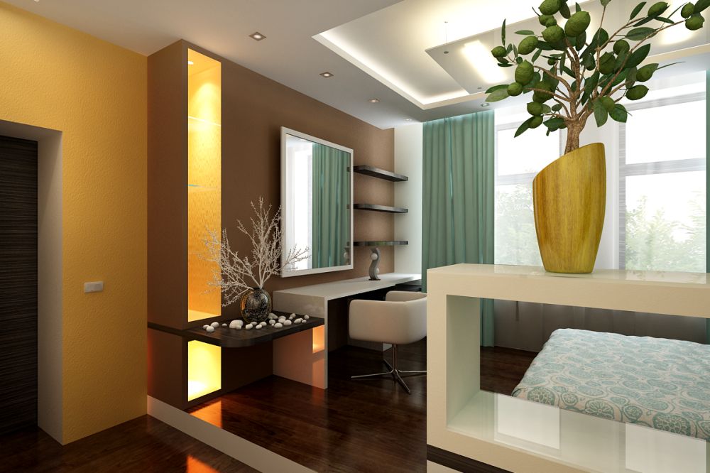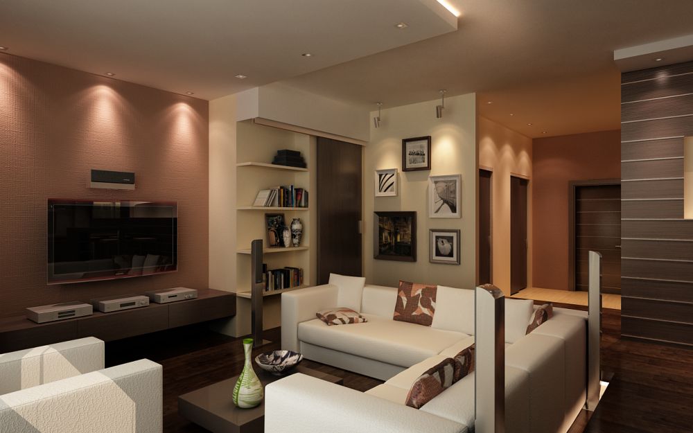 Интерьер небольшой квартиры выдержан в теплой коричневой гамме. Тональность задает покрытый темным ламинатом пол.