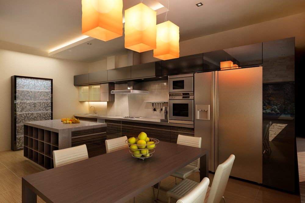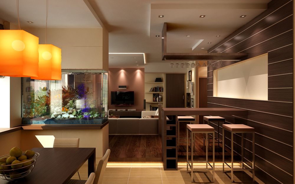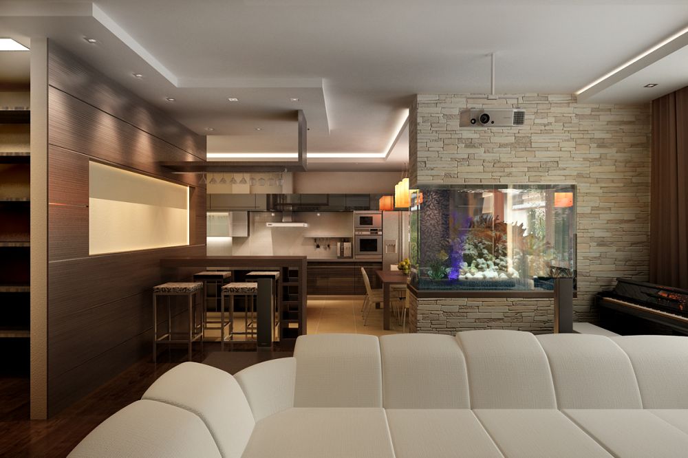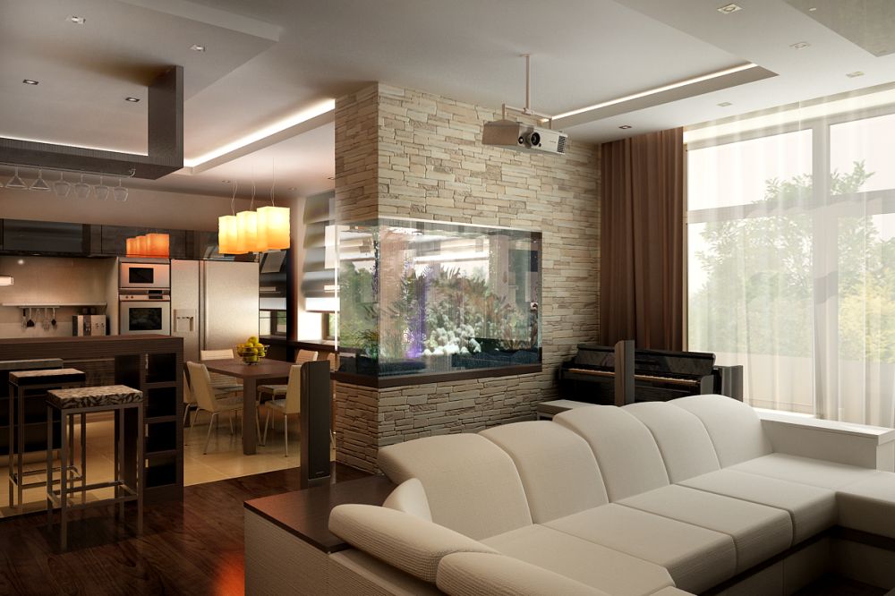 Встроенный аквариум в широкой перегородке на границе зон создает приятный антураж как для отдыха в гостиной, так и для общения в столовой.