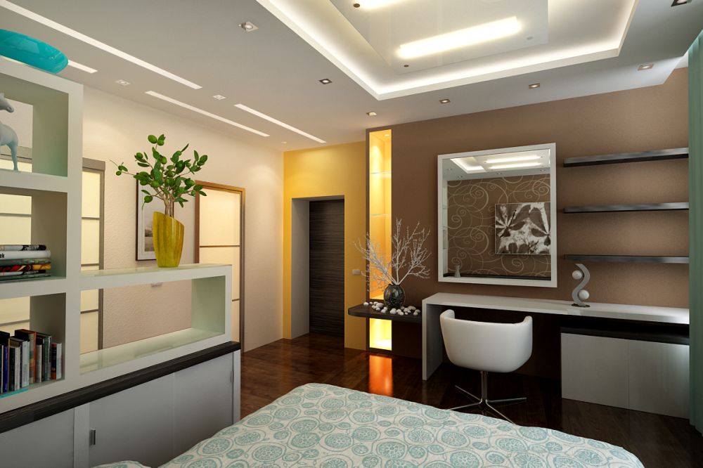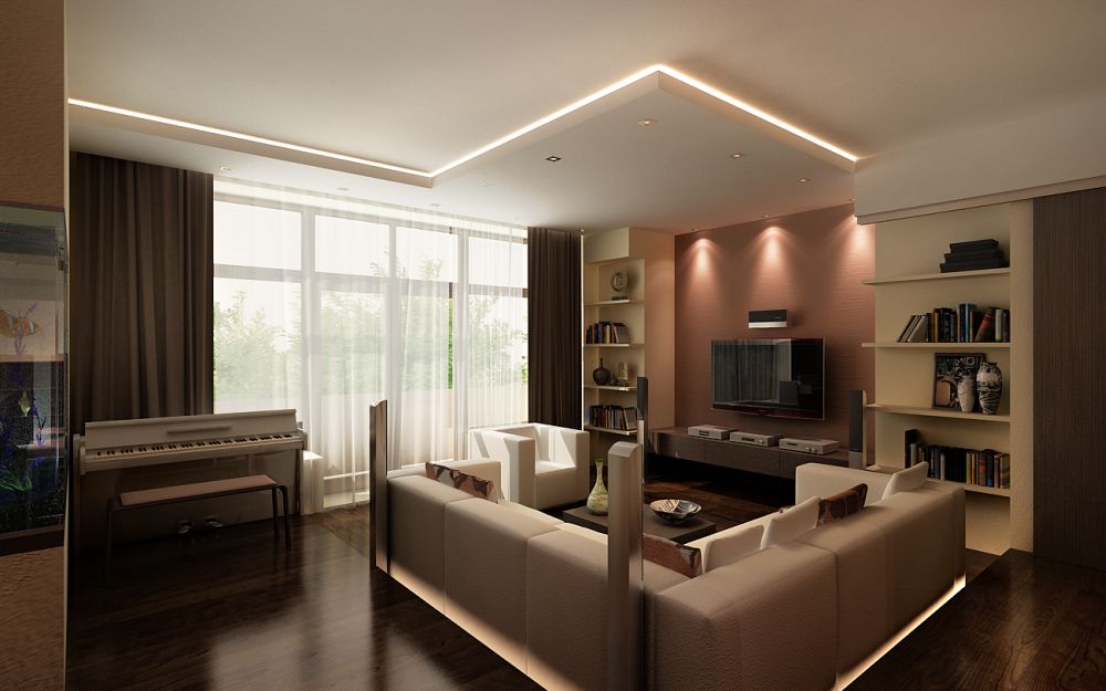 Островное расположение диванной группы в центре интерьера гостиной подчеркнуто потолочным оформлением. По контуру дивана в пол встроена скрытая подсветка, за счет чего создается необычная оптическая иллюзия.