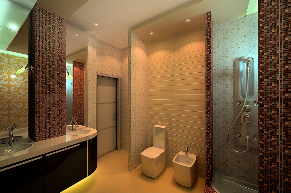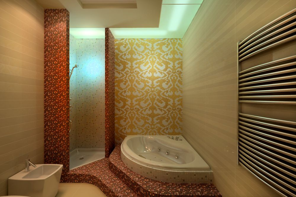 В дизайне спальни теплый коричневый уравновешен холодным бирюзовым. А вот в оформлении ванной, благодаря обращению к мозаике, разнообразие коричневой палитры предстает во всем великолепии.