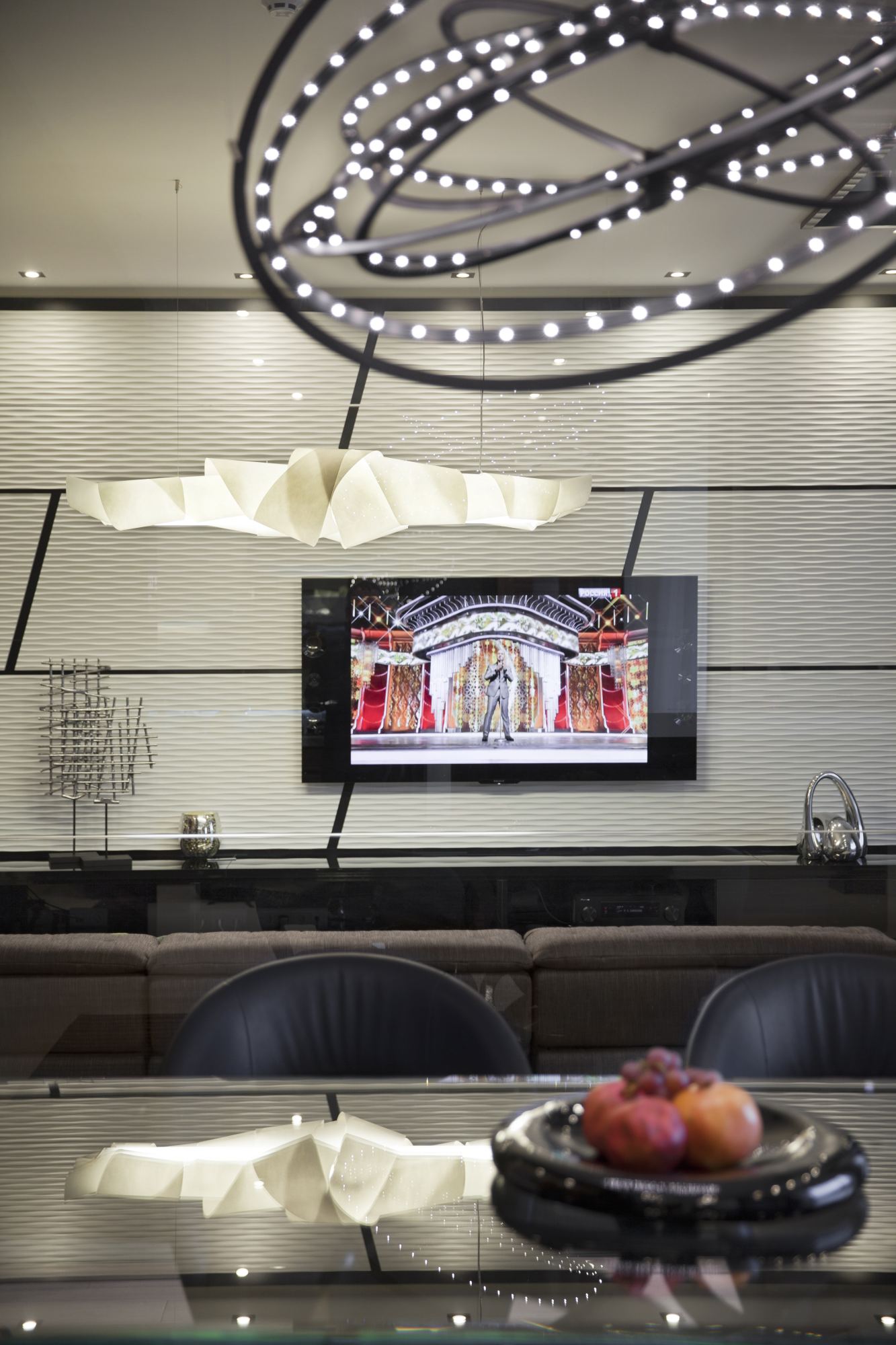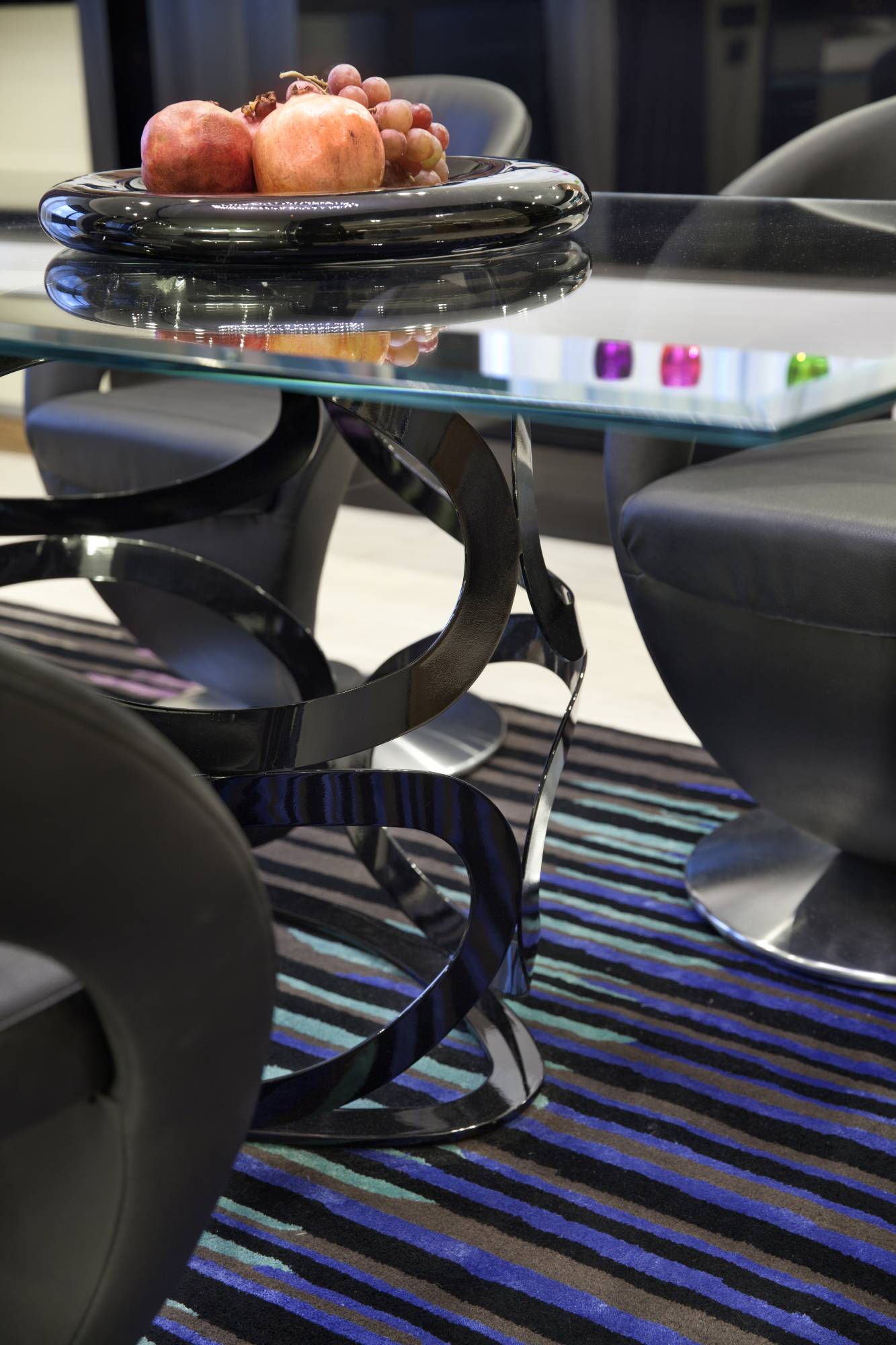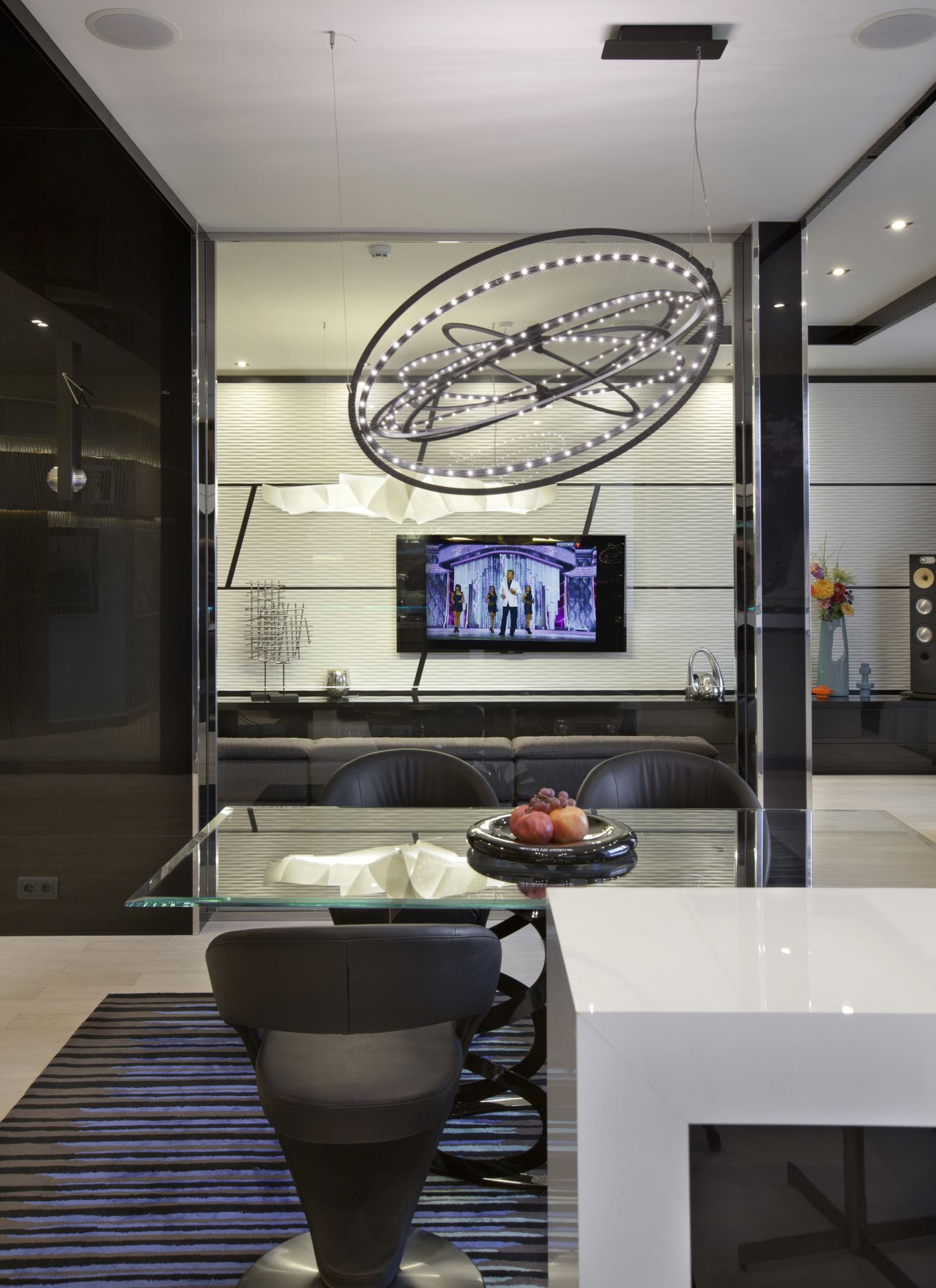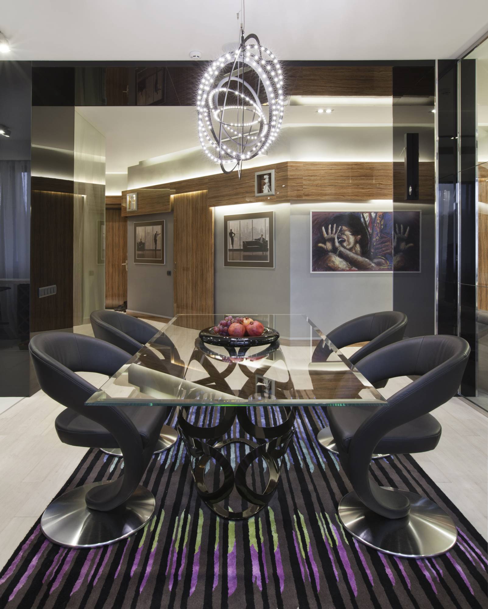 Столовая обосабливается от места отдыха перегородкой, а со стороны холла ее зрительно отделяет широкая черная полоса из глянцевого пластика, переходящая с перегородки на потолок и соседнюю стену. Для обеденного стола выбрана прозрачная столешница прямоугольной формы. Реальная простота ее геометрии компенсируется фантазийным металлическим основанием, собранным из множества плоских колец. Центральный светильник тоже необычен: светящиеся светодиодные круги ассоциируются с орбитами далеких планет. Картинку дополняют футуристические кресла на дисковой металлической опоре.