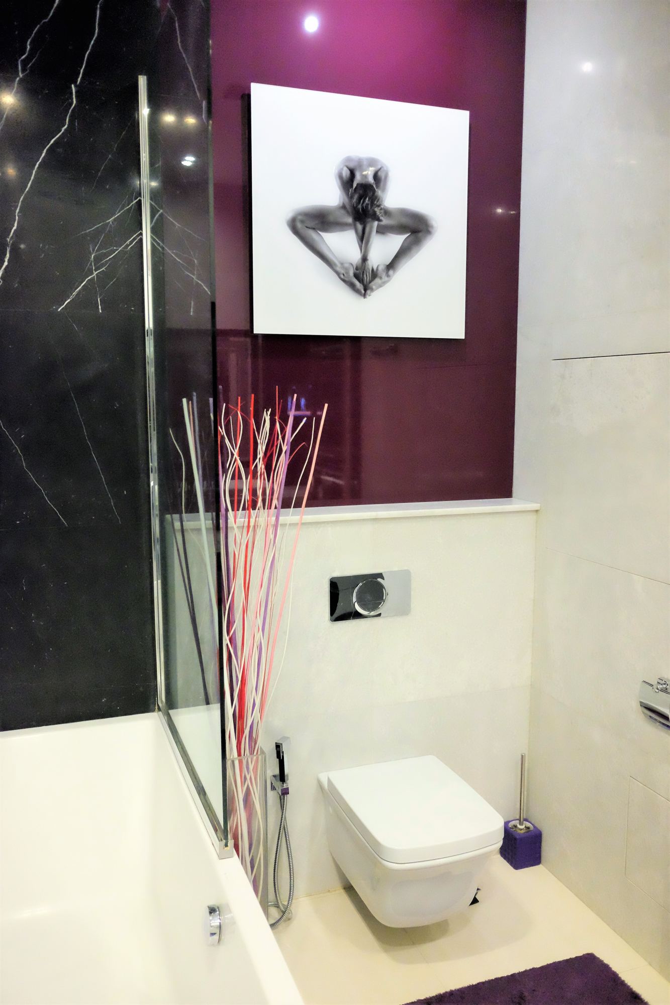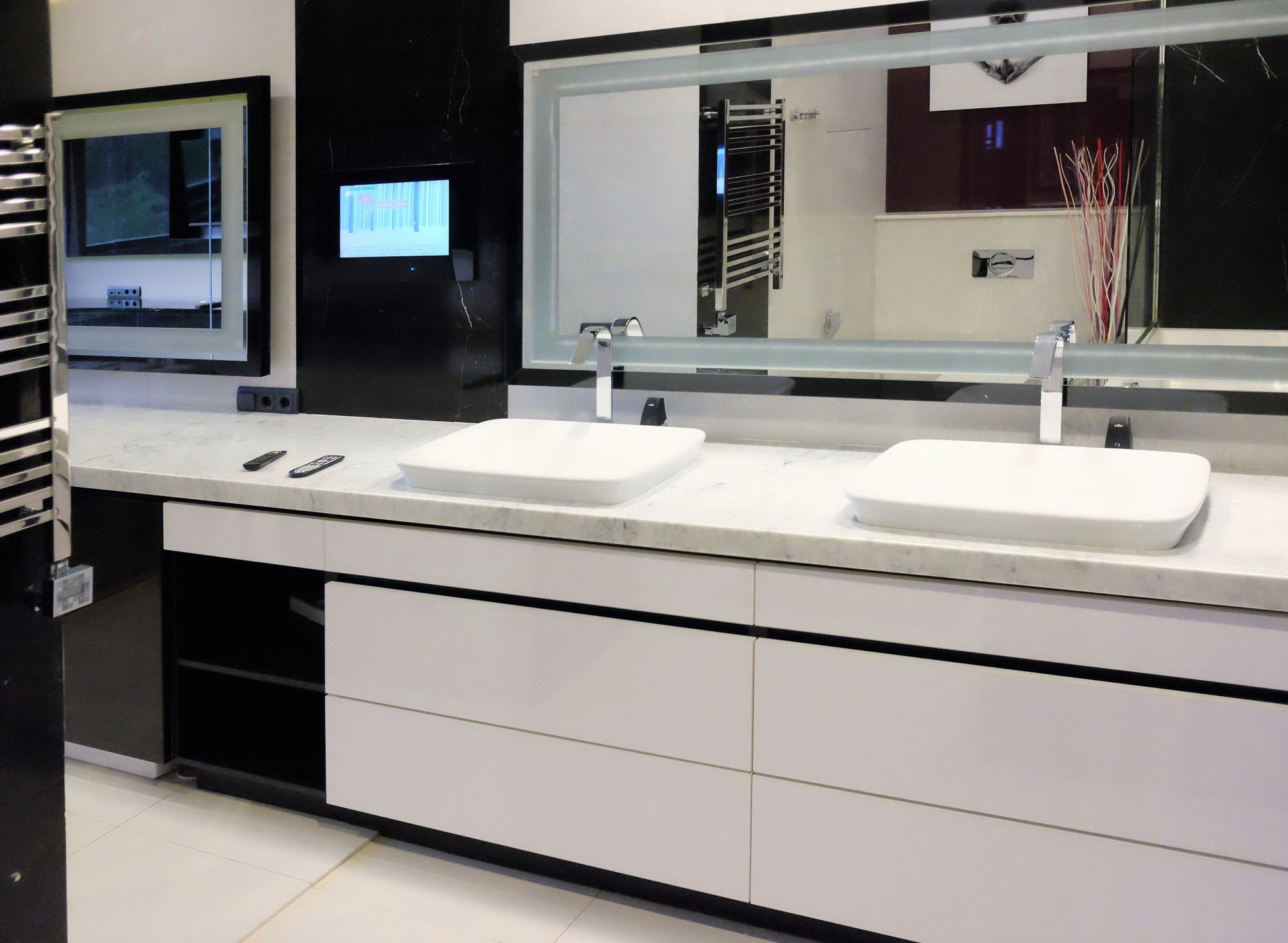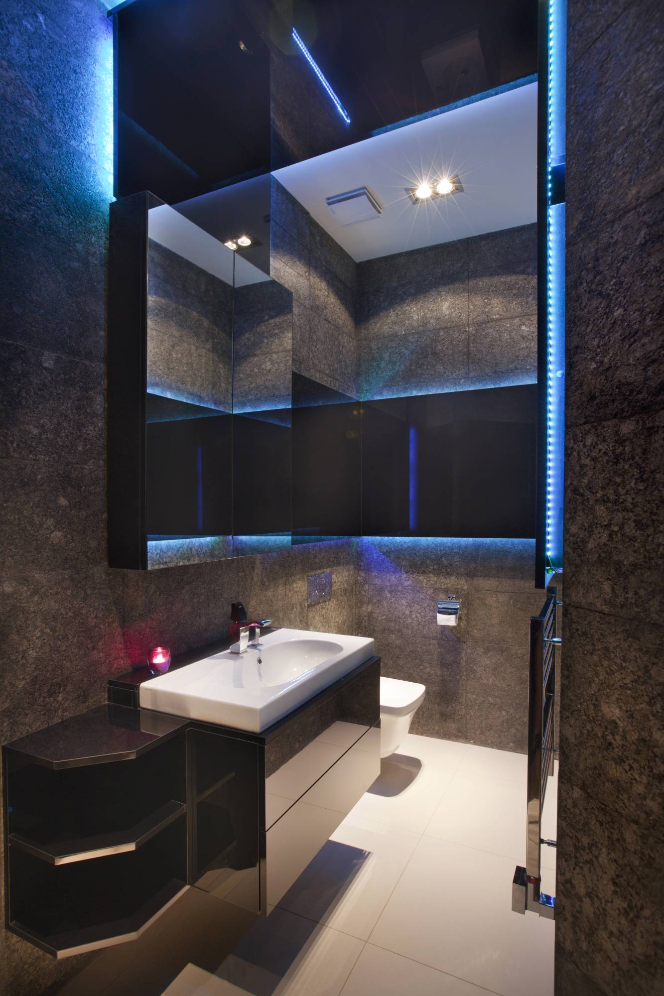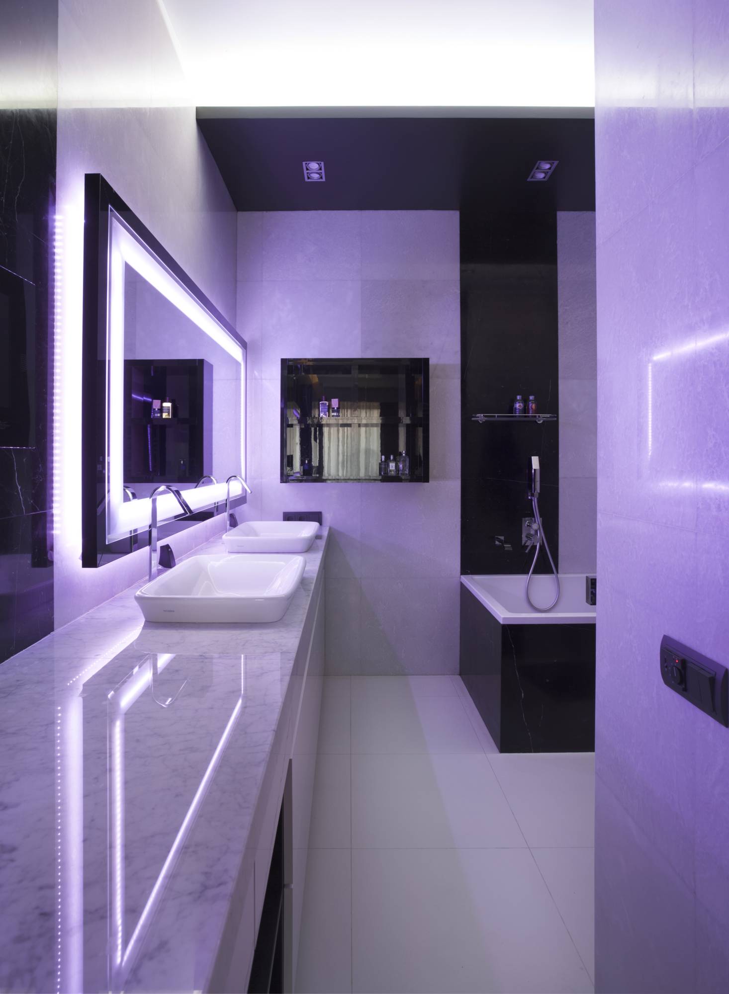 В дизайне помещений активно используется светодиодная подсветка в зоне зеркал и на стенах. В ванной комнате для удобства владельцев вмонтированы два умывальника, чтобы, торопясь утром на работу, можно было не толкаться. В интерьере преобладает белый цвет с частичным включением черного. Туалетная комната компактна, выполнена в темных коричневых оттенках.