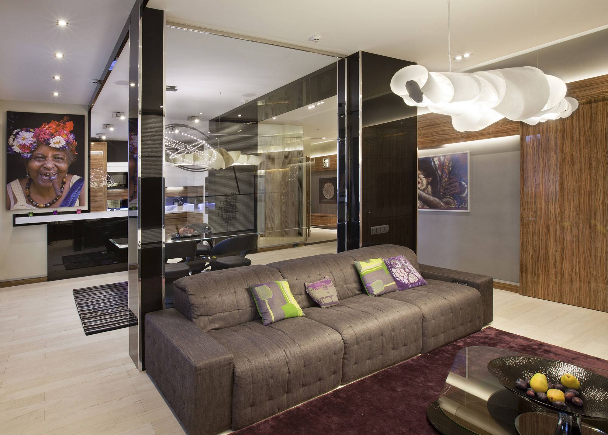 По желанию заказчиков в квартире создана оригинальная и стильная обстановка, наполненная эффектными деталями. Каждый день интерьер можно открывать заново, не уставая и не пресыщаясь. Ведущим приемом оформления стала работа с объемом, в том числе и в организации пространства.