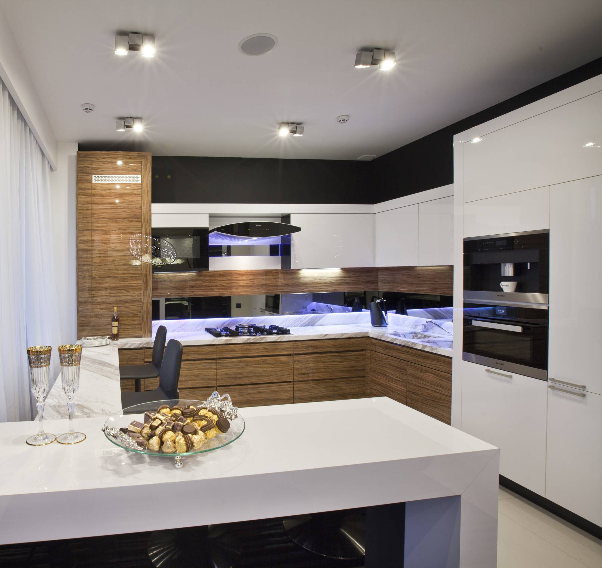 Кухня обставлена максимально технологично. В отделке сочетаются белые и деревянные лакированные фасады. Вдоль окна организовано еще одно обеденное место для двоих.