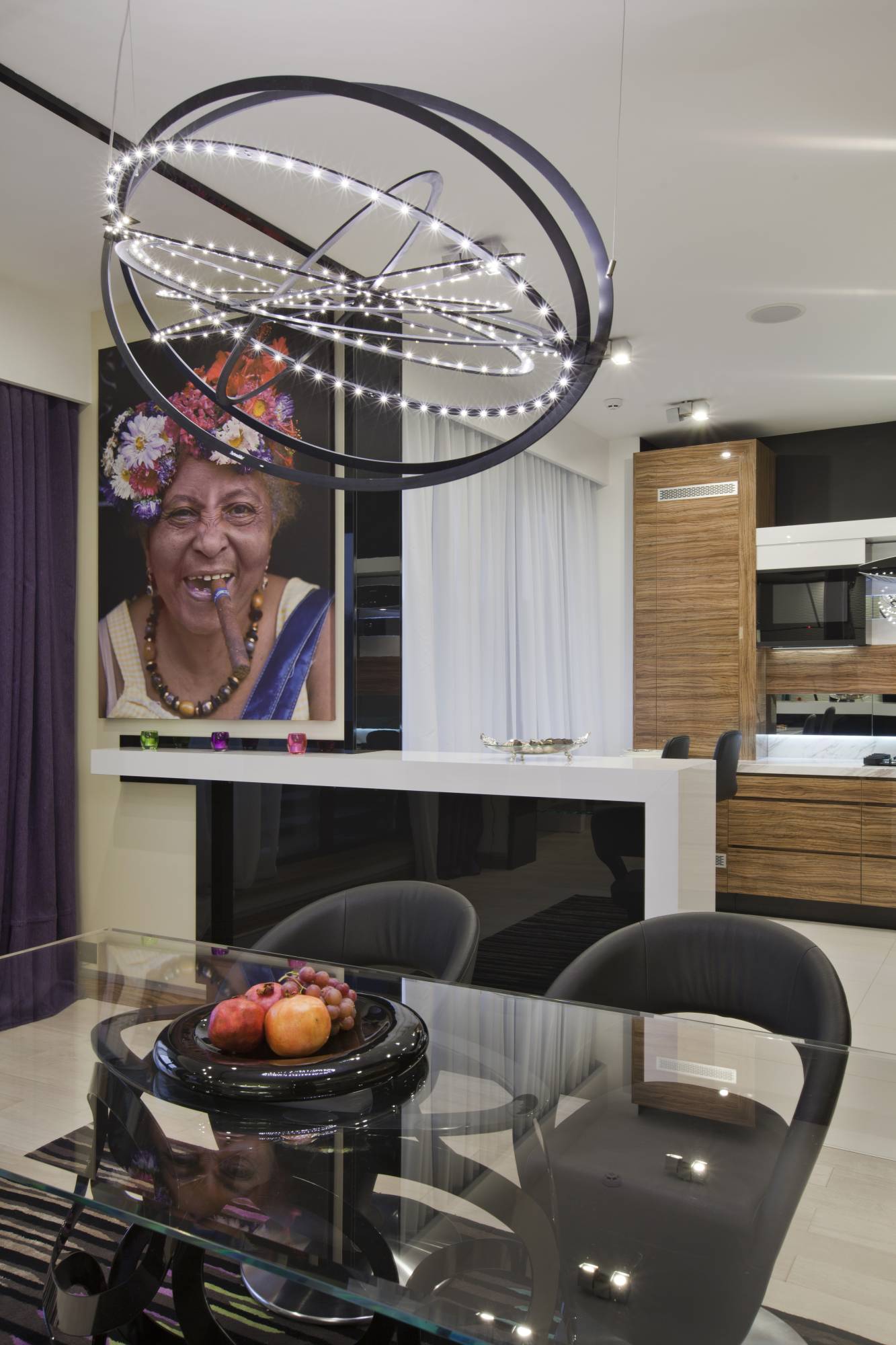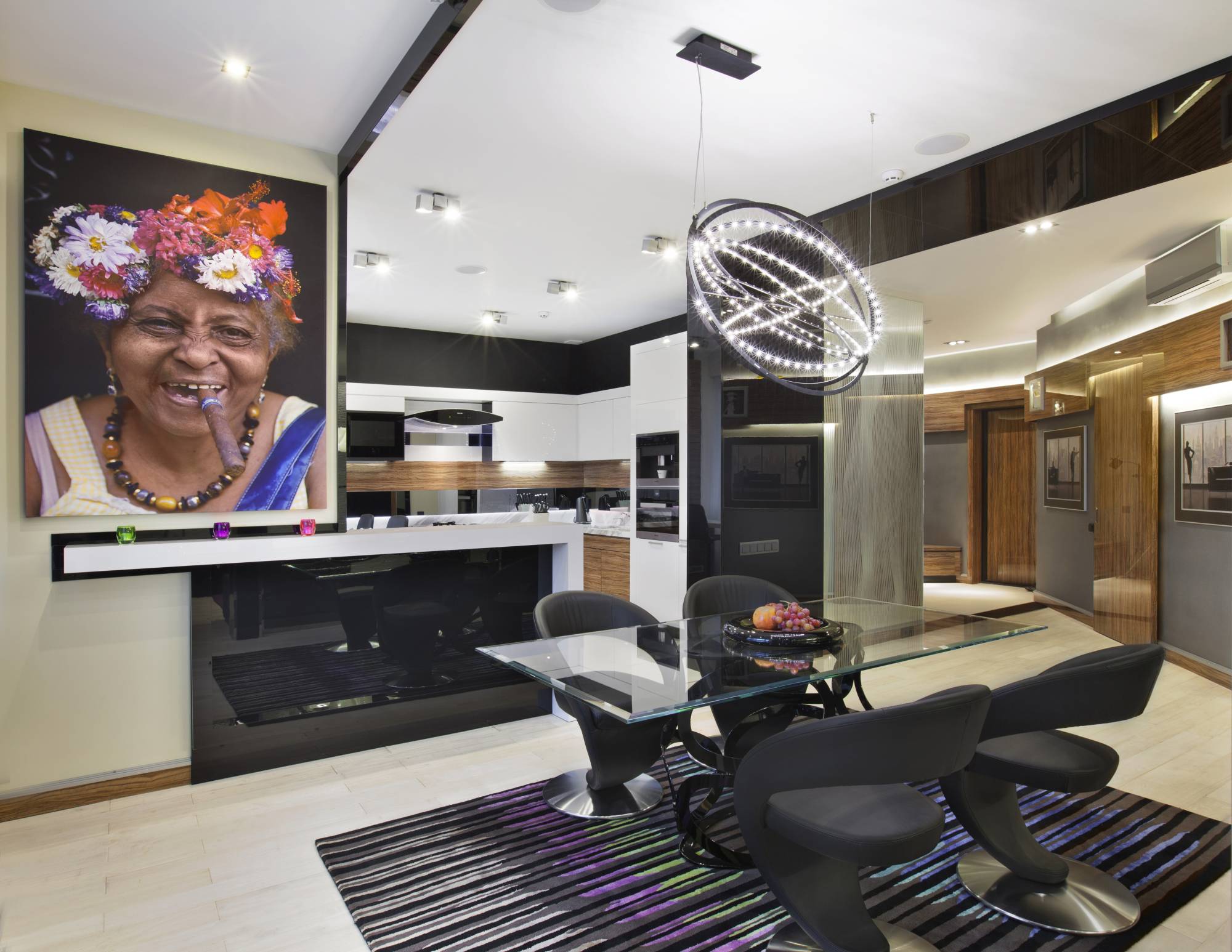 Барная стойка с черным лакированным фасадом обозначает границу столовой и кухни. Стену в этом месте украшает огромная фотография жизнерадостной кубинки – яркий и неожиданный цветовой акцент в черно-белом окружении.