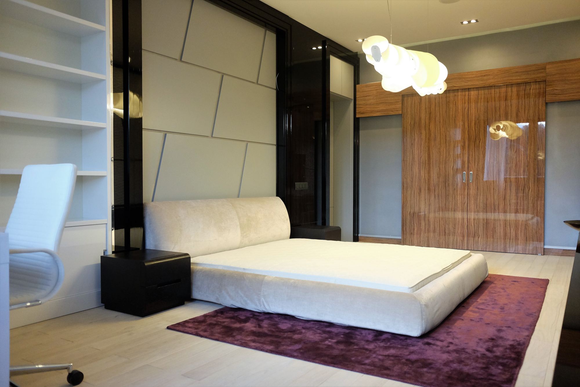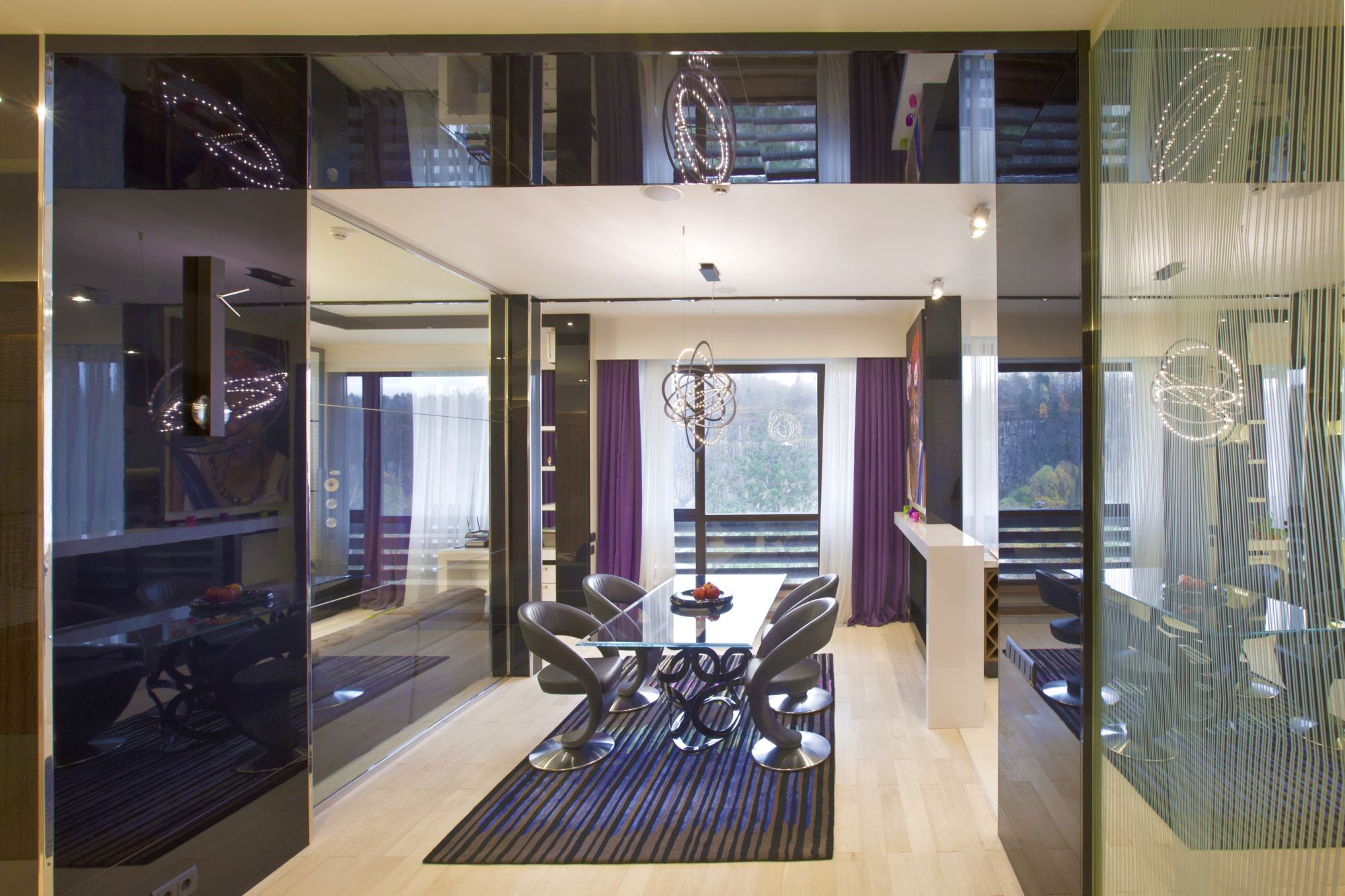 Футуристический интерьер квартиры насыщен оригинальными предметами (светильниками, столами, креслами), светодиодной подсветкой. В сочетании с множеством отражающих глянцевых поверхностей создается эффект космического пространства, в котором очень уютно жить. Объемные решения стен (фриз, выступающие межкомнатные двери) и потолка подчеркивают необычность реального интерьера в квартире.