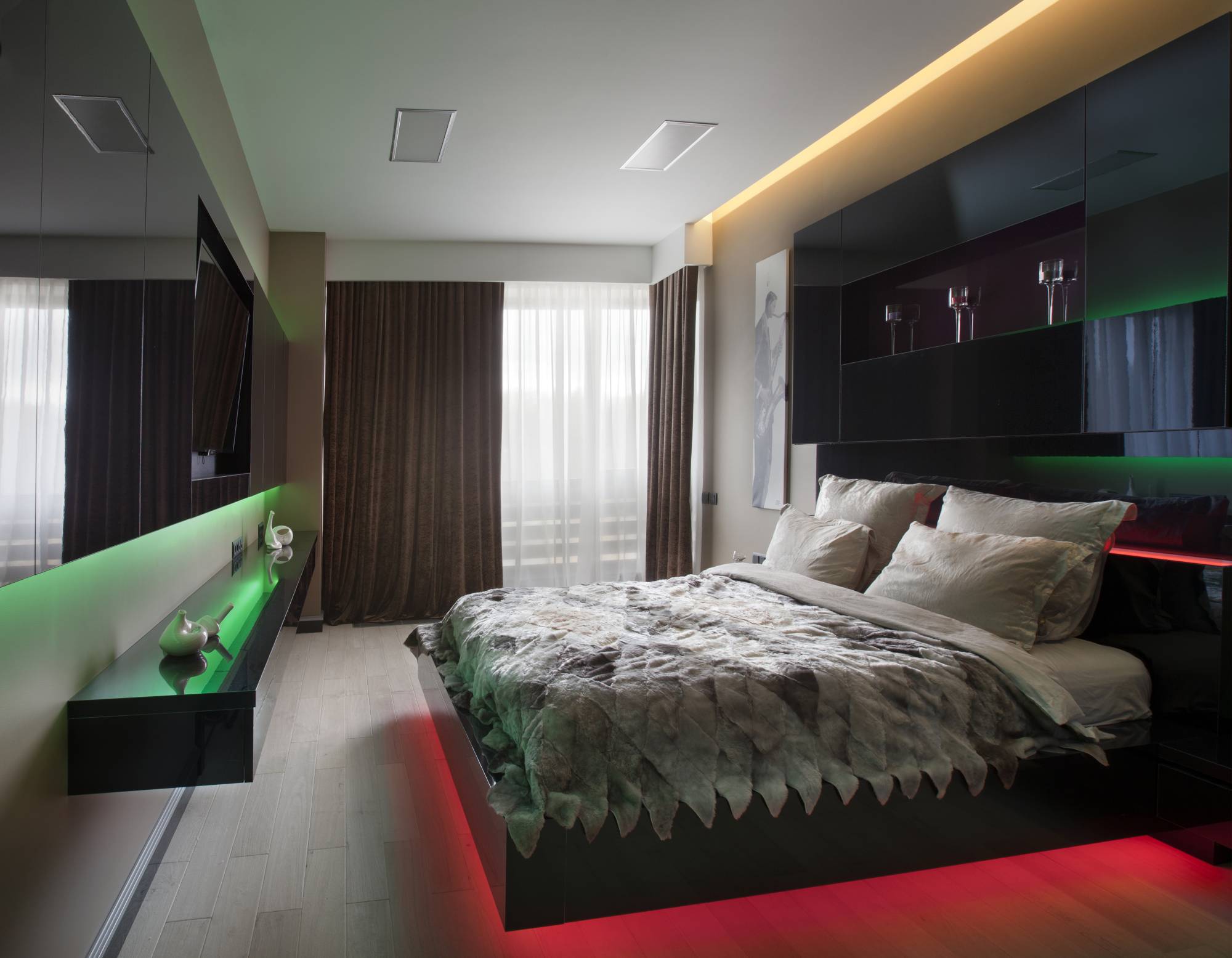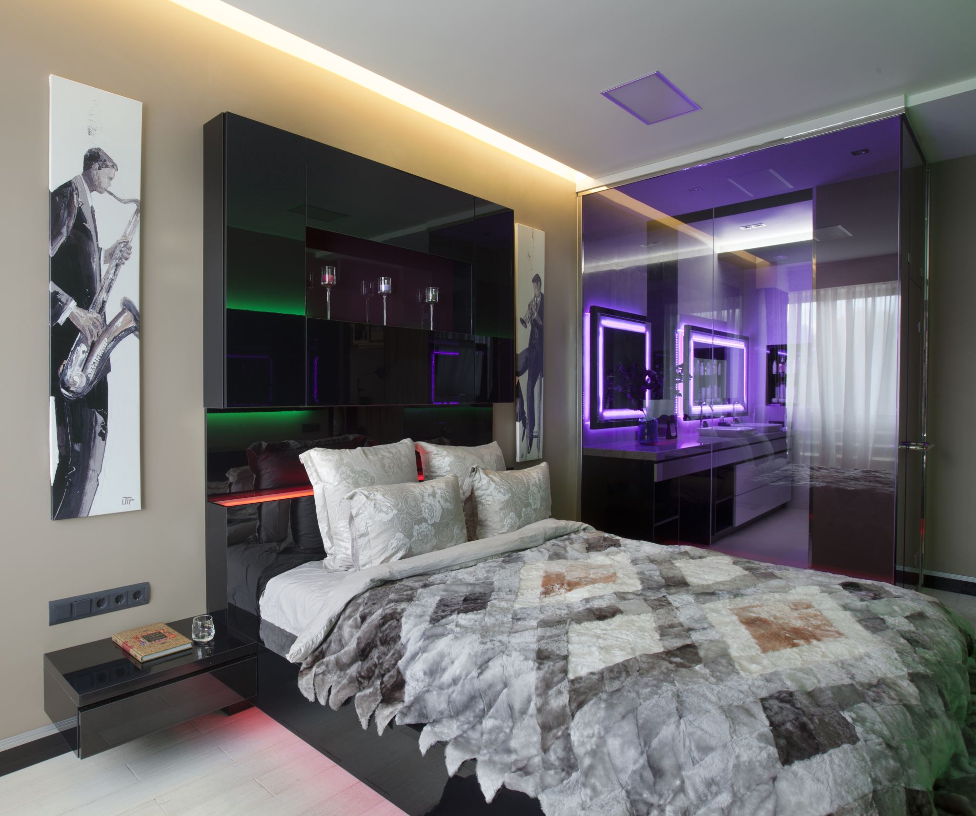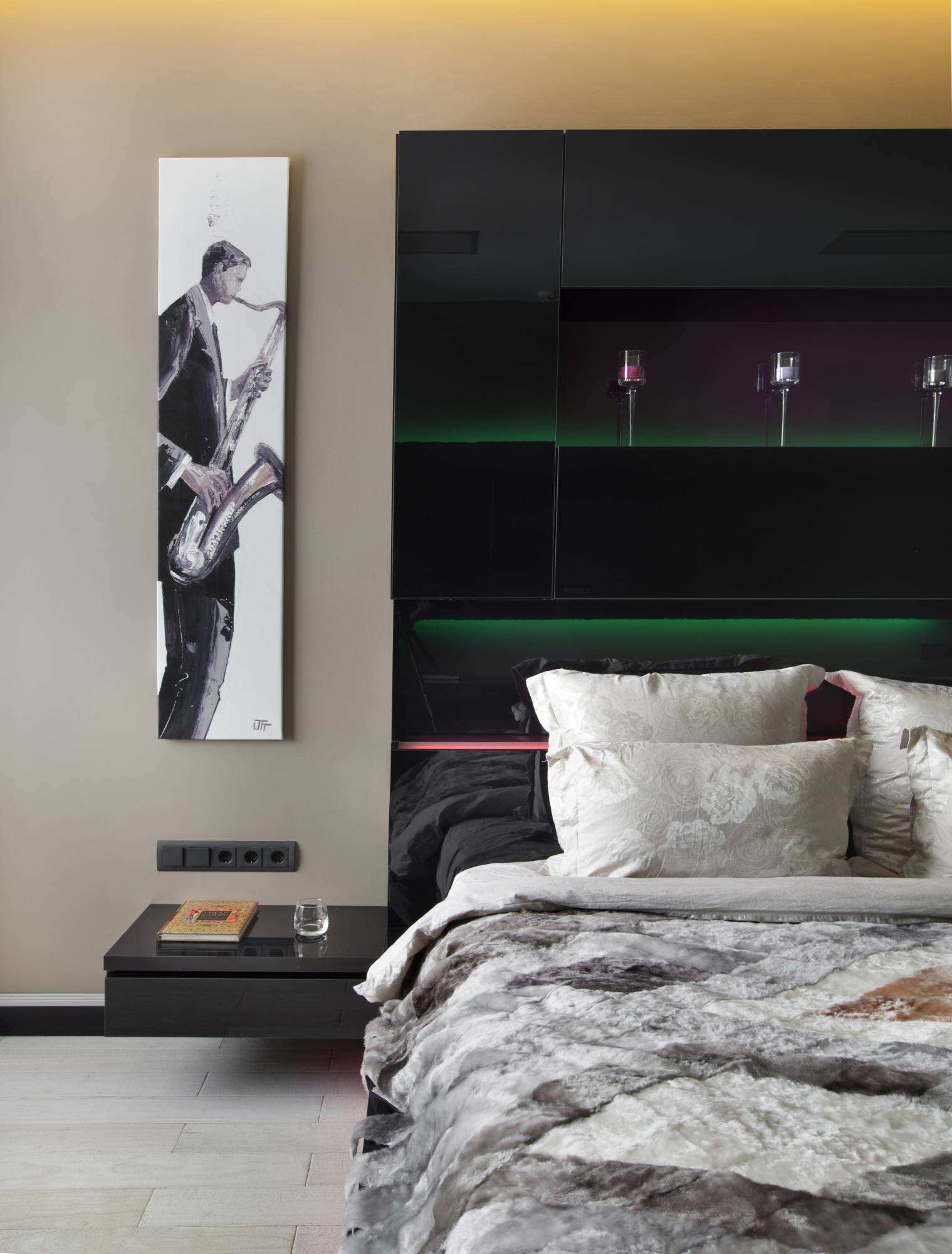 Внимание в интерьере сосредоточили на оформлении изголовья кровати. Высокая черная панель сочетает в себе функцию изголовья и одновременно служит полкой для приятных мелочей. К примеру, сюда можно поставить ароматические свечи. Зеленая и розовая подсветка смотрится космически. Рисунок саксофониста – реверанс в сторону богемности.