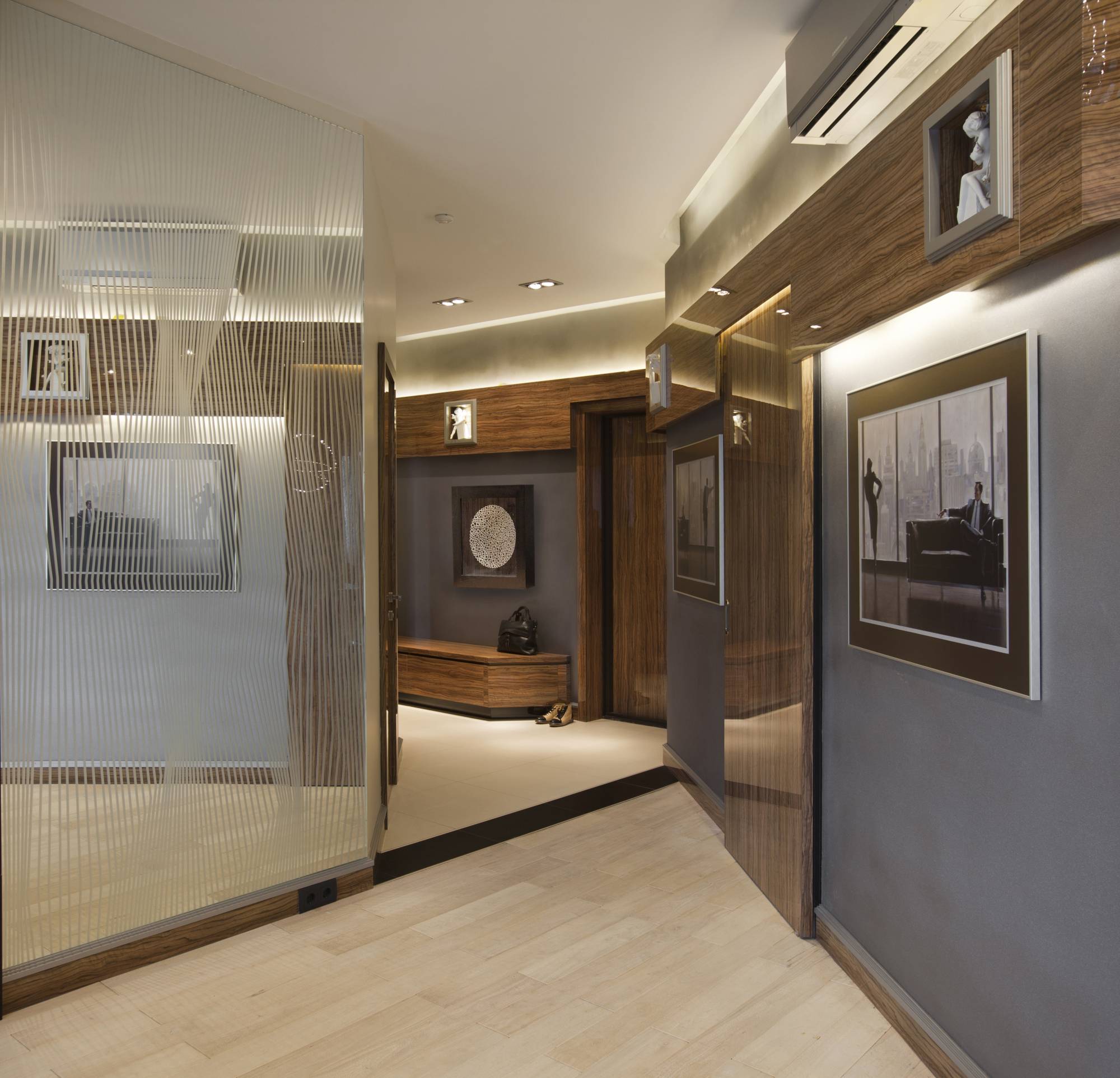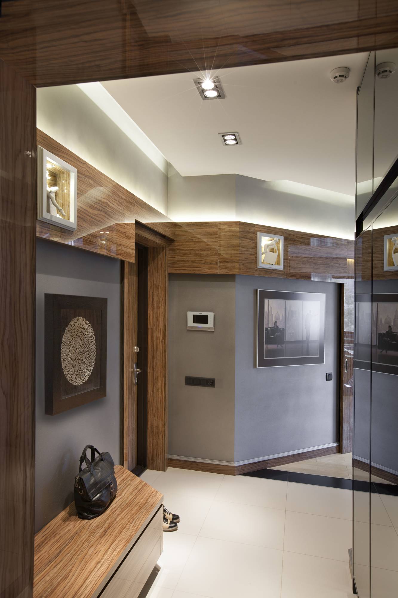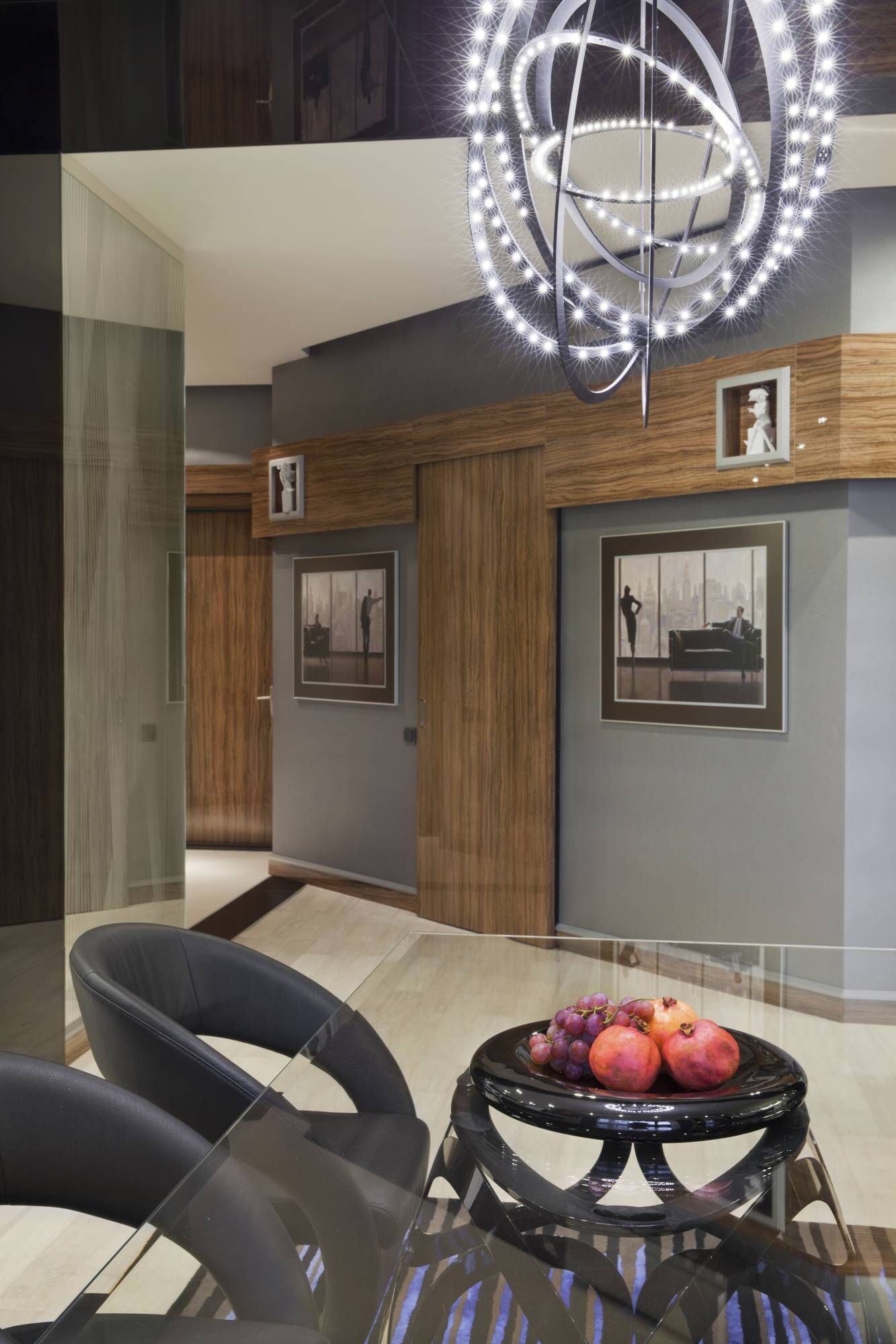 Верхняя часть стен прихожей и холла отделана выступающим широким фризом из глянцевых деревянных панелей. Фриз уходит в гостиную, подчеркивая единство помещений и выделяя геометрию стен. Маленькие квадратные ниши, прорезанные в панелях, декорированы миниатюрными статуями. Раздвижные межкомнатные двери, облицованные таким же шпоном, создают дополнительный рельеф.
