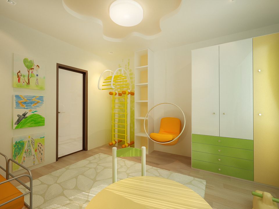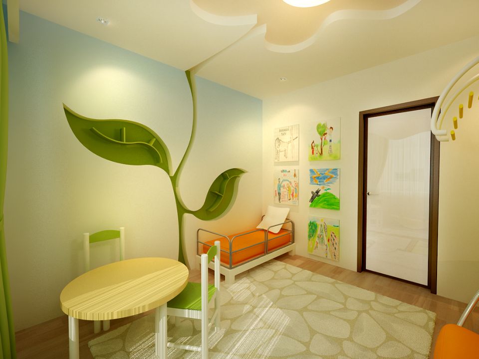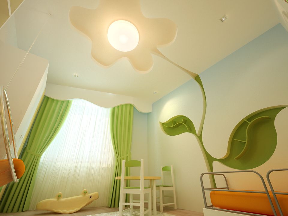 Центральный элемент в оформлении второй детской – для малыша – изображение цветка на стене и потолке, созданное объемными конструкциями. Внутри «листьев» устроены полки, а в самом «цветке» сияет световая панель.