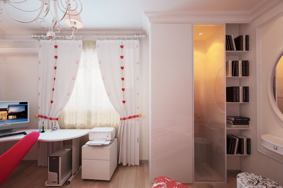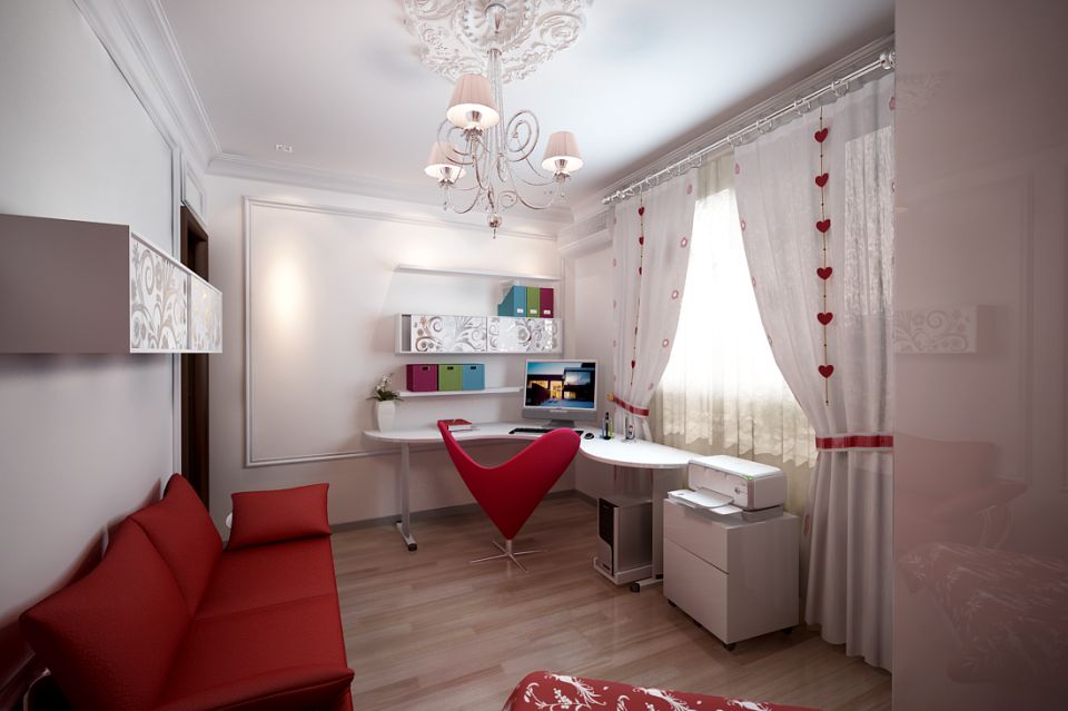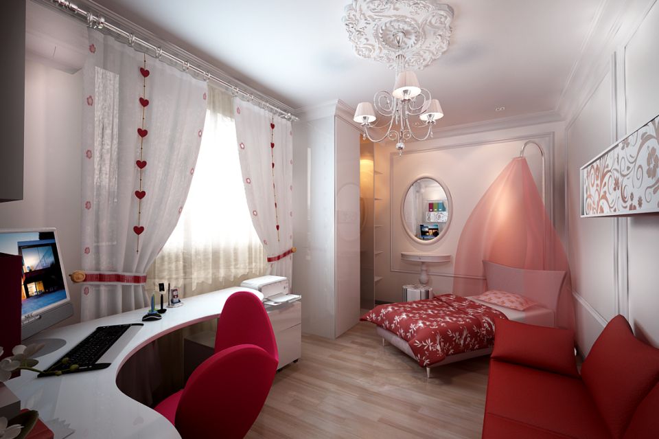 В комнате старшей дочери солирует активный красный – в текстиле, мягкой мебели и декоре штор. Обращение к классическим мотивам (молдингам, карнизам, потолочной розетке) поддержано дизайном кровати с балдахином.