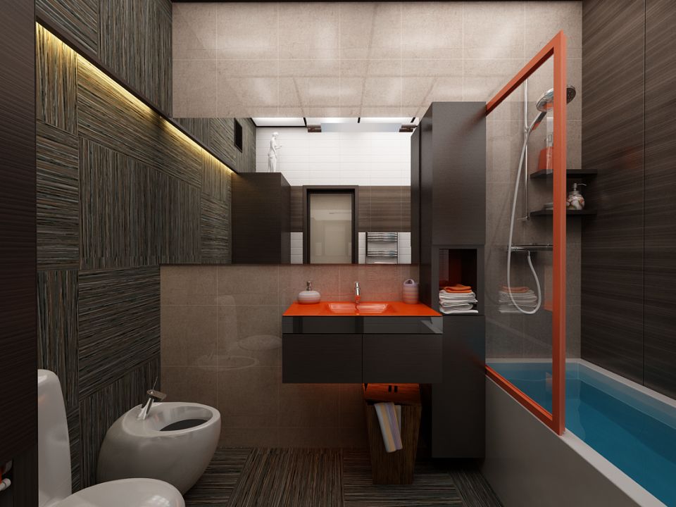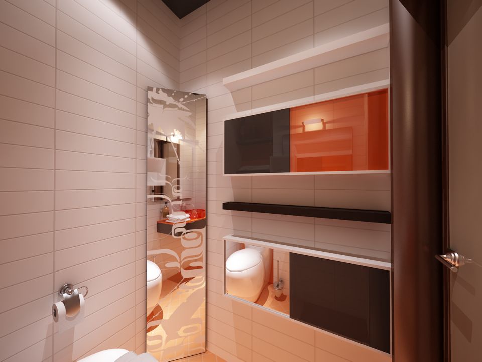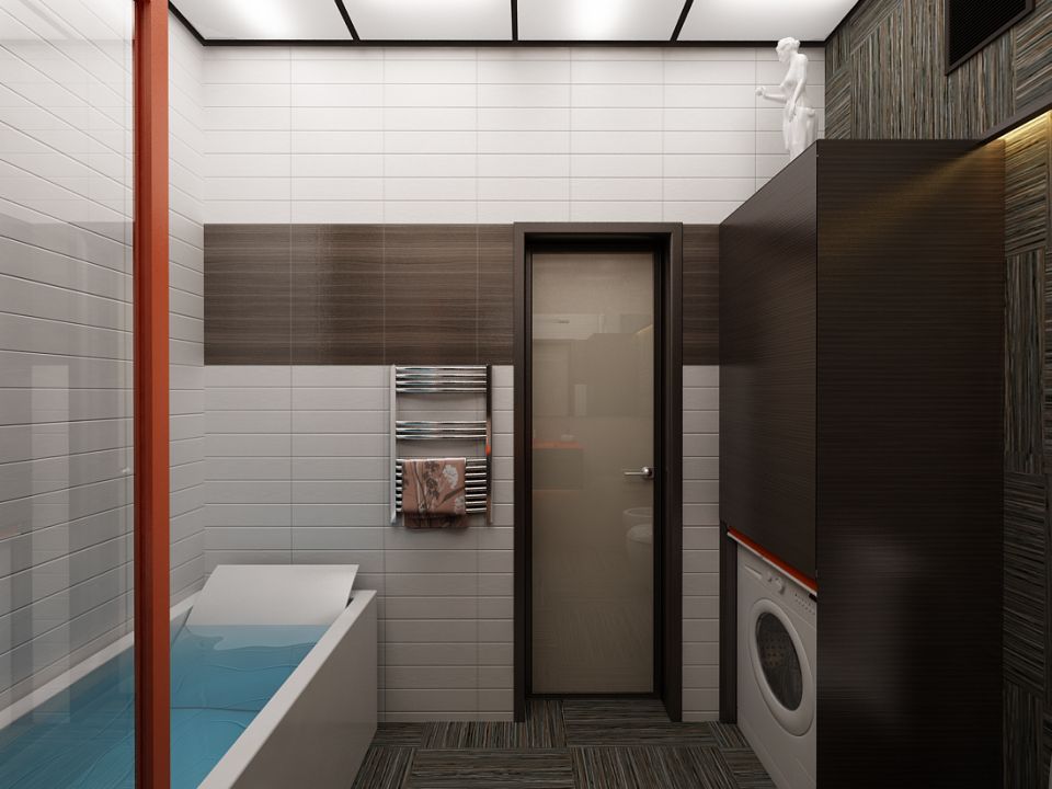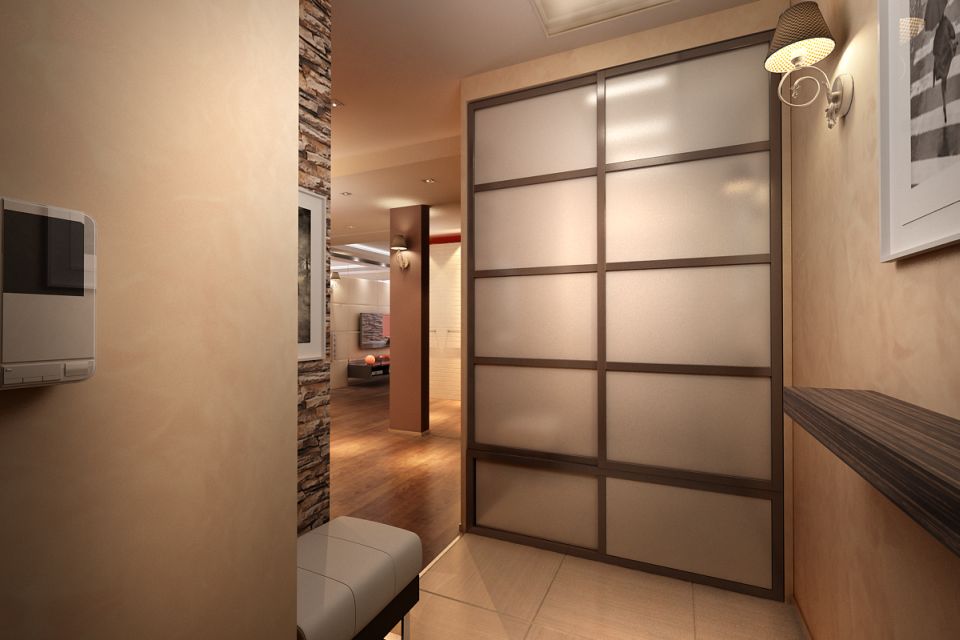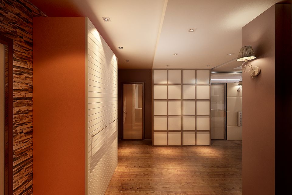 С обратной стороны перегородка отделана зеркальной панелью в пол, за счет чего расширяется пространство холла.