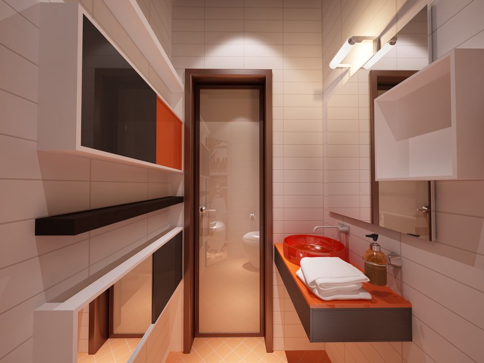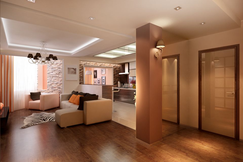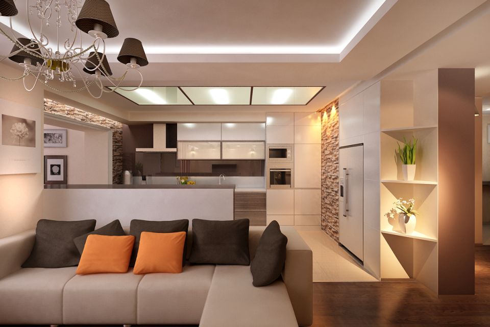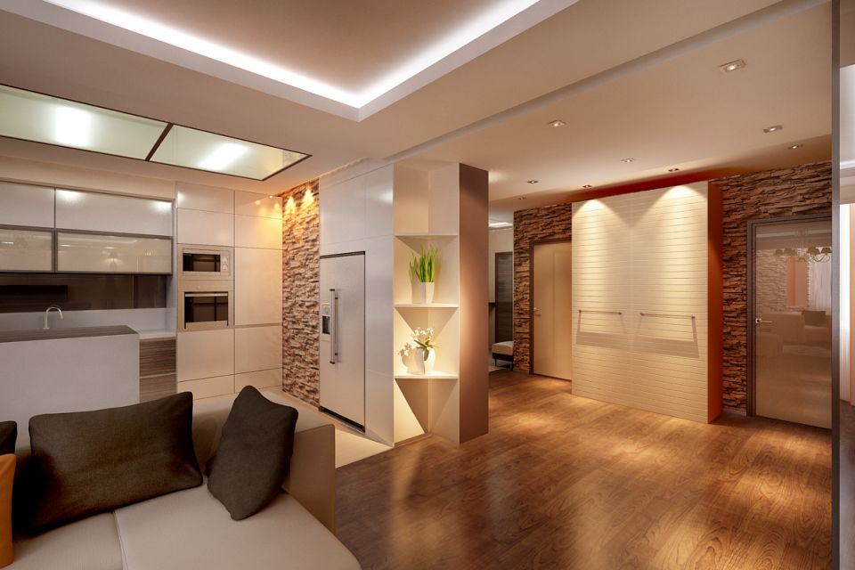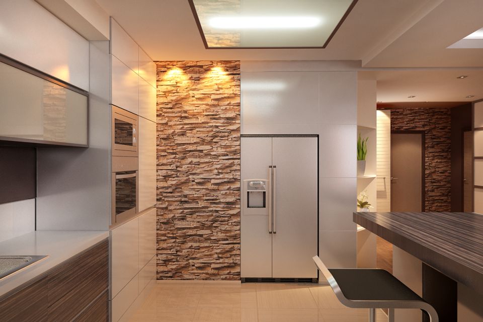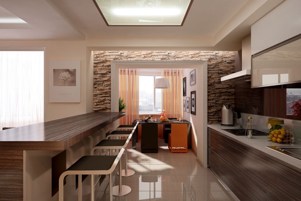 Впрочем, можно потрапезничать и на кухне – за длинной и вместительной барной стойкой. Холодильник встраивается в отделяющую кухню от прихожей перегородку и практически незаметен со стороны зоны отдыха.