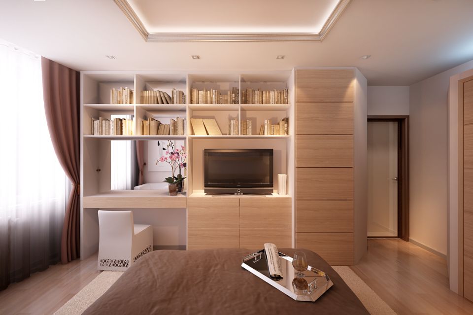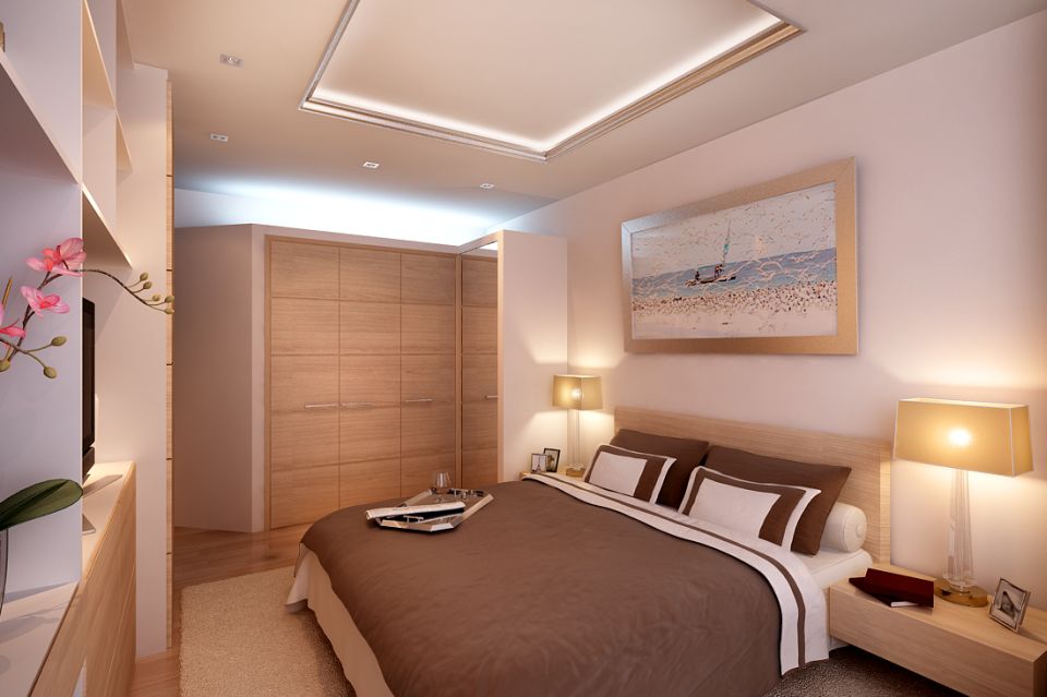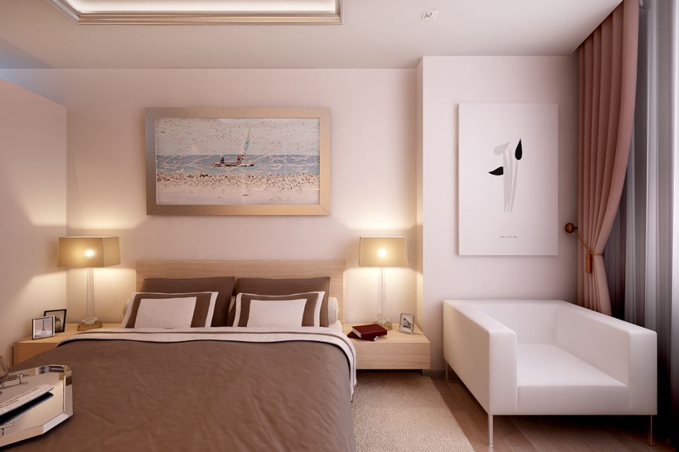 Интерьер родительской спальни выдержан в коричнево-бежевой гамме, использованной при оформлении прихожей, гостиной и кухни.