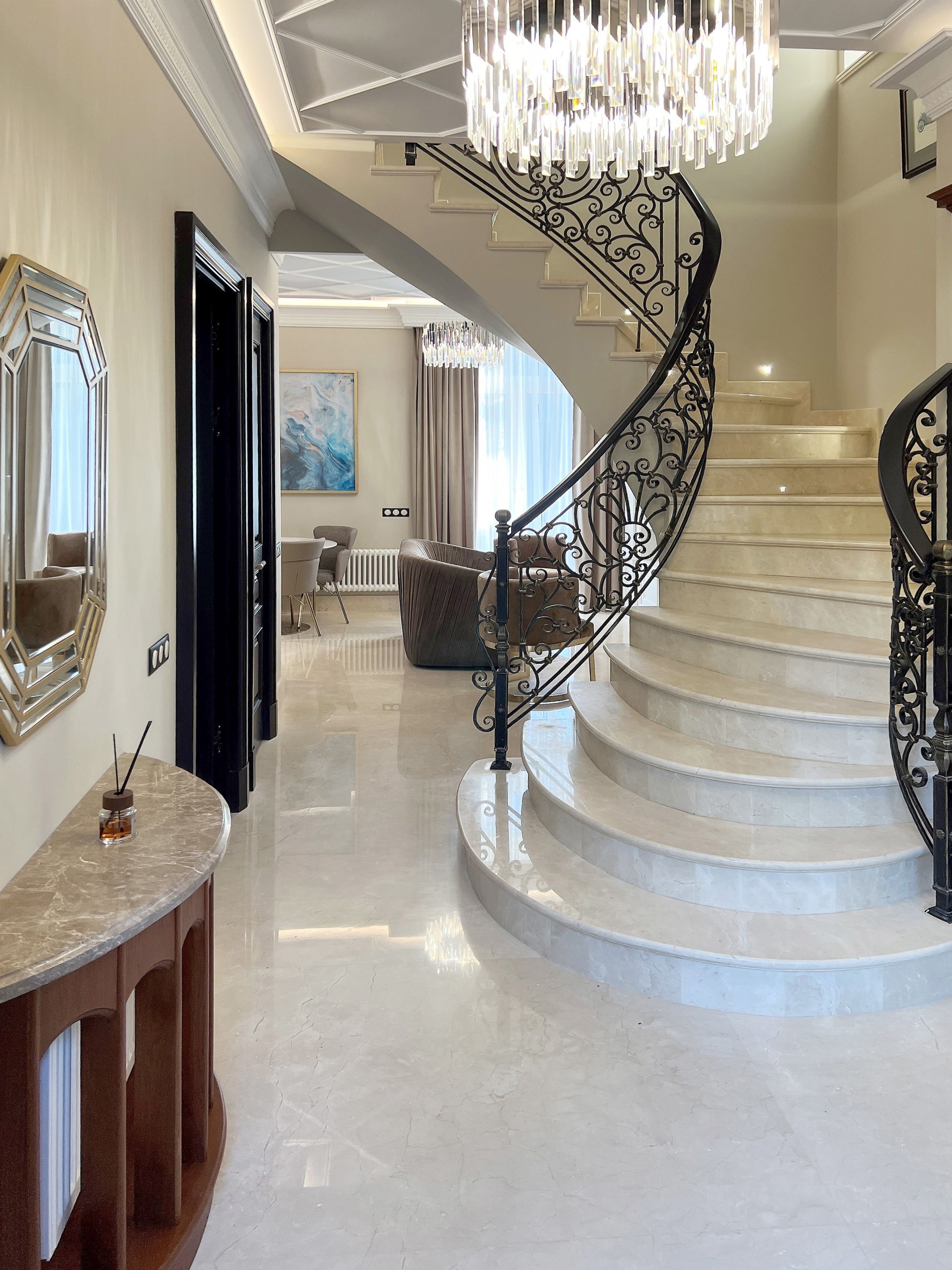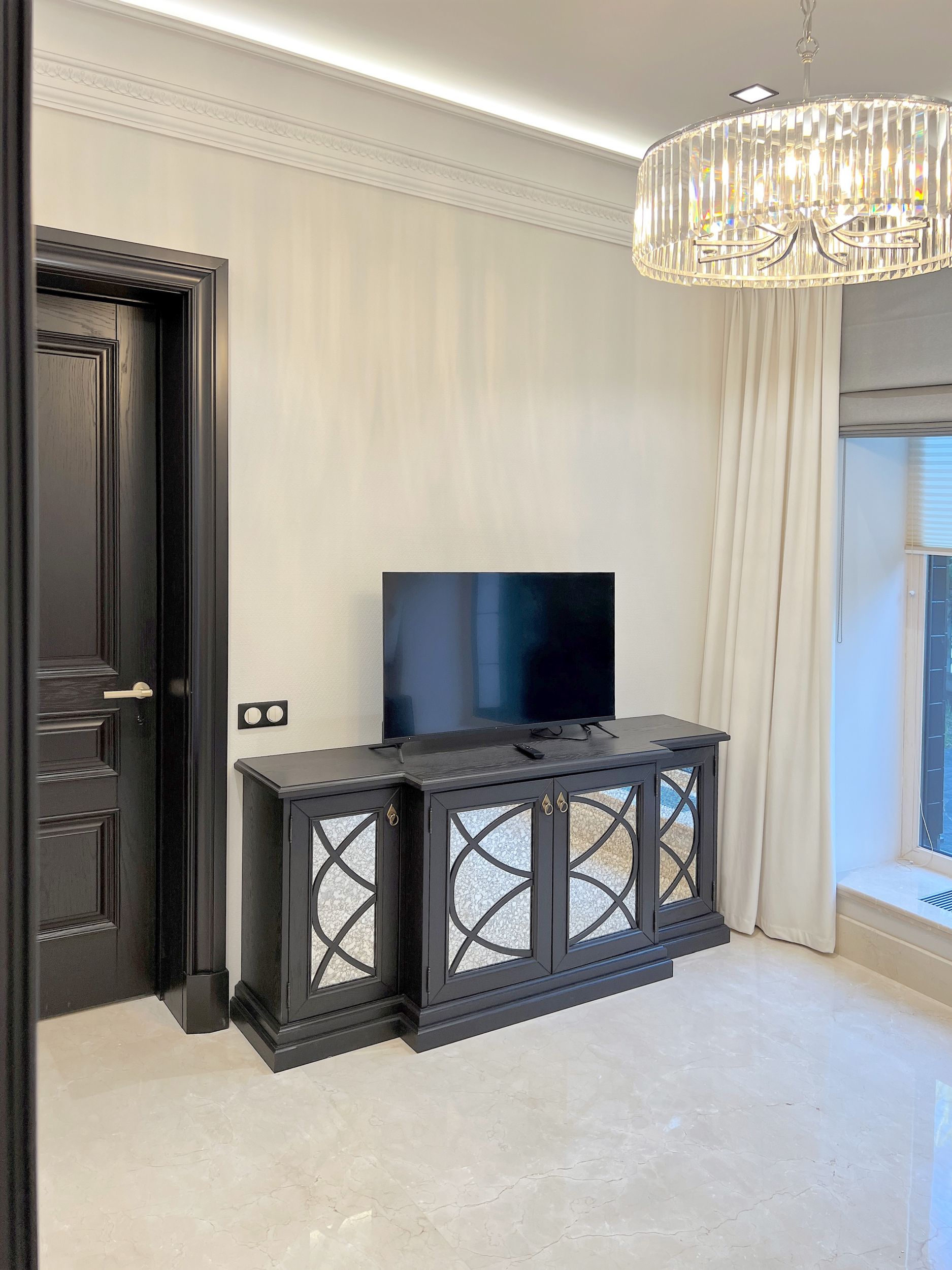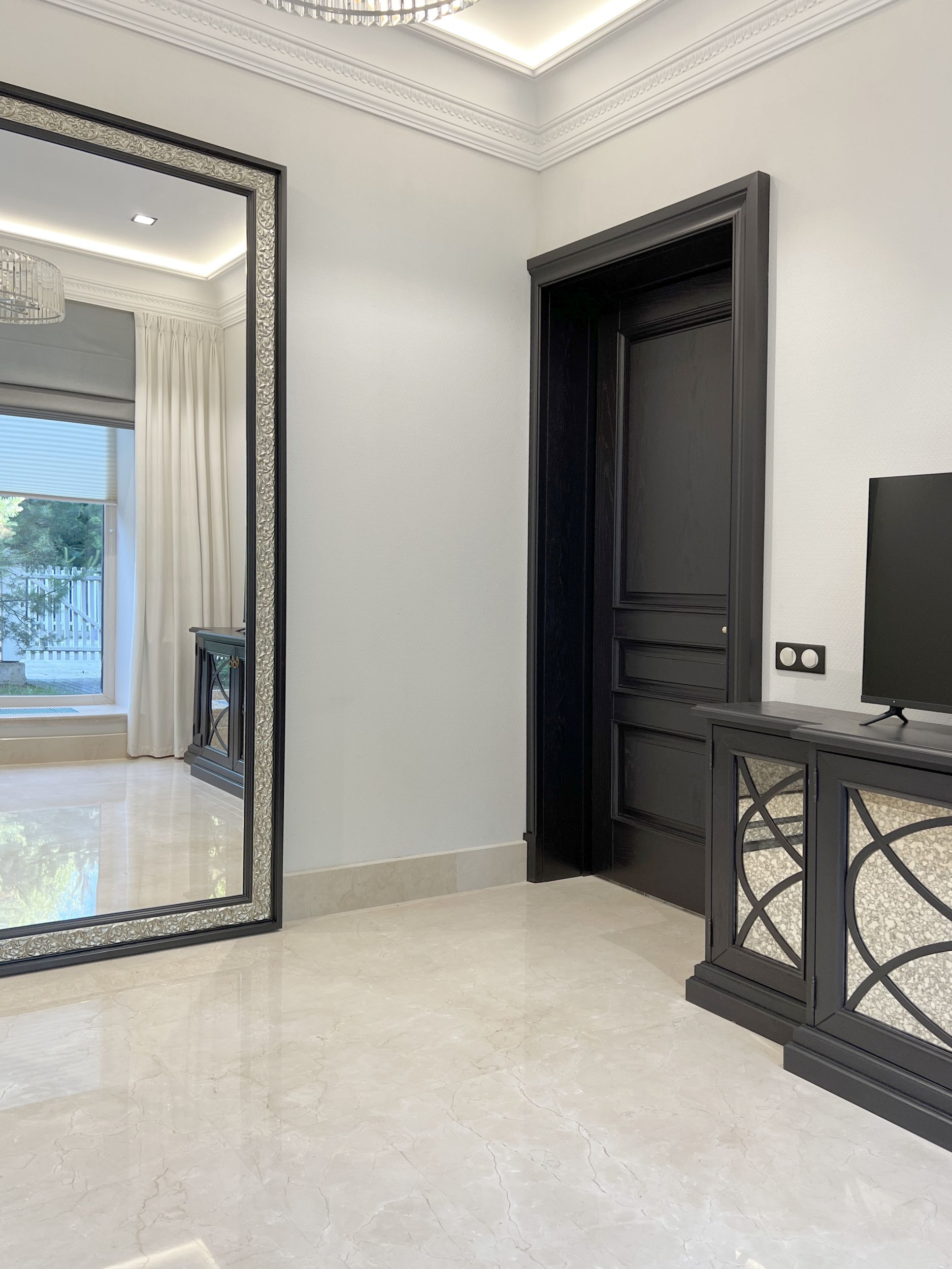 Светлый мрамор и темные двери в гостиной