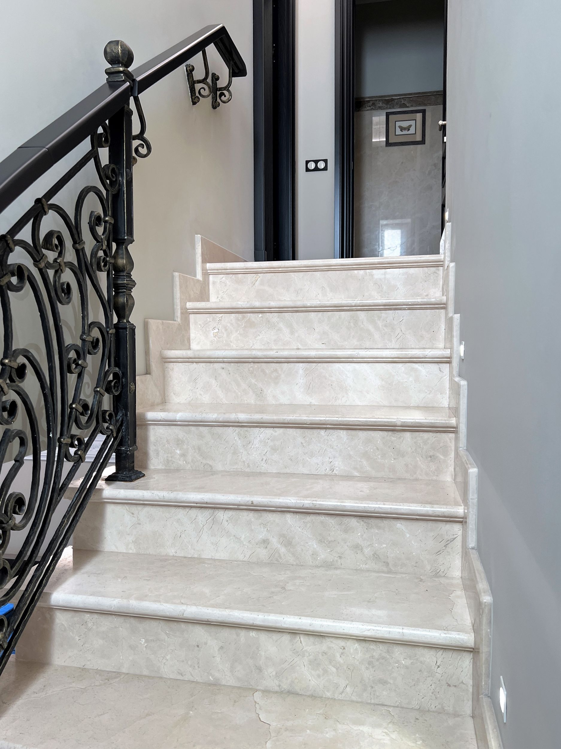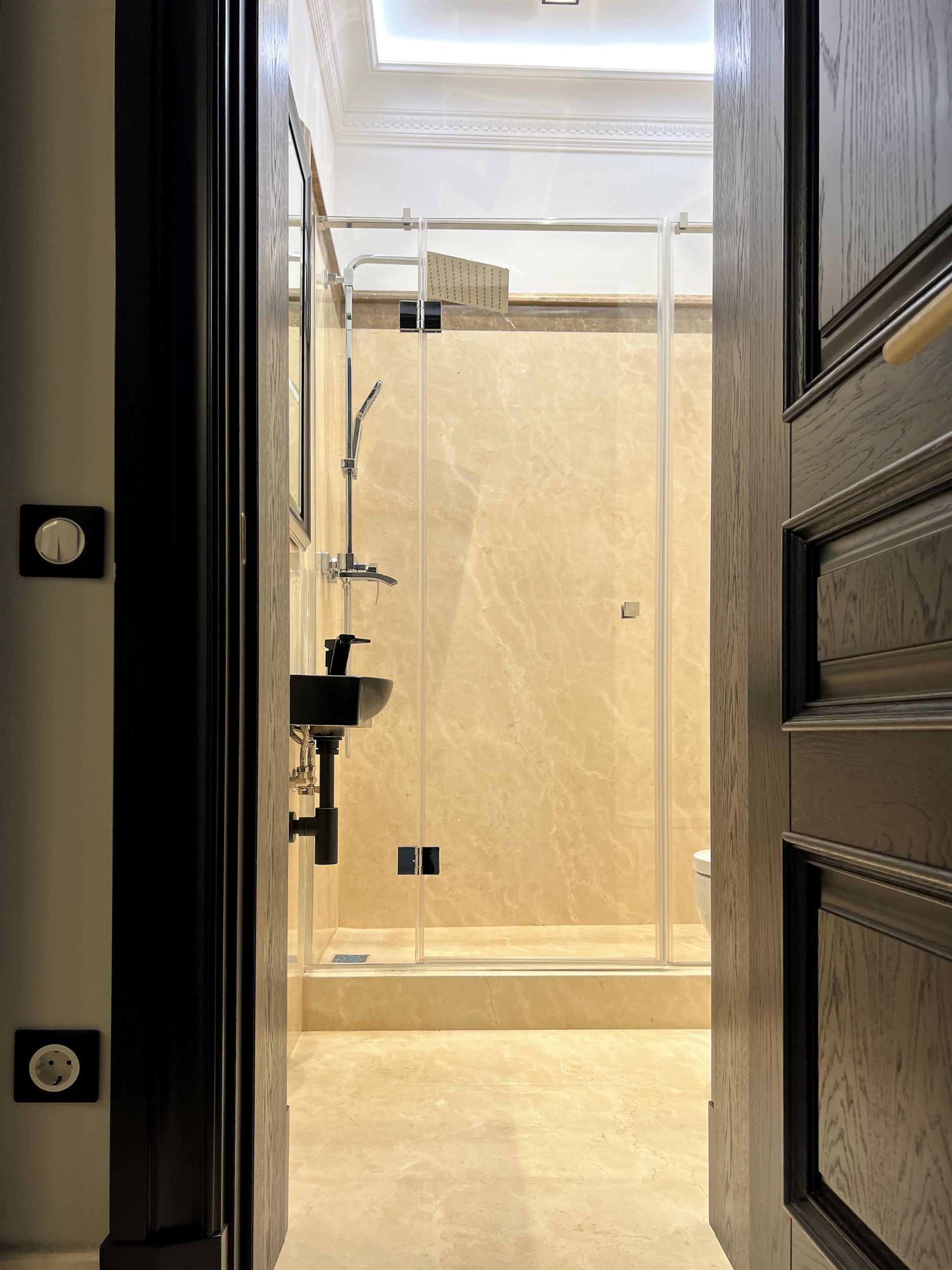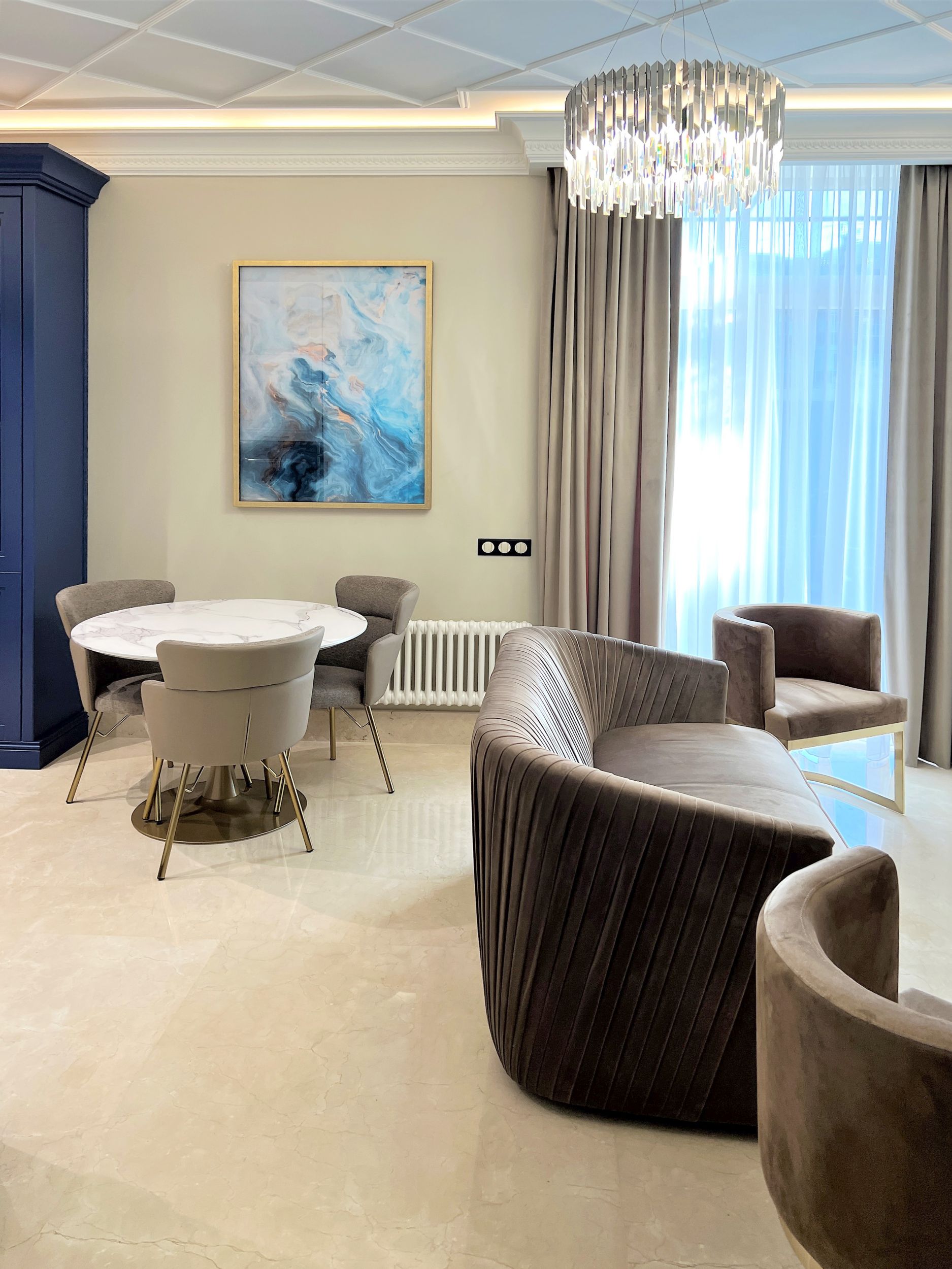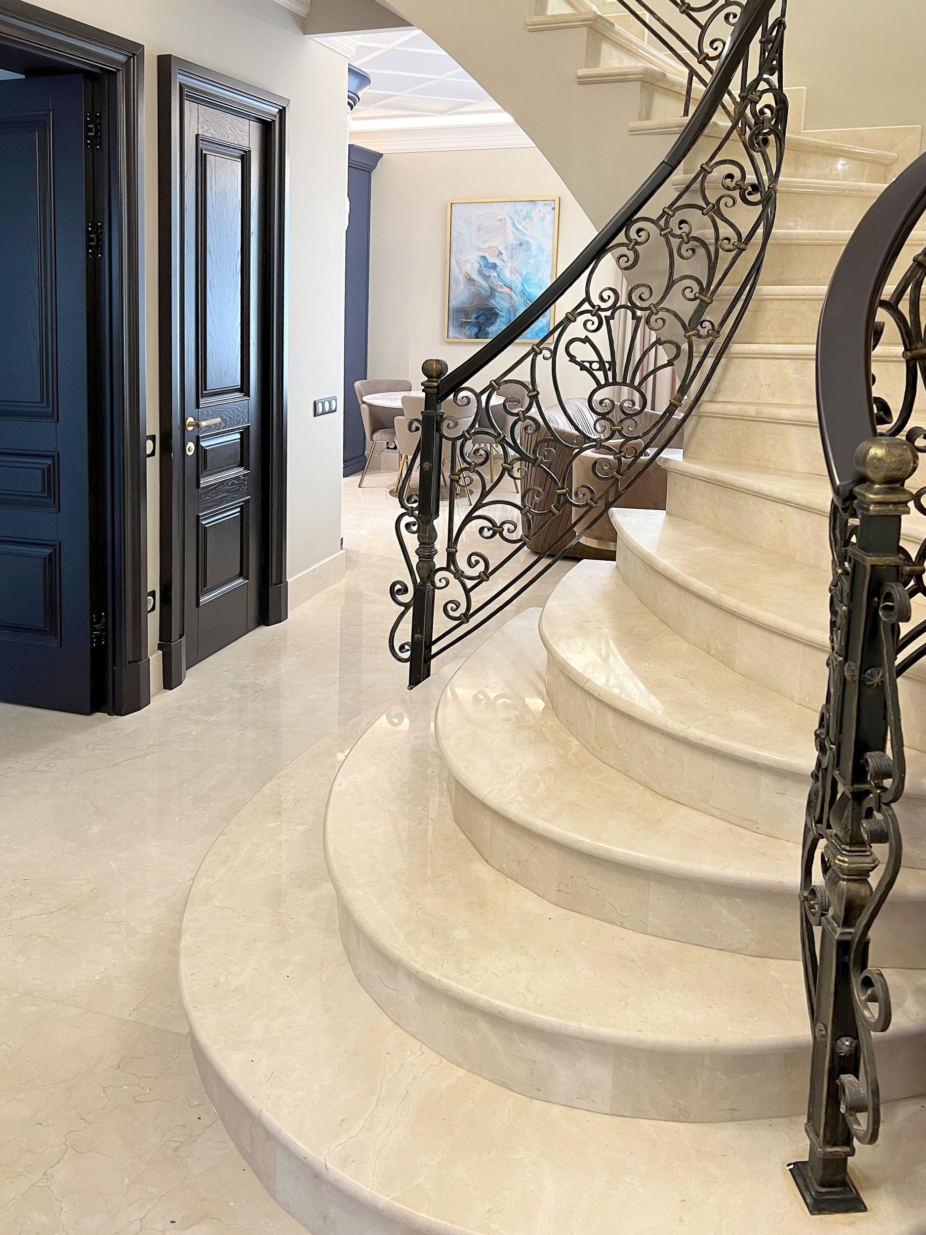 Светлый мрамор и темные двери в гостиной