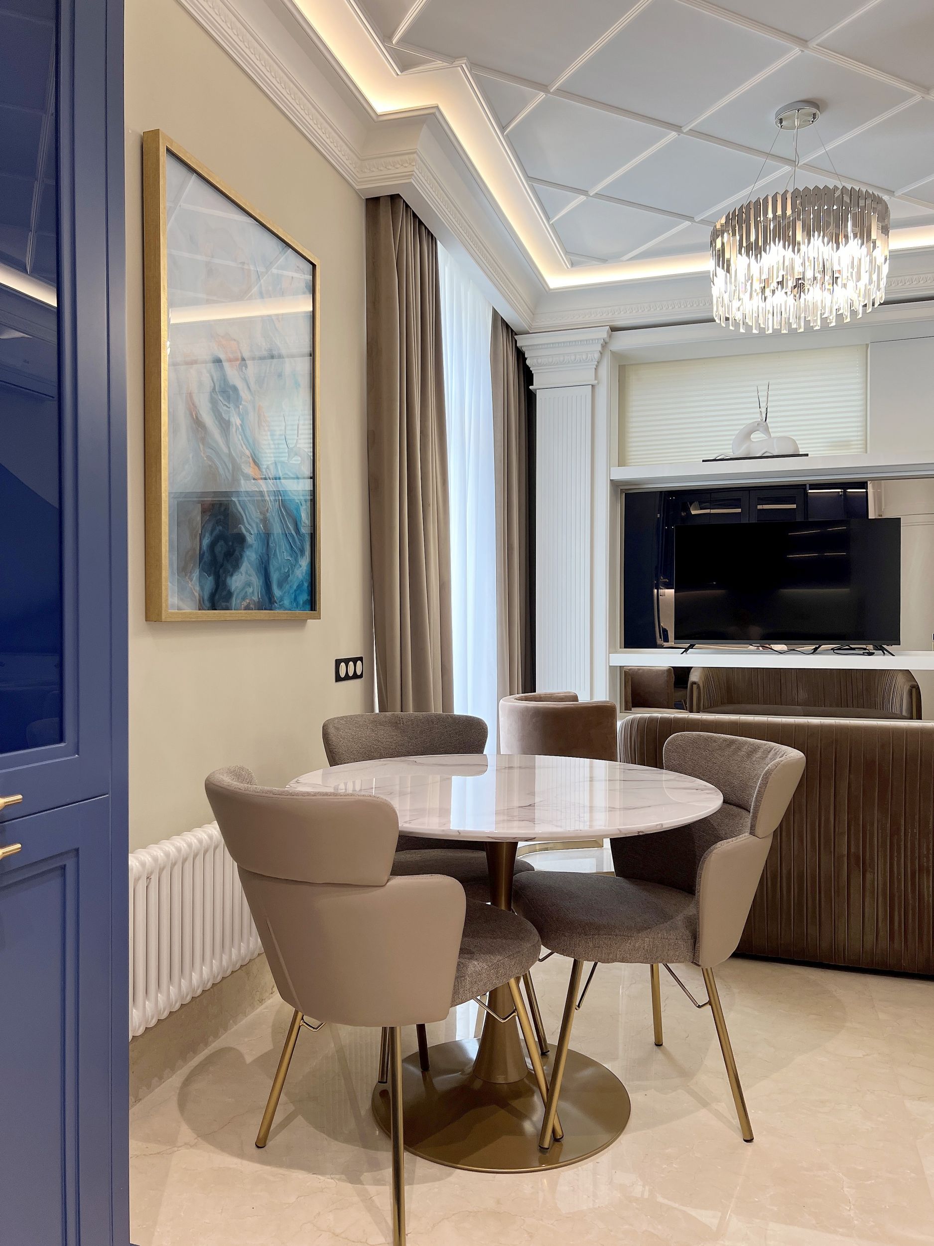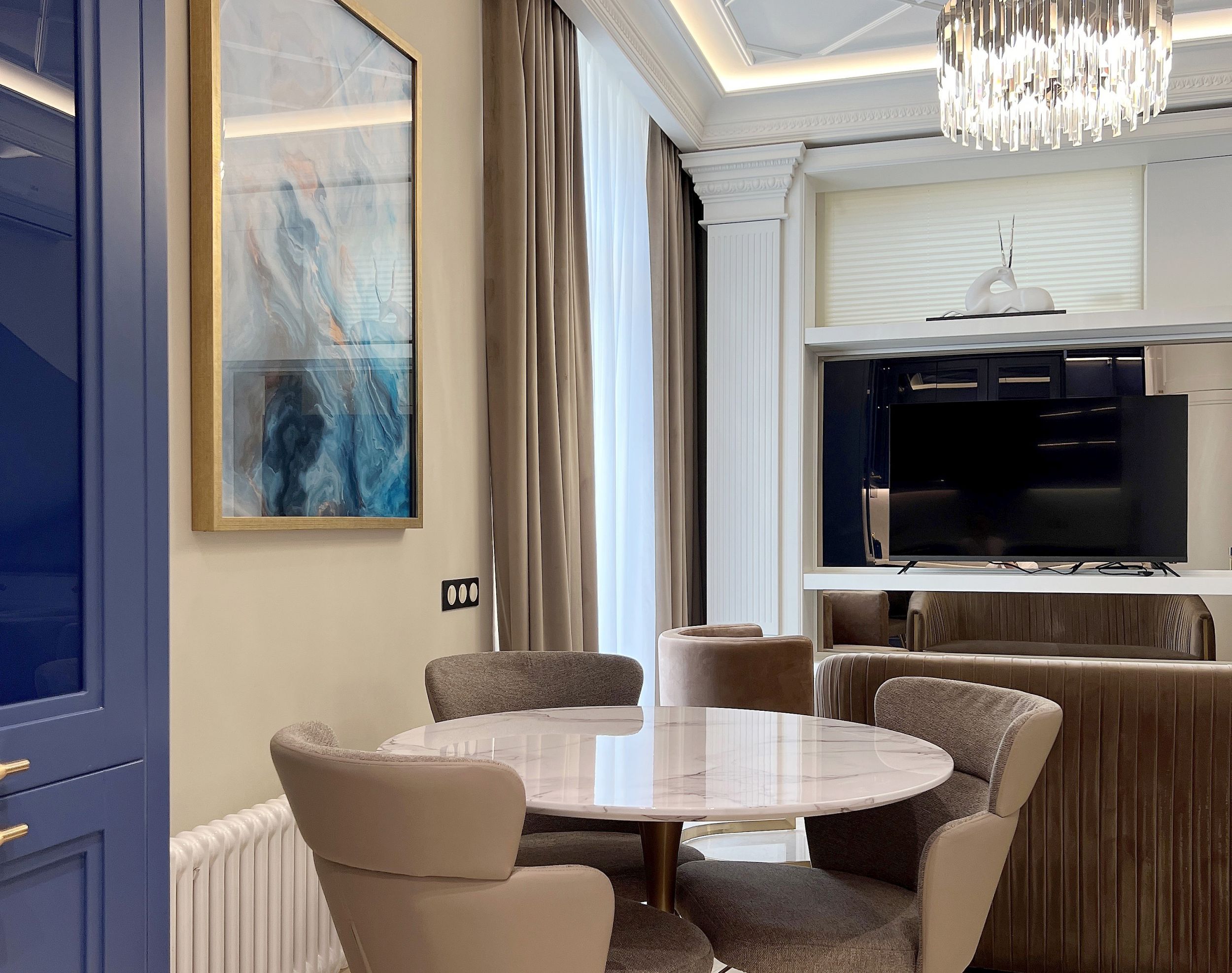 Дизайн бело-бежевой гостиной с синим шкафом