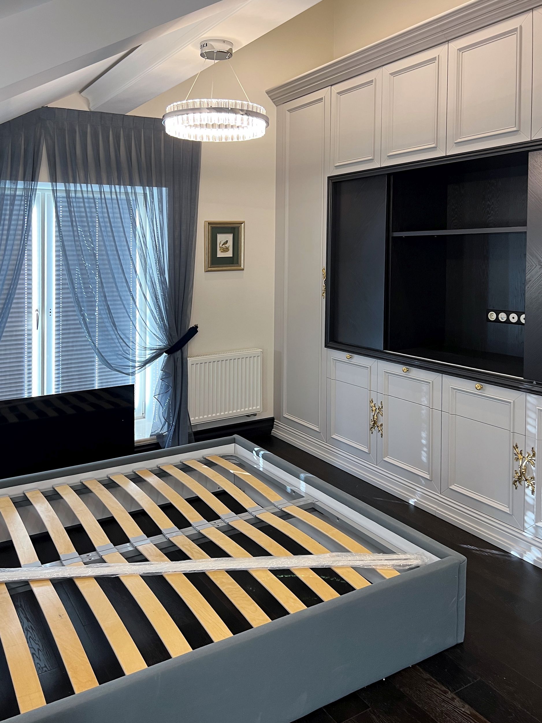 Светлая спальня с черной кроватью