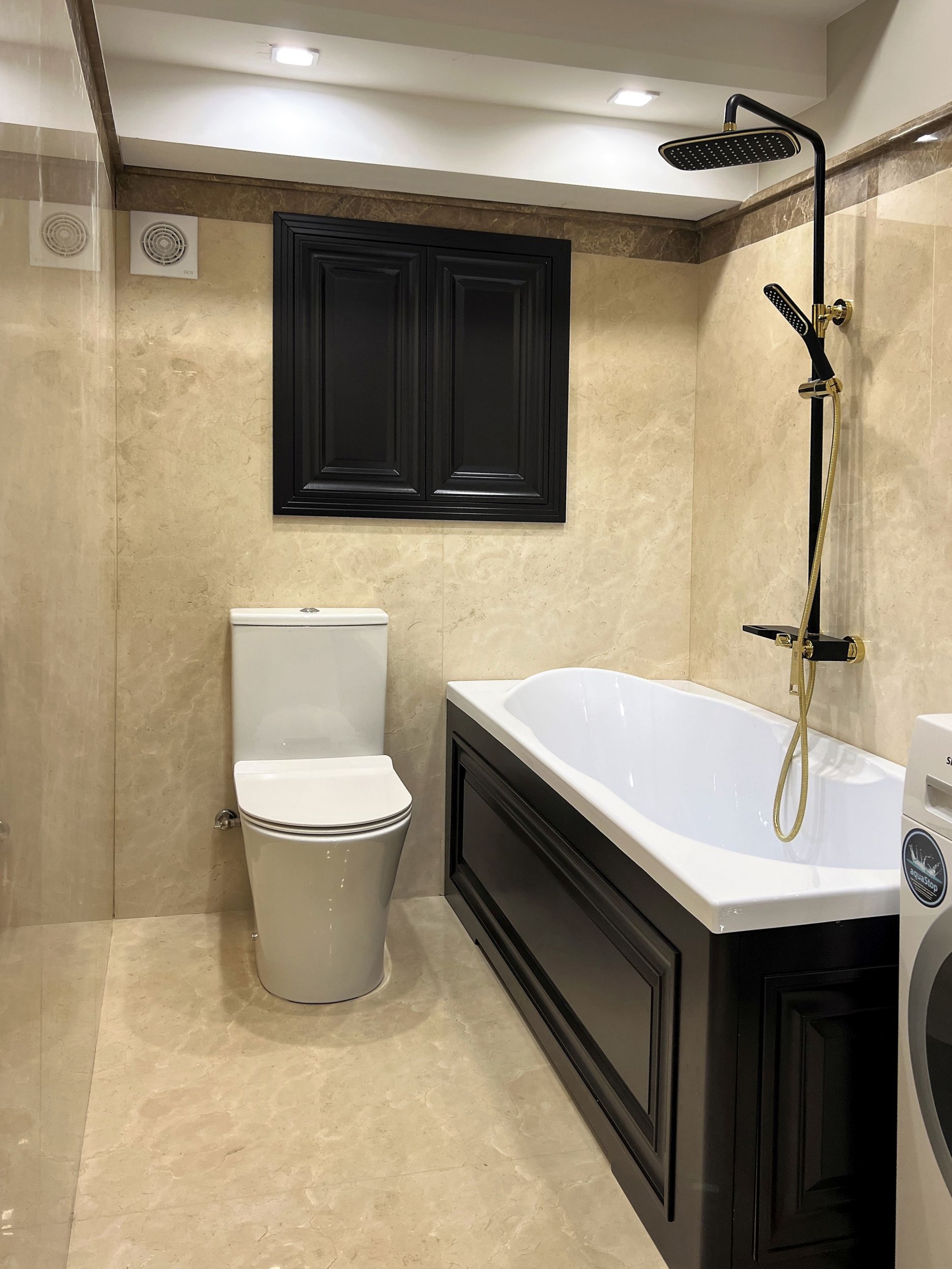 Душевая кабина в черно-бежевой ванной комнате