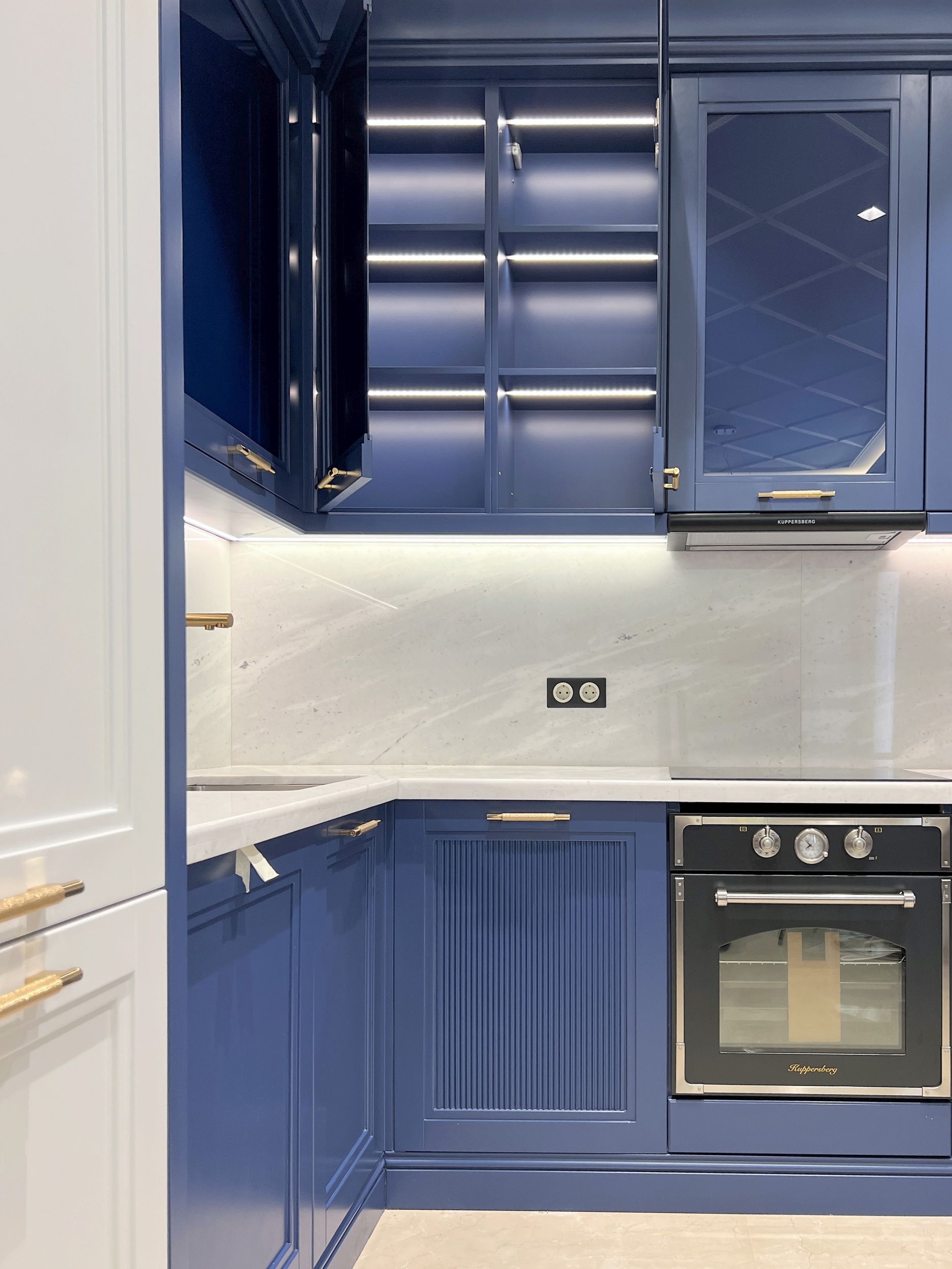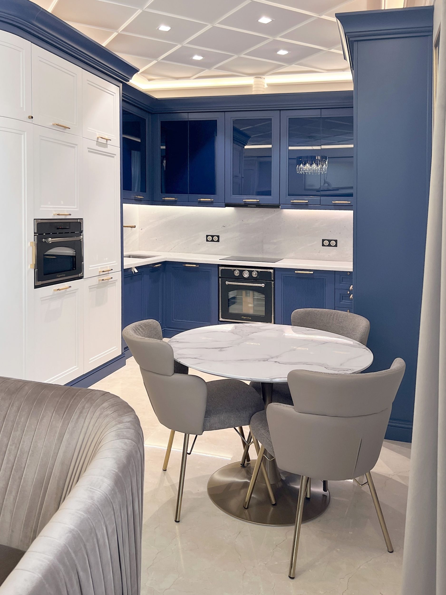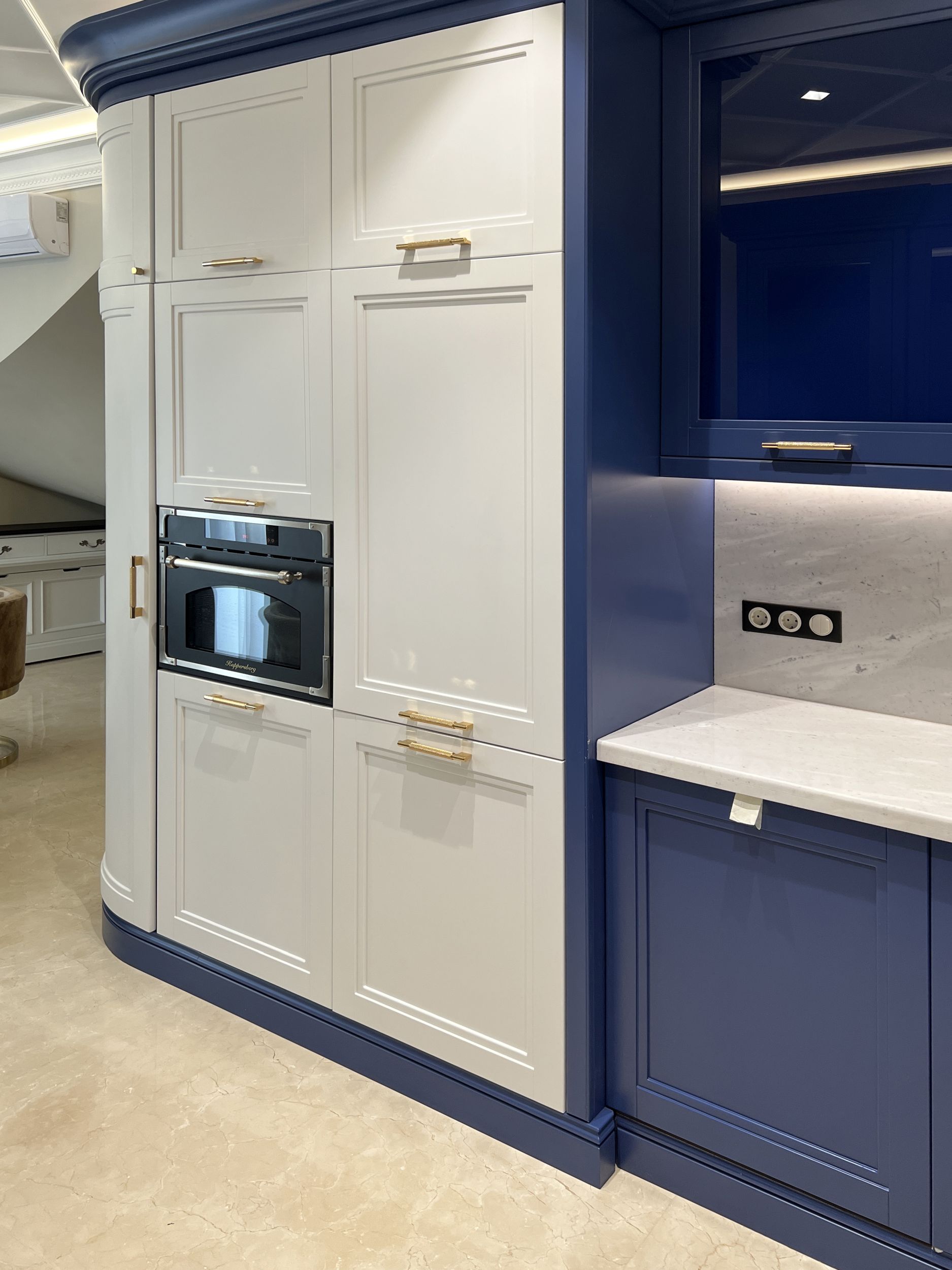 Бело-синяя кухня с золотистыми ручками