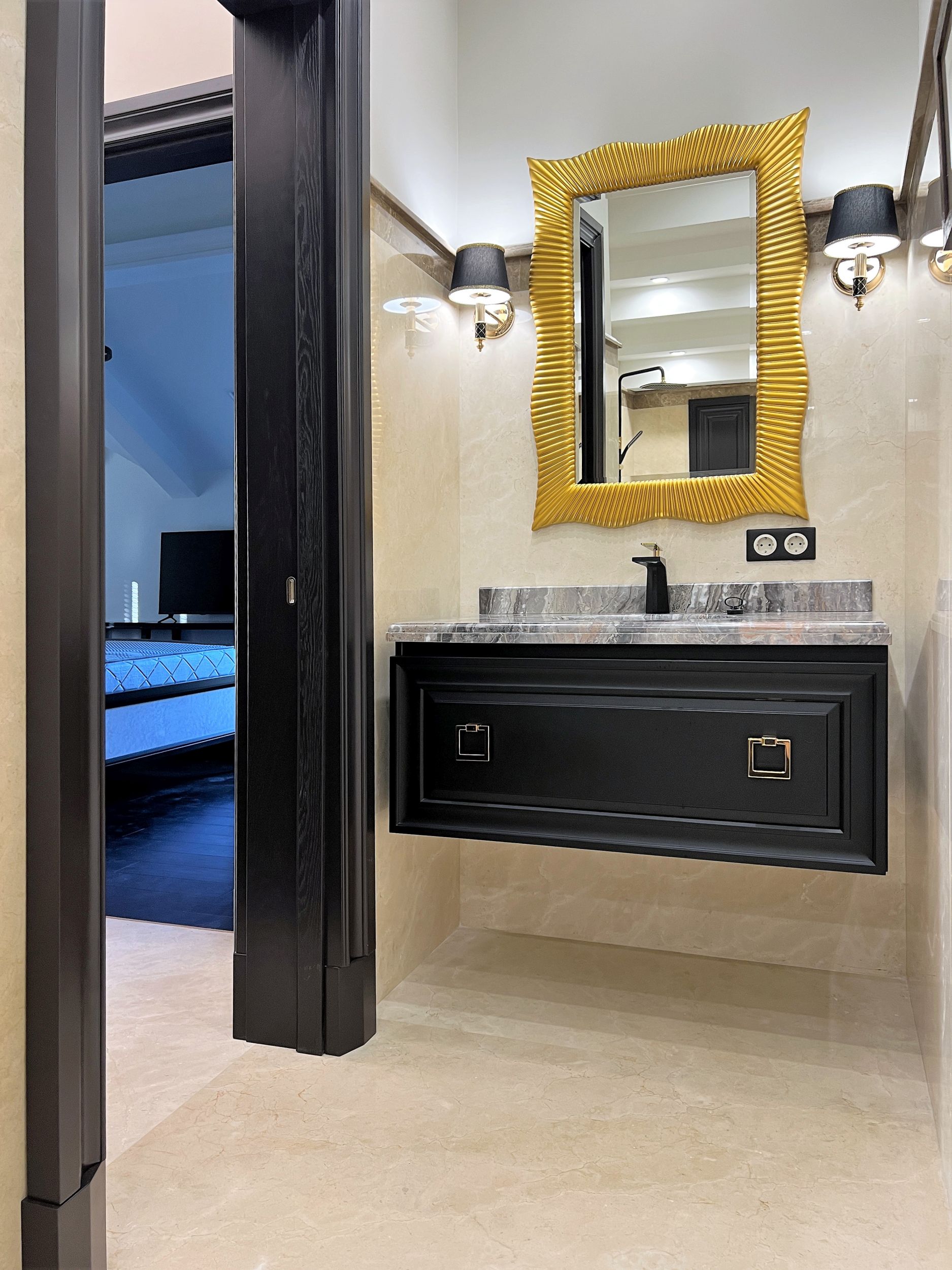 Зеркало с золотистым багетом в дизайне ванной