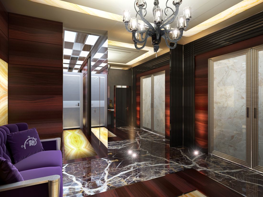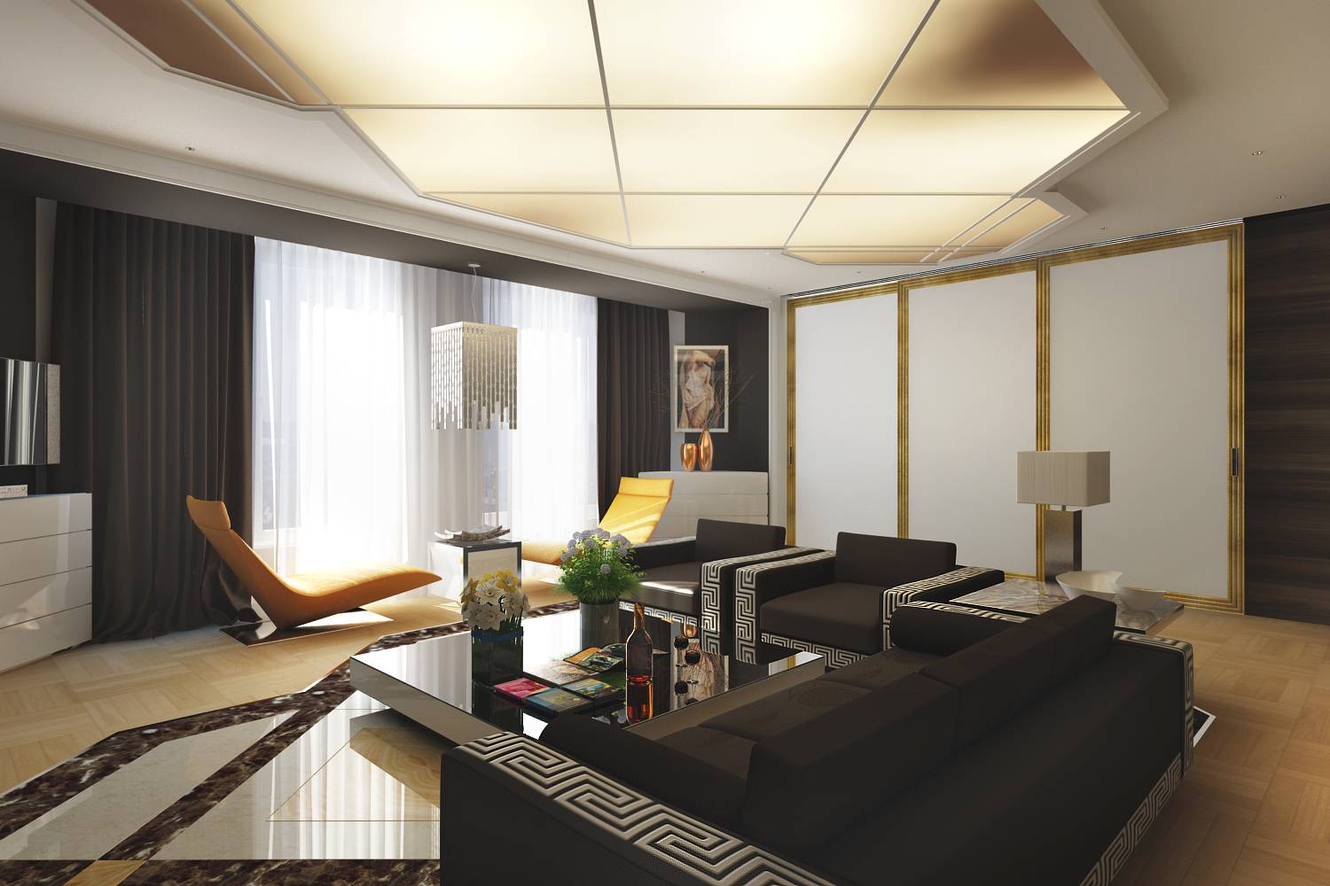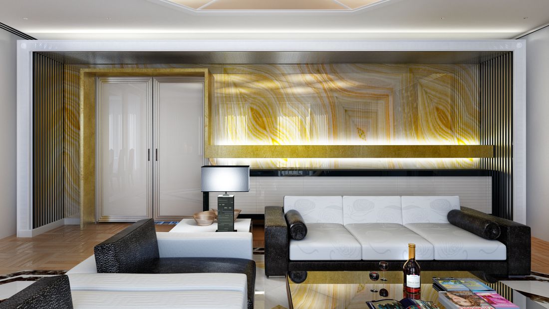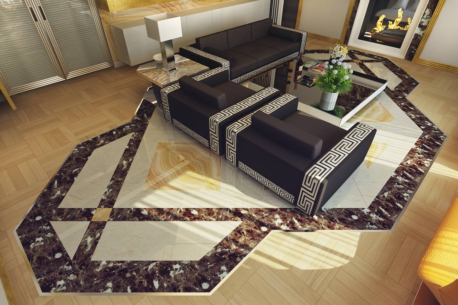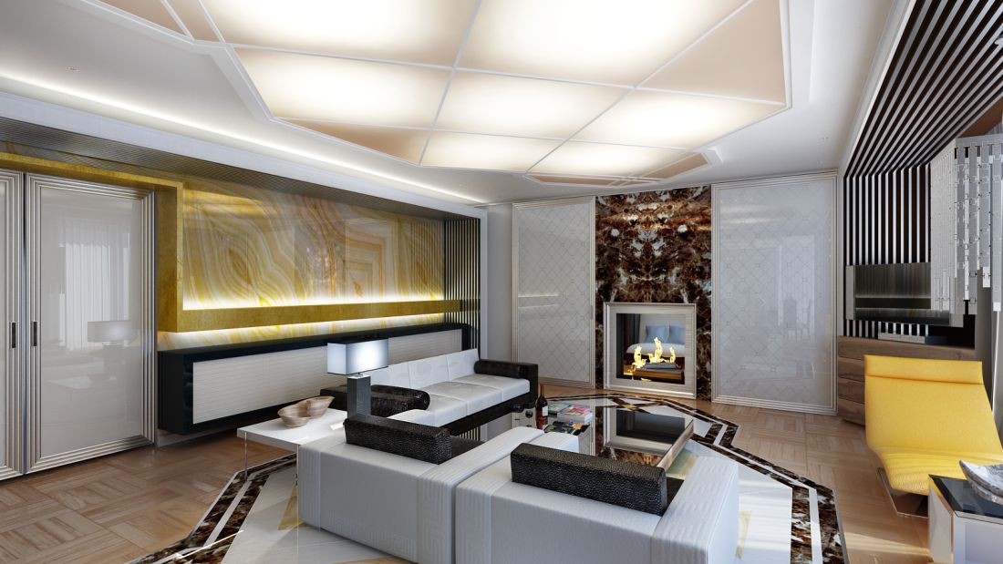 Пол в зоне отдыха украшен орнаментом из светло-желтого и белого мрамора с контрастной окантовкой. Контуры рисунка повторяет композиция потолочных панелей. Глянцевые светло-желтые поверхности с мраморной фактурой акцентируют внимание на стене. У панорамного окна организована еще одна зона отдыха – с обращенными друг к другу креслами а-ля шезлонг и журнальным столиком.