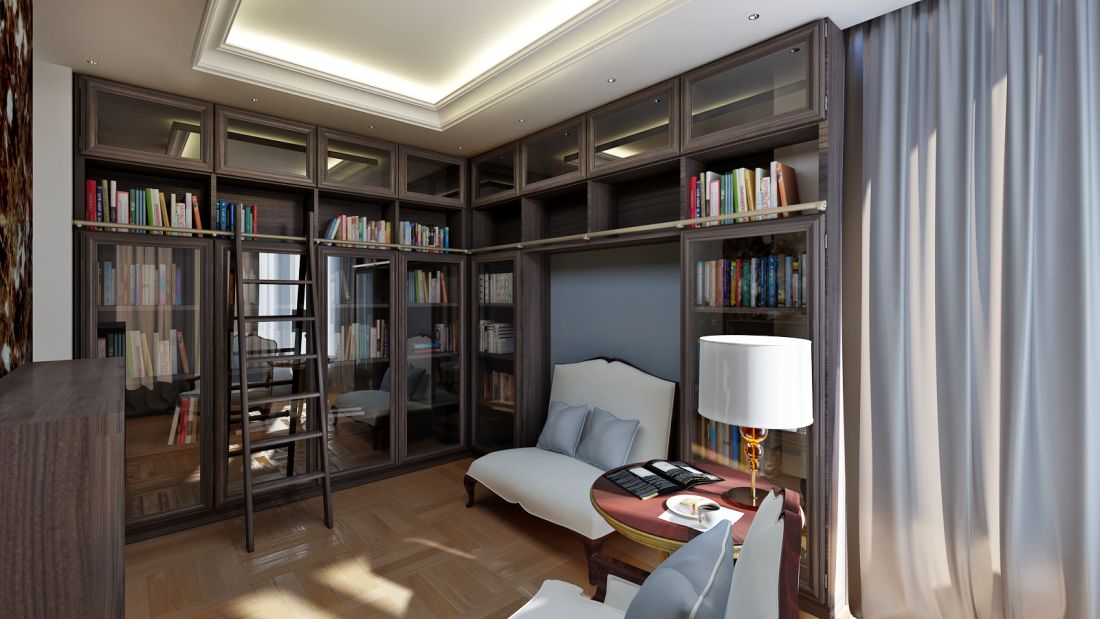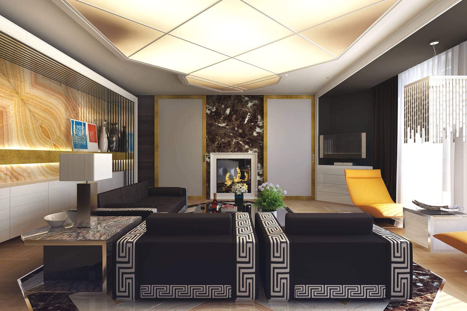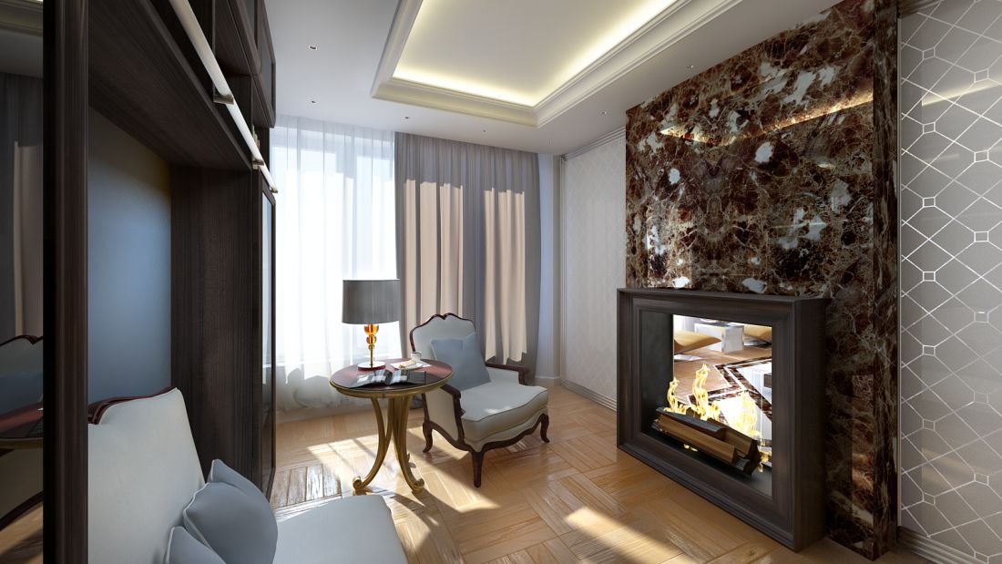Портал декоративного камина в дальней стене гостиной выполнен с прозрачной внутренней стенкой, сквозь которую видно помещение соседней библиотеки. Сам портал встроен в нишу, отделанную темно-коричневым мрамором, на контрасте с ним звучат глянцевые панели оттенка слоновой кости, расположенные по обеим сторонам.