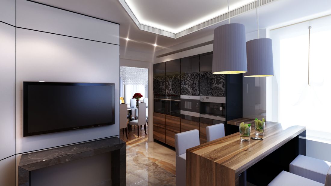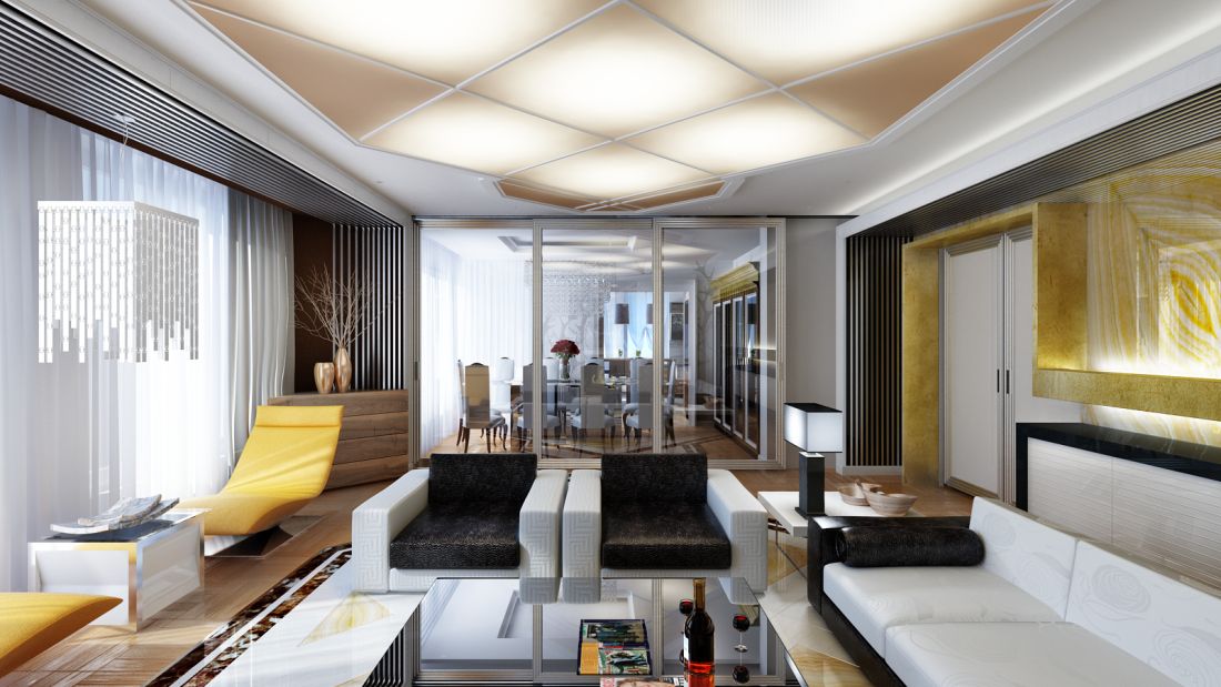 В одном из вариантов оформления гостиная зрительно объединяется со столовой и кухней за счет прозрачных раздвижных перегородок на границе зон. Во втором варианте предлагается сохранить автономность интерьера гостиной и выполнить перегородку из матово белых полотен.