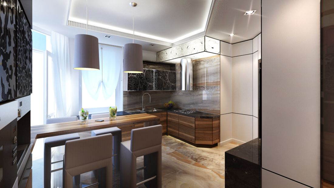 Глянцевый мрамор на полу кухни переходит в отделку фартука и стены над рабочей зоной. Зеркала и мрамор украшают также спальную комнату.