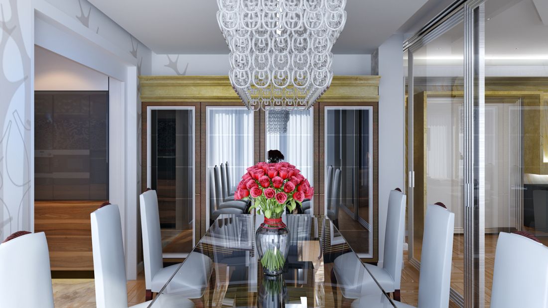 В декоративном оформлении интерьера активно используются глянцевые, зеркальные и прозрачные поверхности. Торцевая стена в столовой закрыта целым рядом вертикальных зеркал, обеденный стол имеет стеклянную столешницу.