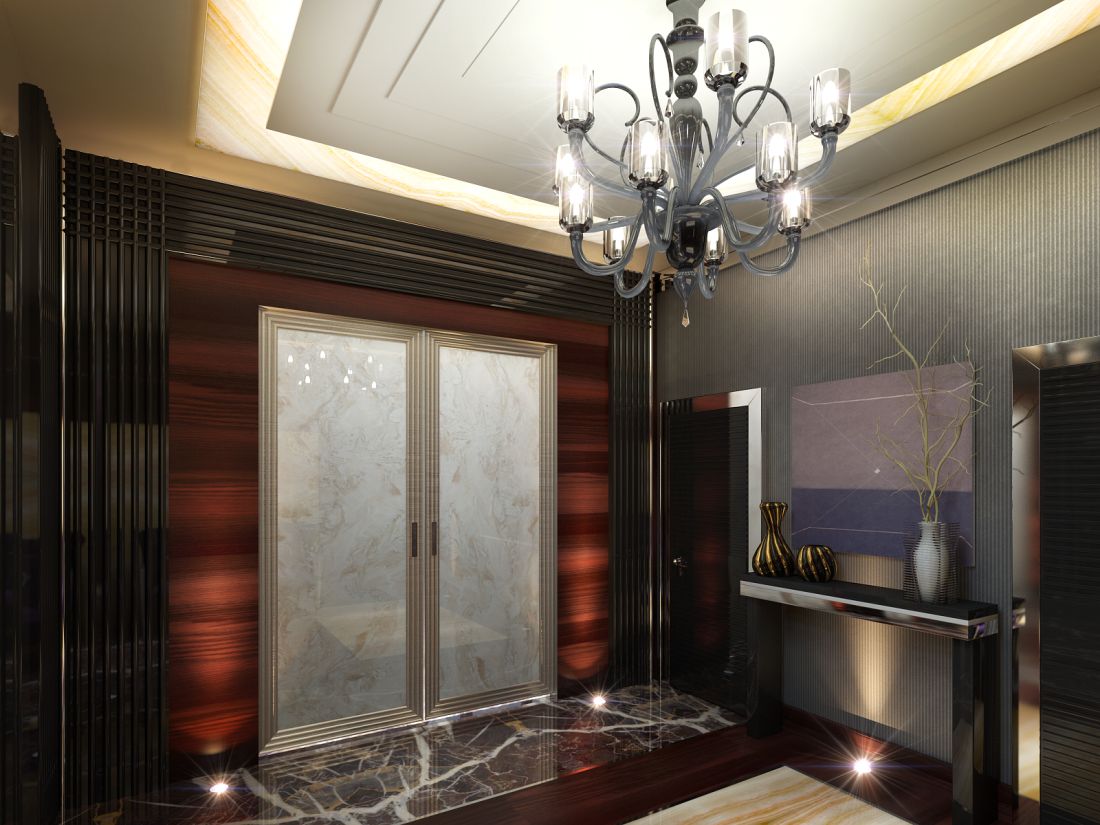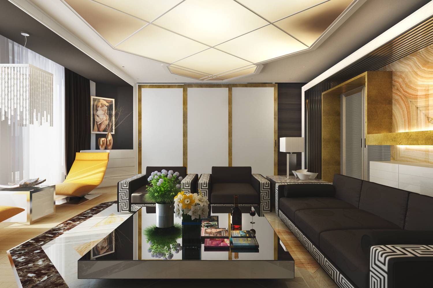 Респектабельный интерьер в стилистике ар-деко – с открытым оформлением пространства и дорогими материалами.