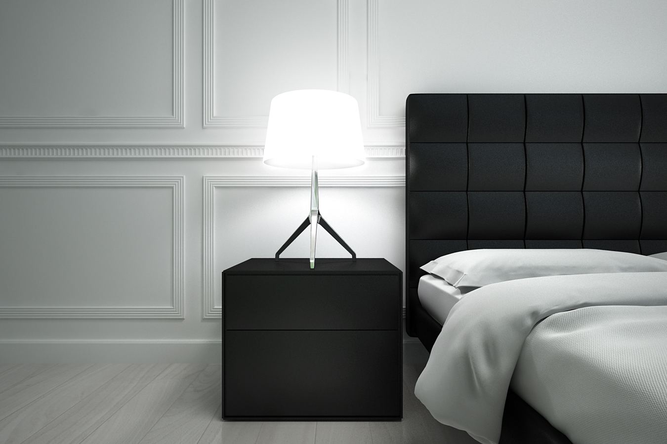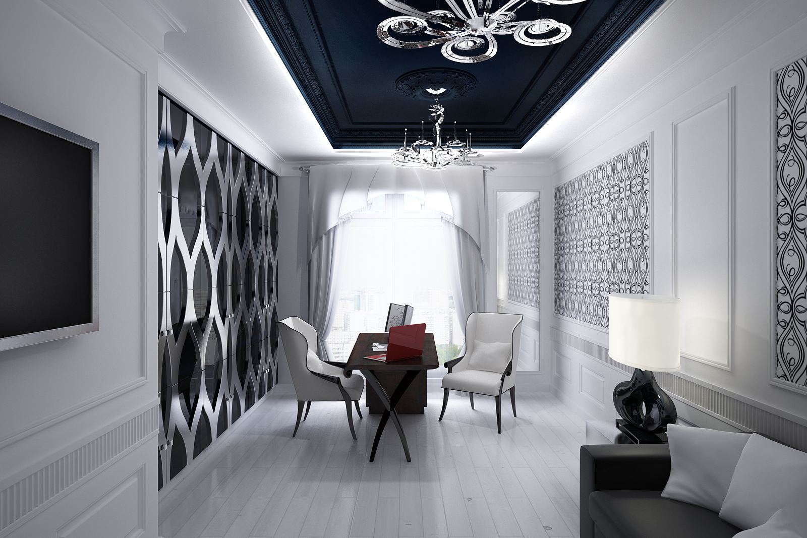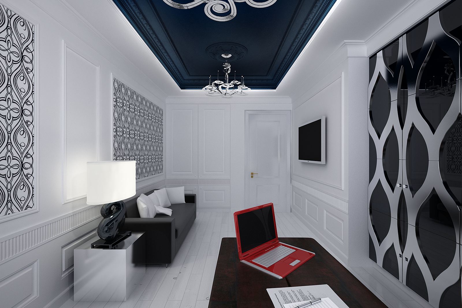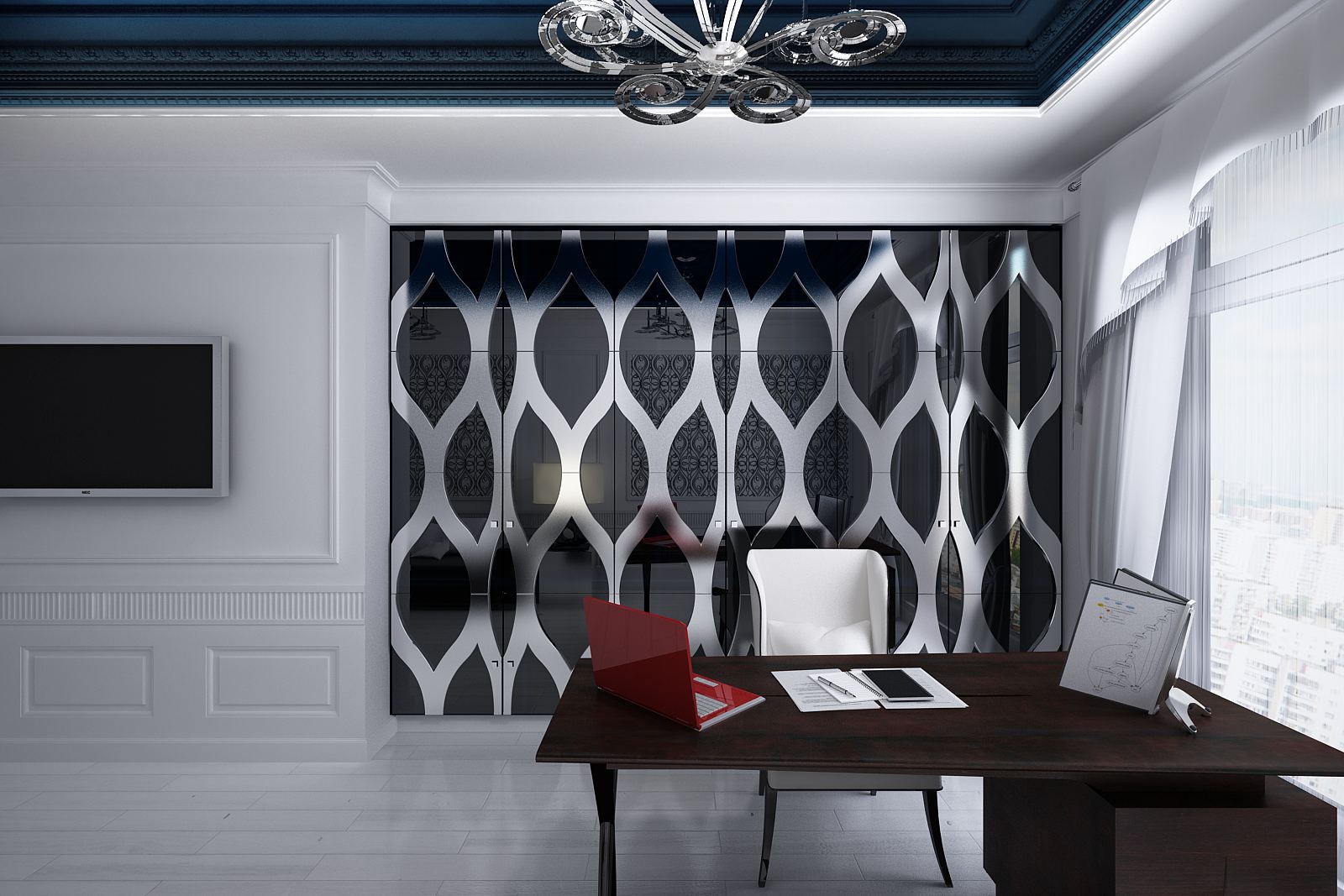 Колористика кабинета более графична за счет активного использования черных глянцевых панелей и контрастных настенных панно. Такой же контрастной получится гостевая спальная комната в одном из вариантов оформления (в другом ее интерьер смягчен бронзово-желтыми оттенками).