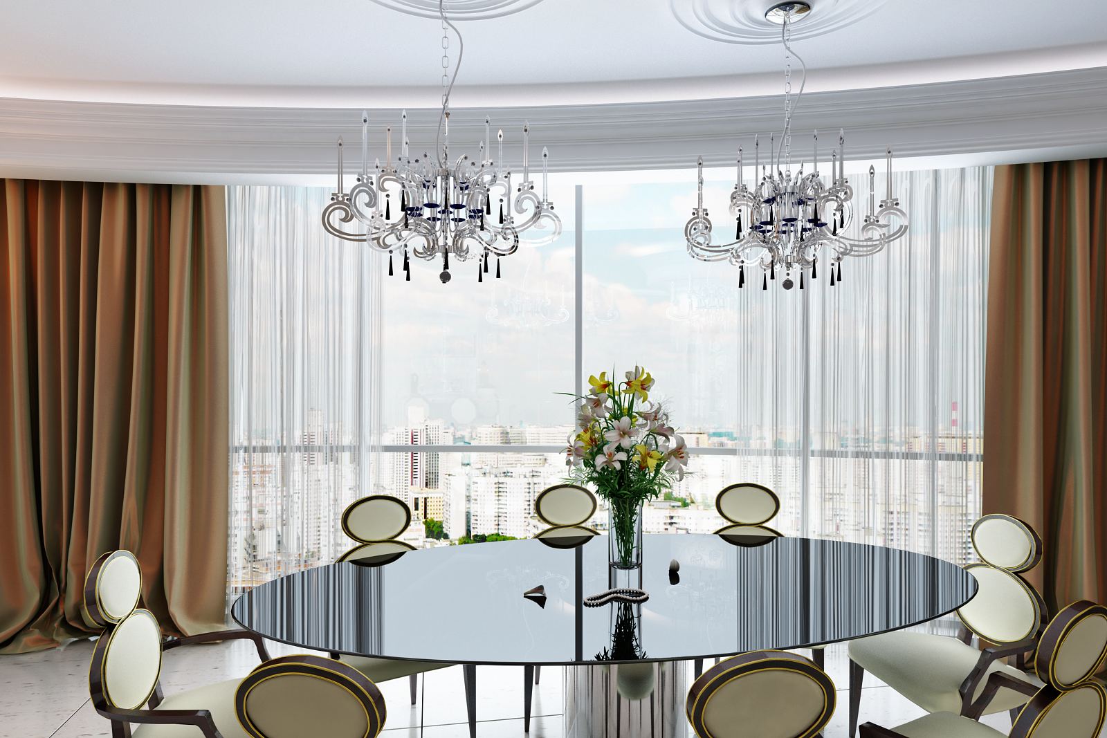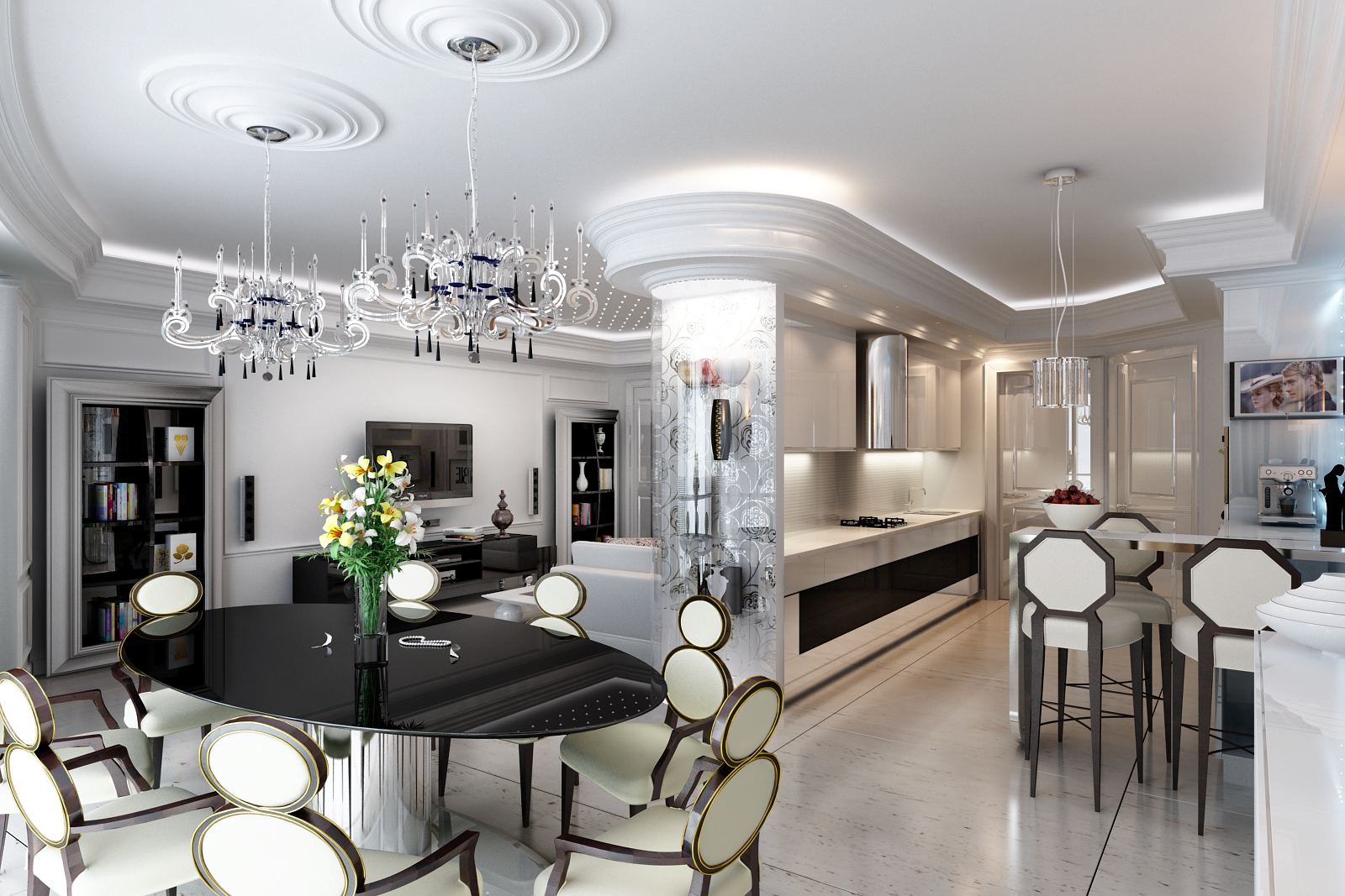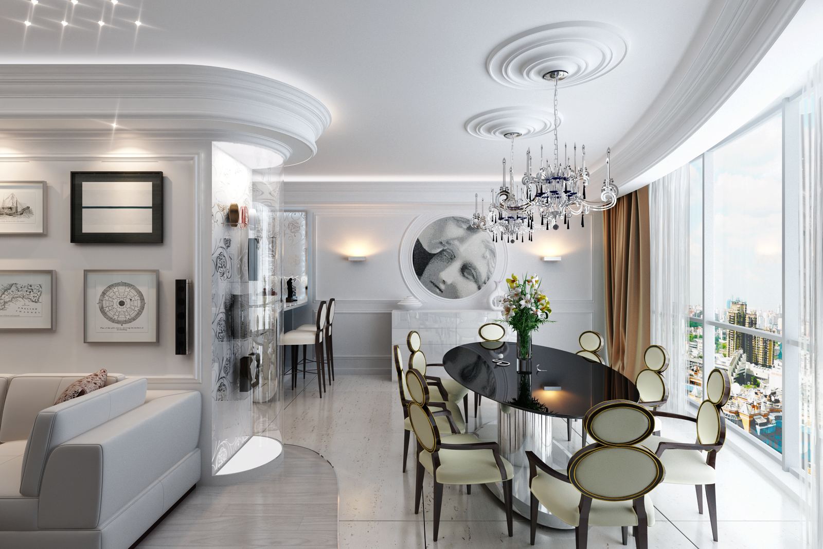 Современный интерьер в стиле эклектики построен на сочетании мотивов строгого минимализма, элегантной неоклассики и роскошного ар-деко.