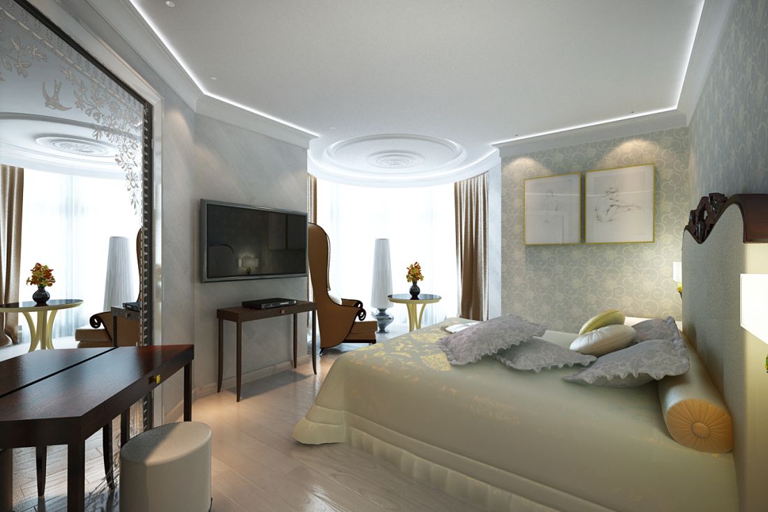 Сложная планировка хозяйской спальни обыграна широким зеркалом перед туалетным столиком и зоной будуара, организованной в эркерном выступе. Здесь царят нежно-голубые и кремовые тона.