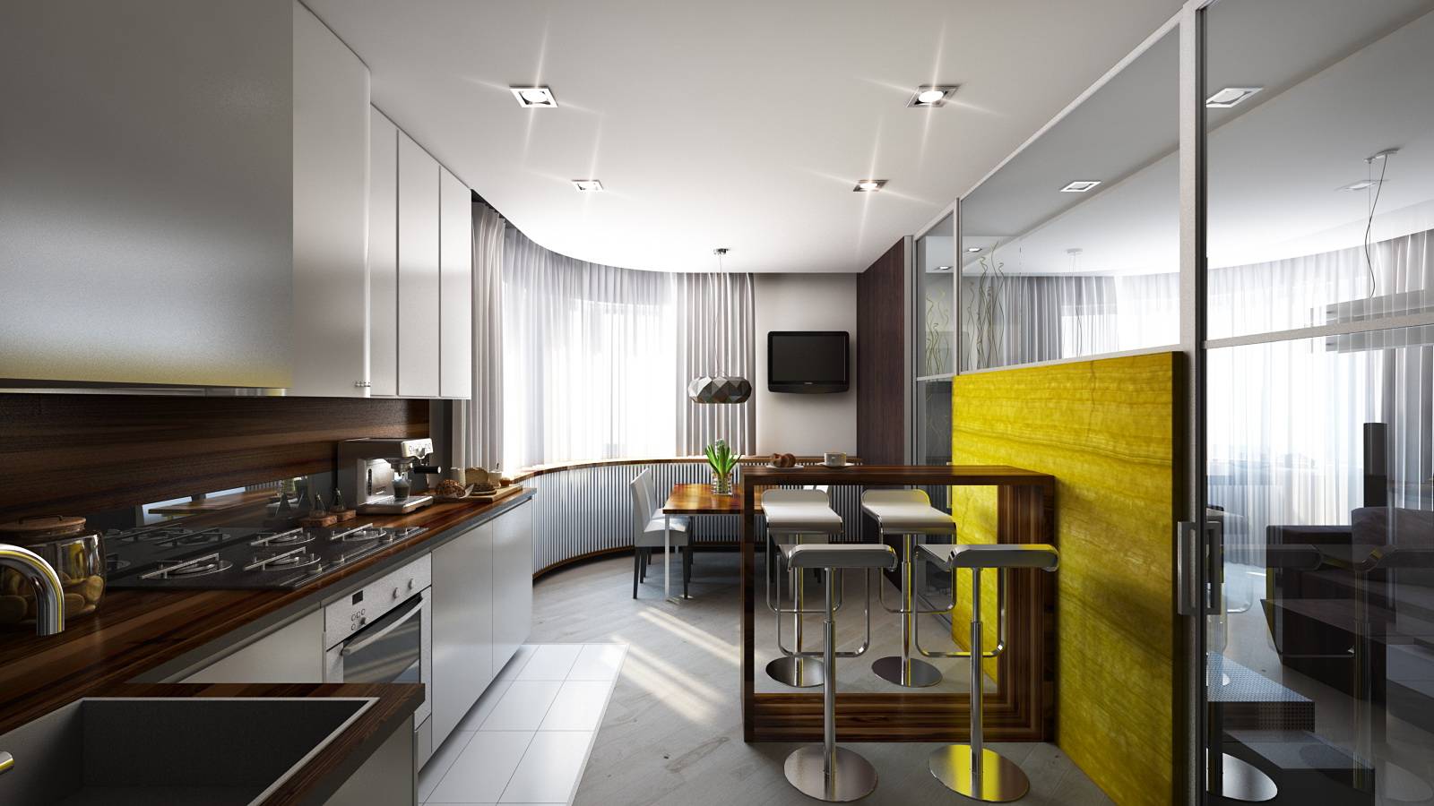 Зона кухни и столовой располагается автономно, но визуальное объединение с гостиной присутствует за счет использования широкой прозрачной перегородки на границе помещений. В центре перегородки — панель, отделанная ярко-желтым шпоном.