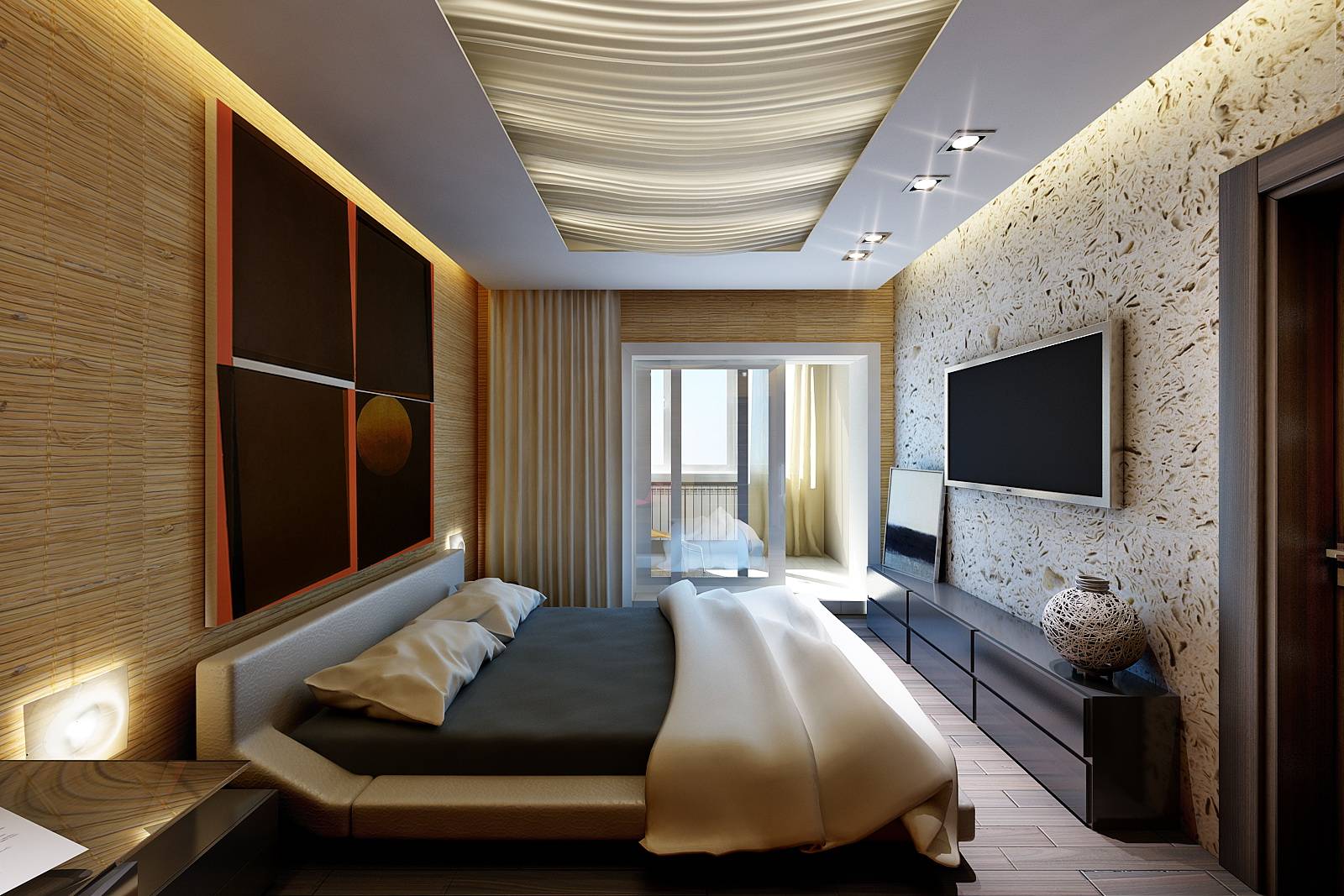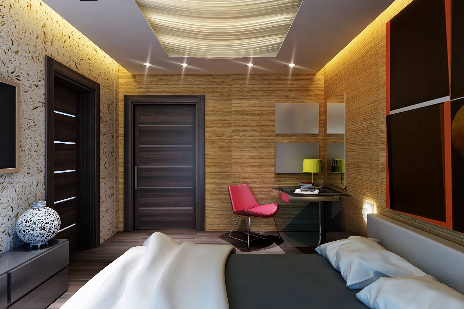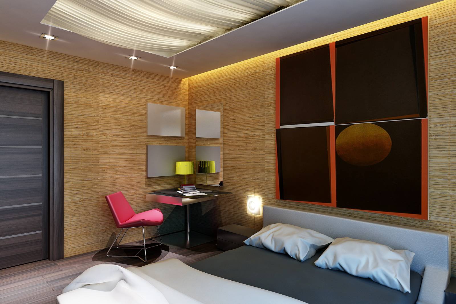 В спальне стены отделаны бамбуковыми обоями, а стена напротив кровати – пробковым покрытием. Материалы задали цветовое исполнение интерьера: нейтральное, светло-бежевое.
