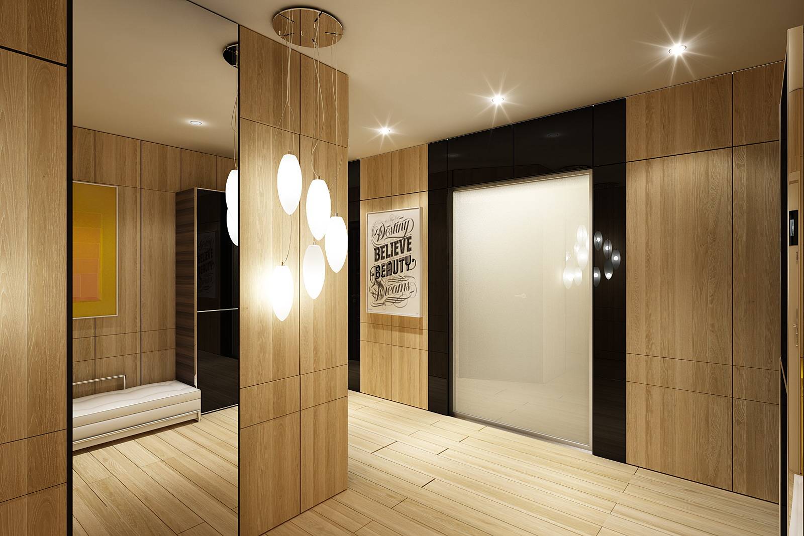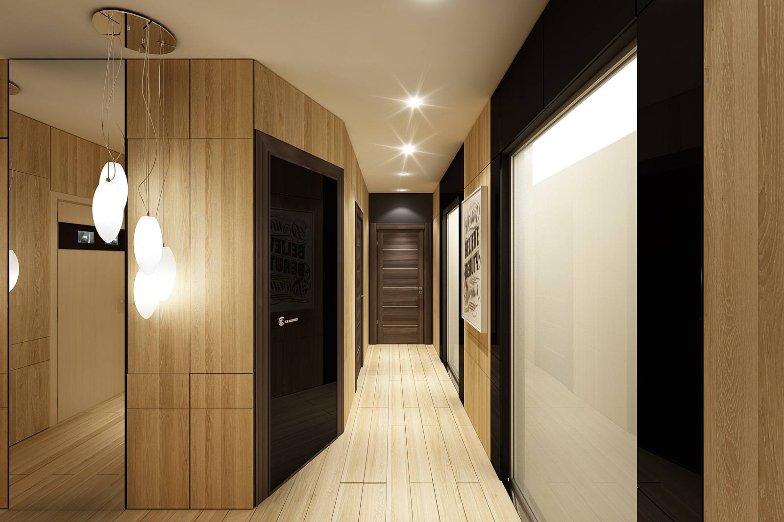 Деревянными панелями обшиты стены прихожей и коридора, пол покрыт светло-бежевым ламинатом. Две ниши с контрастными контурами и молочно-белым матовым стеклом разбивают длинный узкий проход, акцентируя внимание на себе.