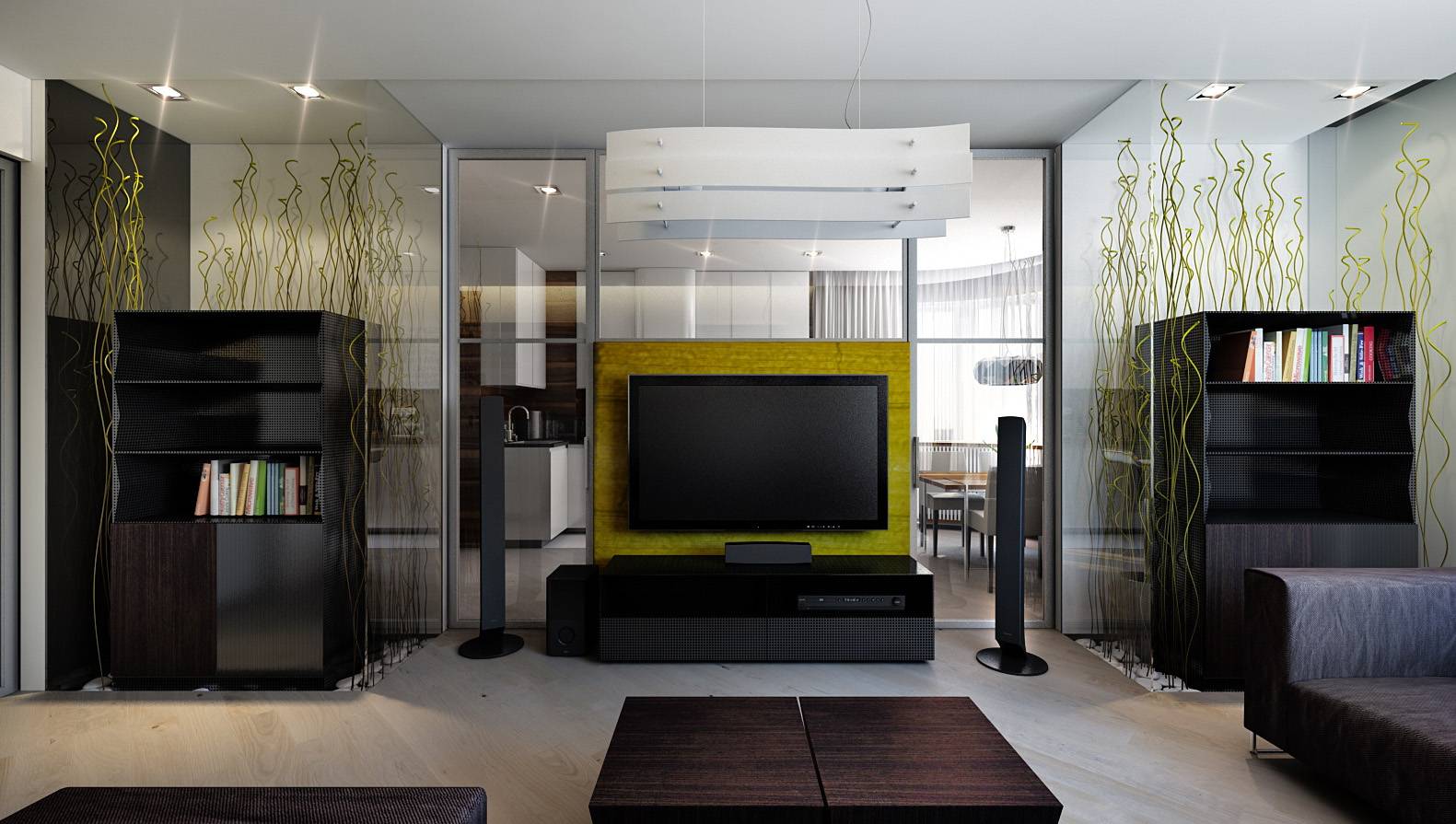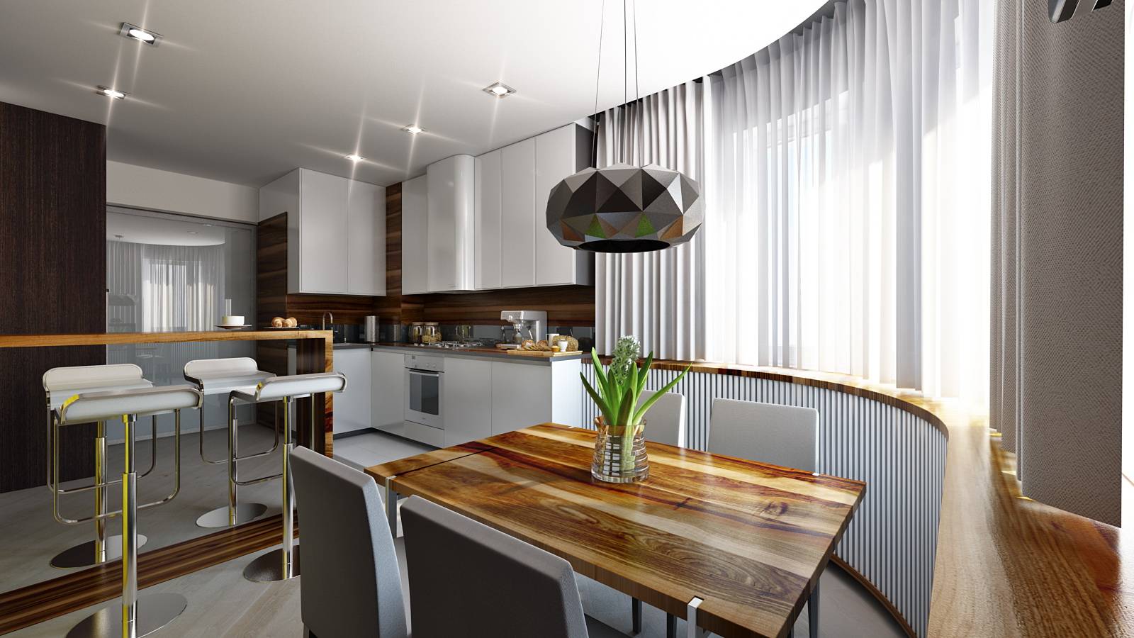 Современный интерьер квартиры в стиле модерн с четкими формами и акцентами на природные фактуры.