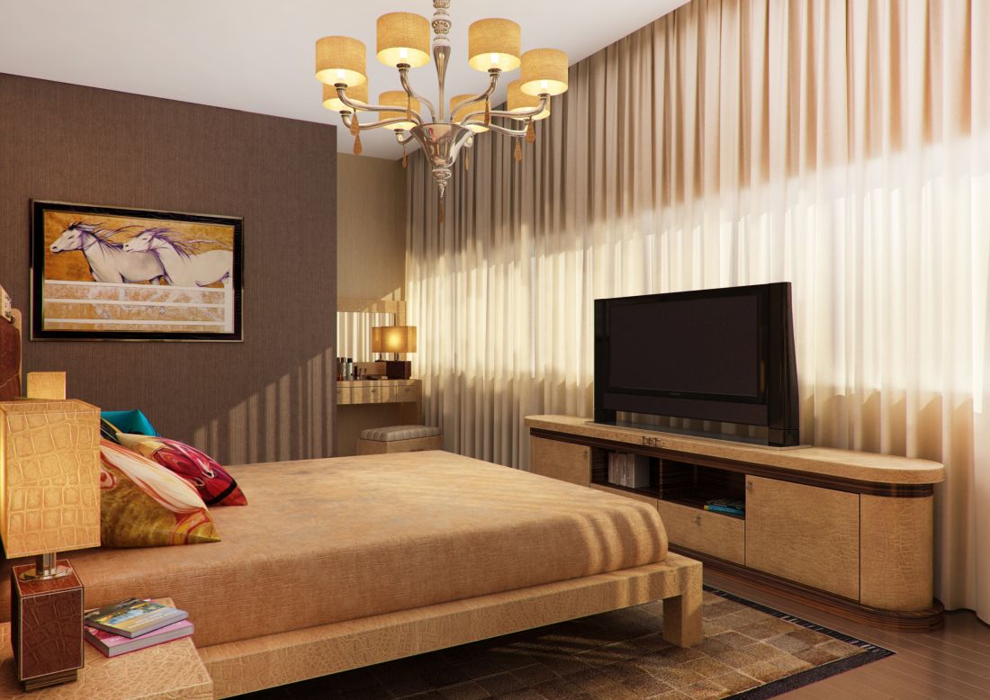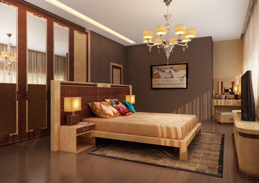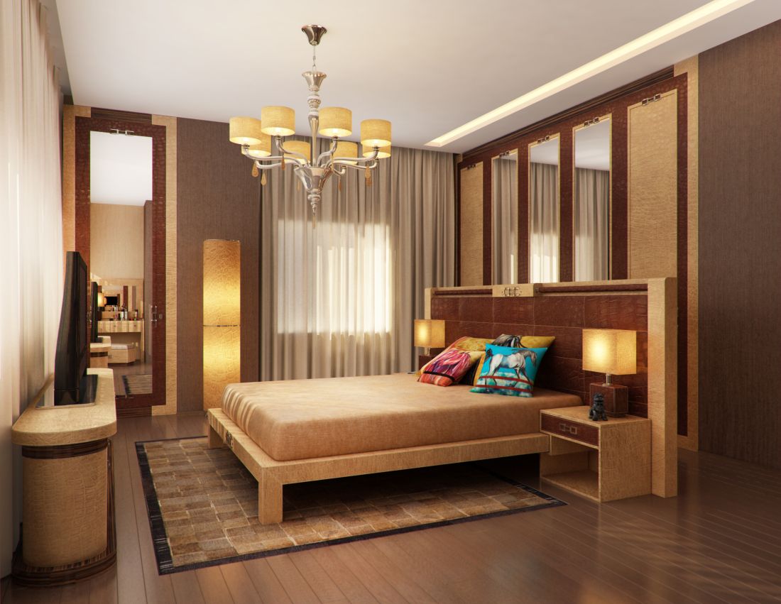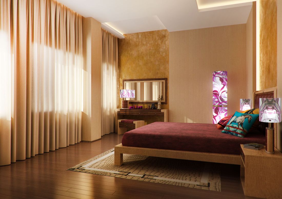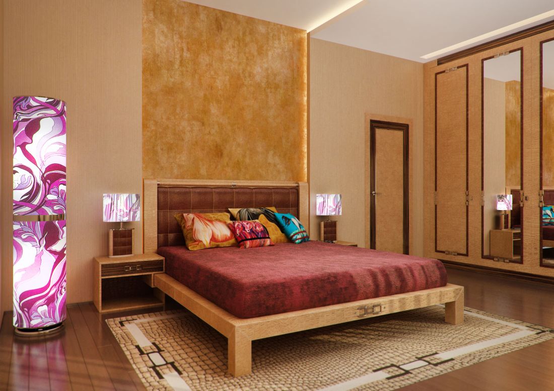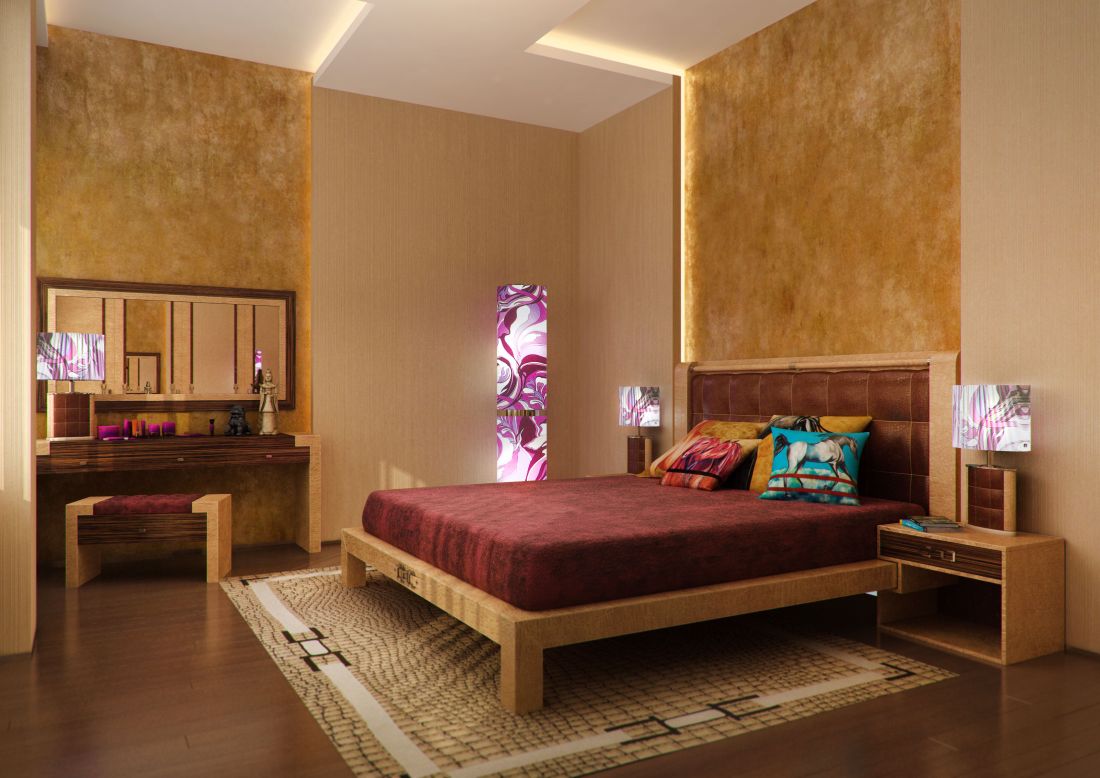 Отделка стен фактурной штукатуркой (за кроватью и туалетным столиком), дополненная подсветкой, включает в цветовую гамму комнаты теплый коричневый оттенок.