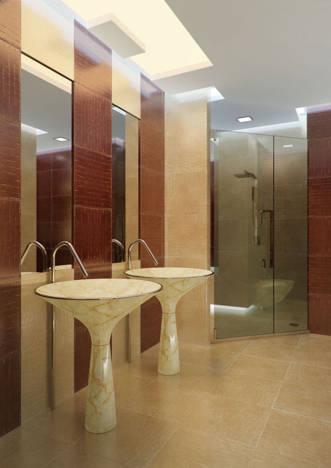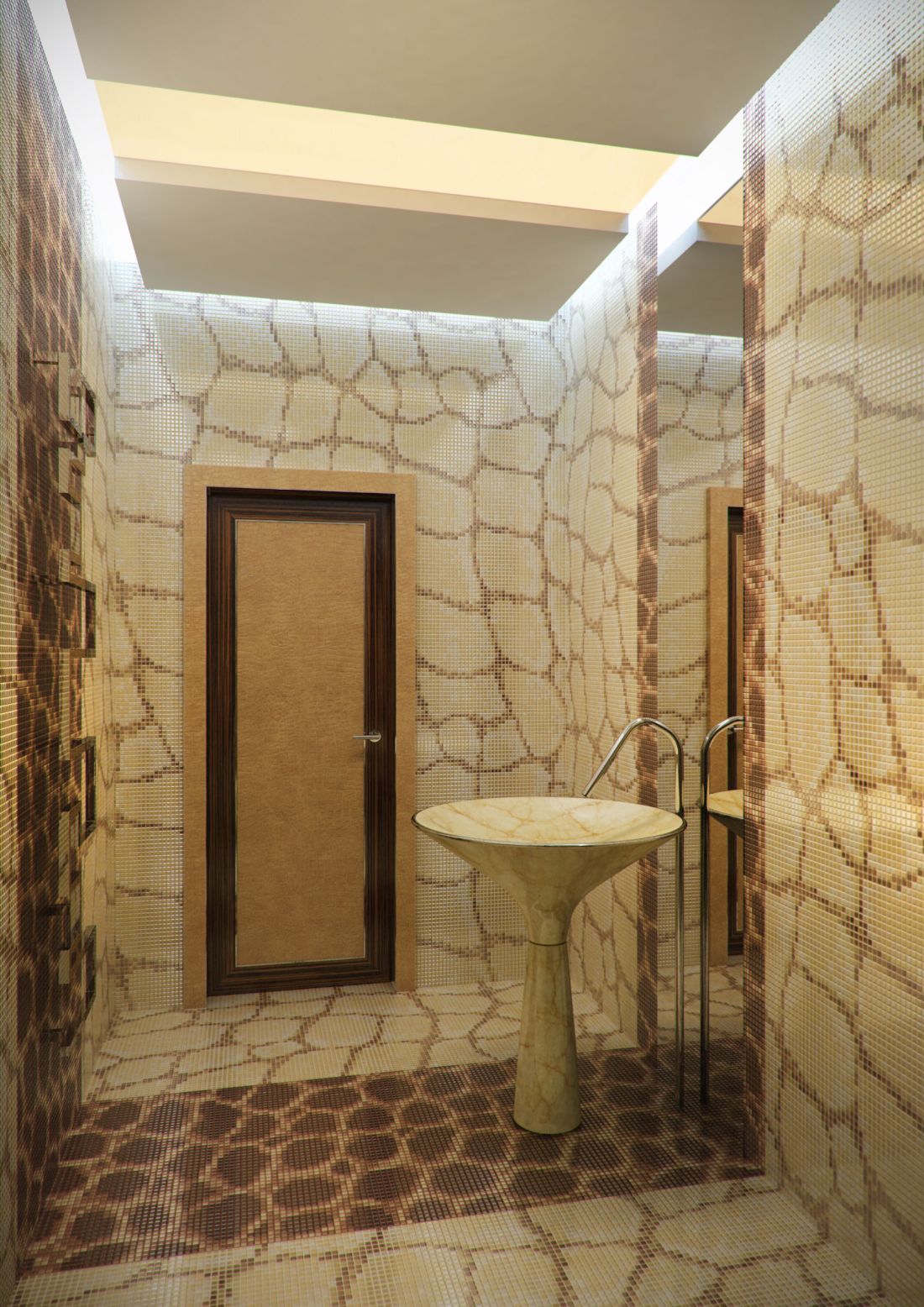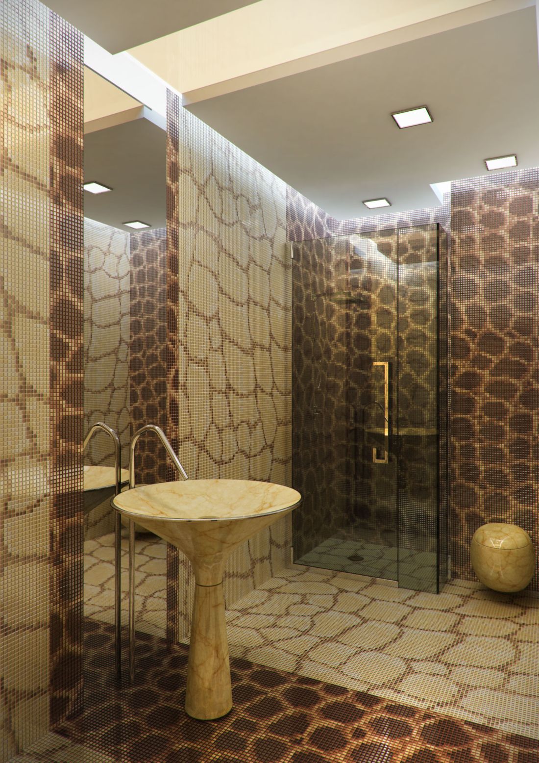 Выбранную тематику дизайн-проекта продолжает оформление кухонных фасадов и дизайн санузла: характерный рисунок здесь создает мозаика бежевых и темно-коричневых оттенков.