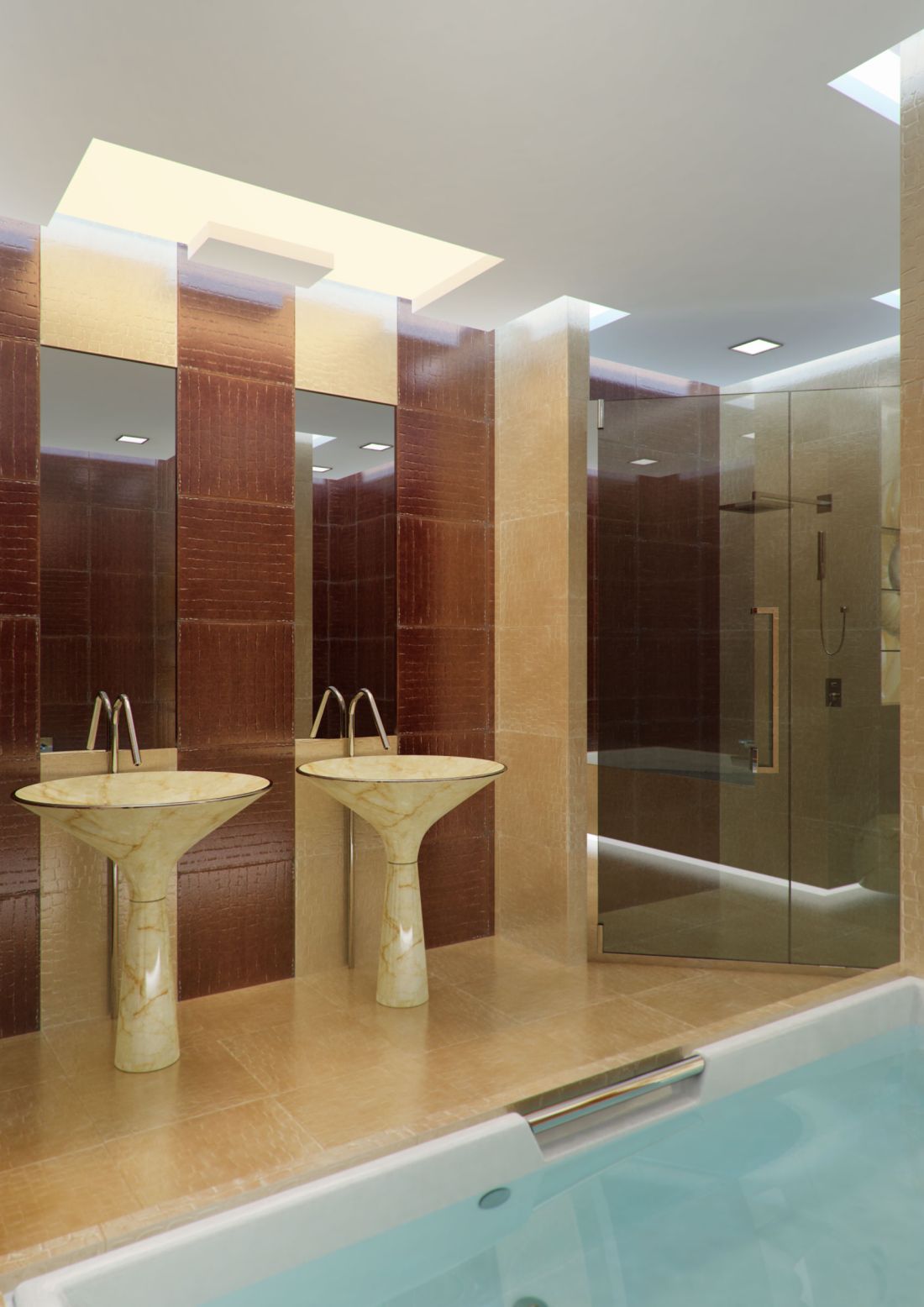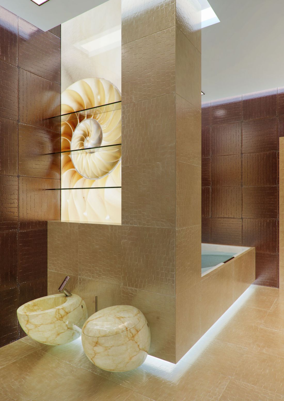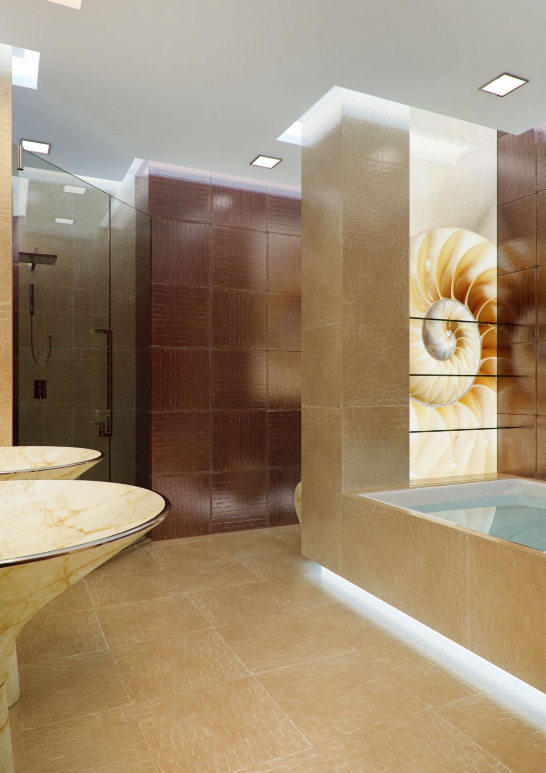 Мебель с рисунком кожи рептилии украшает и дизайн спальни. Изголовье отделано кожаными панелями с имитацией, как и стена позади кровати, декорированная рядом вертикальных зеркал. Во второй спальне зона кровати выделена на полу таким же приемом, как место для отдыха в гостиной.