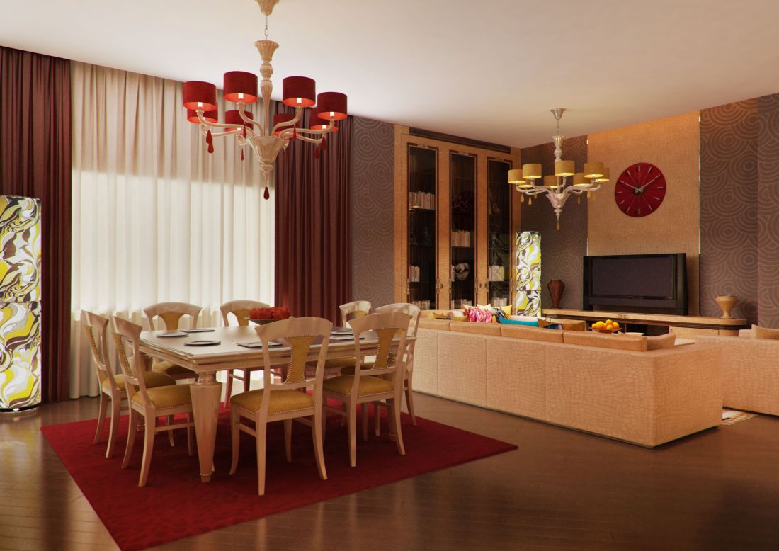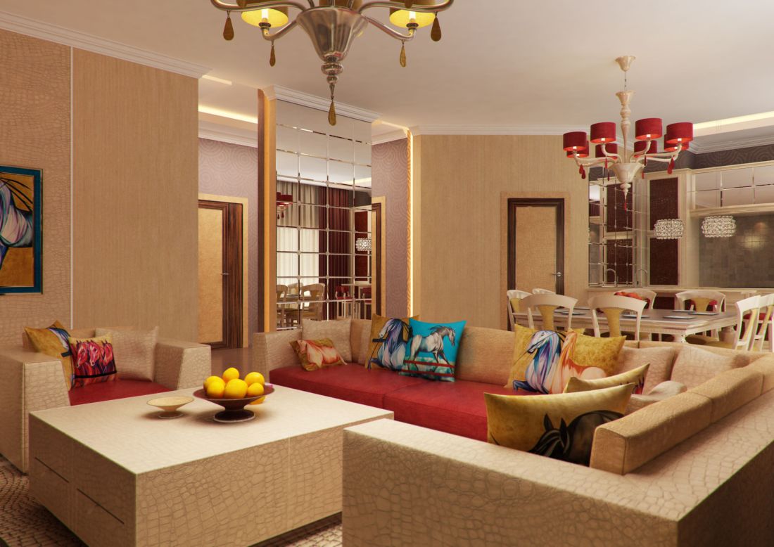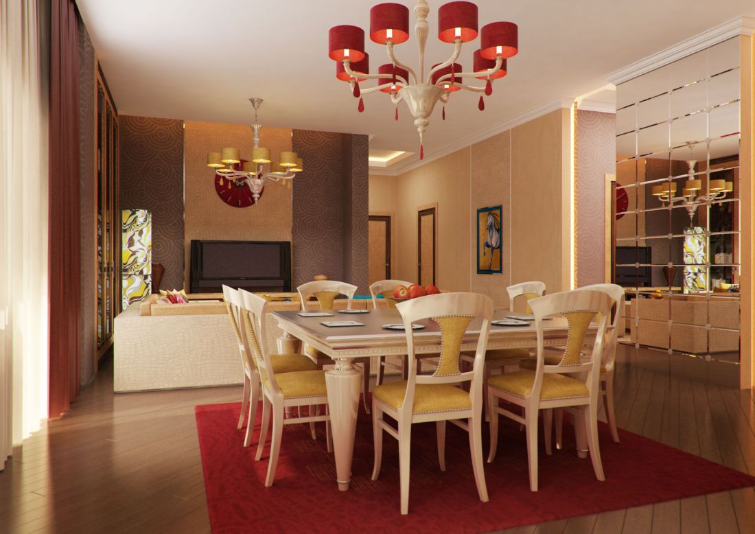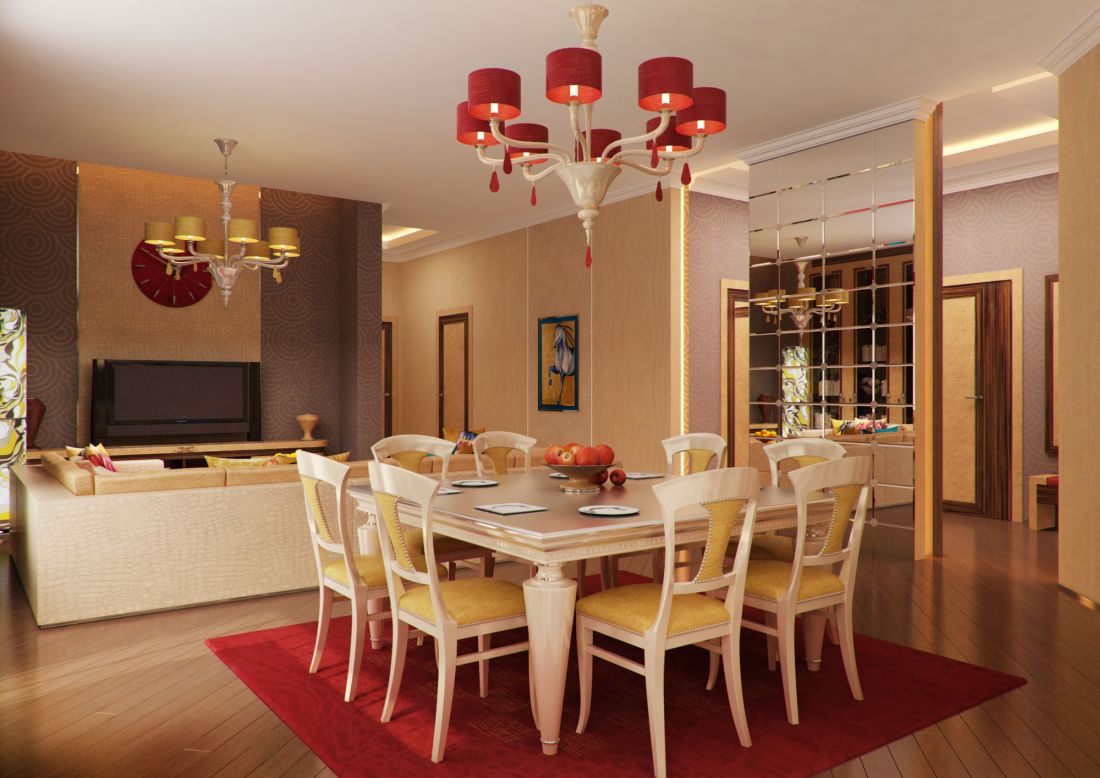 Отдельные яркие детали – текстиль, абажуры светильников, картины, циферблат часов – насыщают дизайн интерьера трехкомнатной квартиры красками. Эффект усиливается вдвойне, благодаря расположенной по центру прохода из гостиной зеркальной перегородке.